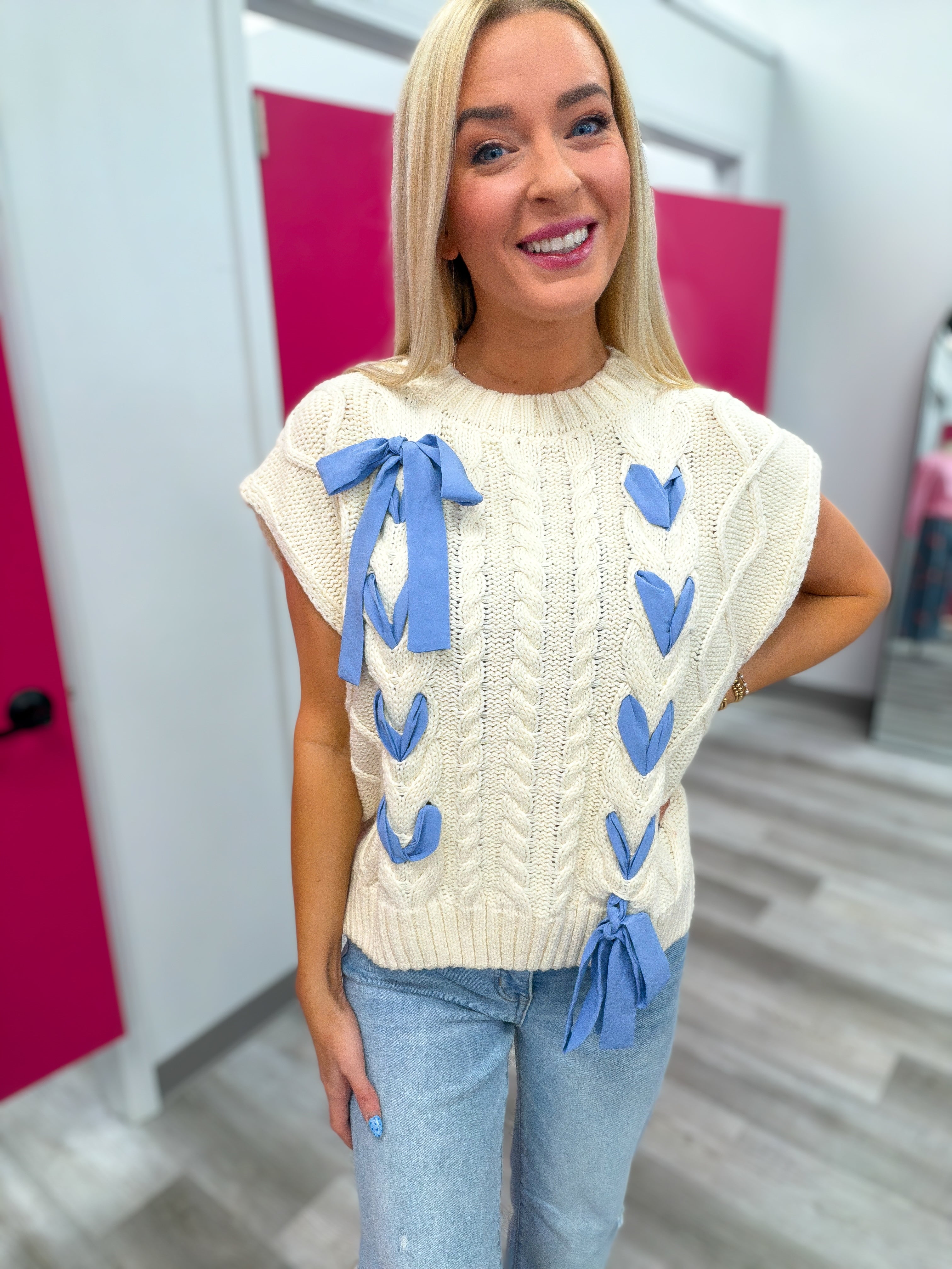Solid cable knit muscle sweater knit top featuring ribbon lace detail at front. Unlined. Knit. Non-sheer. Lightweight.