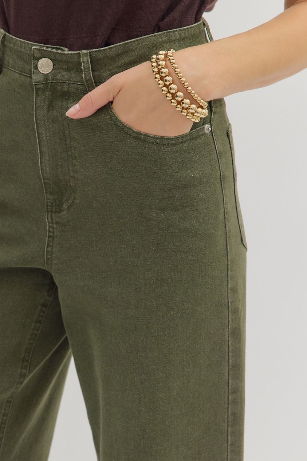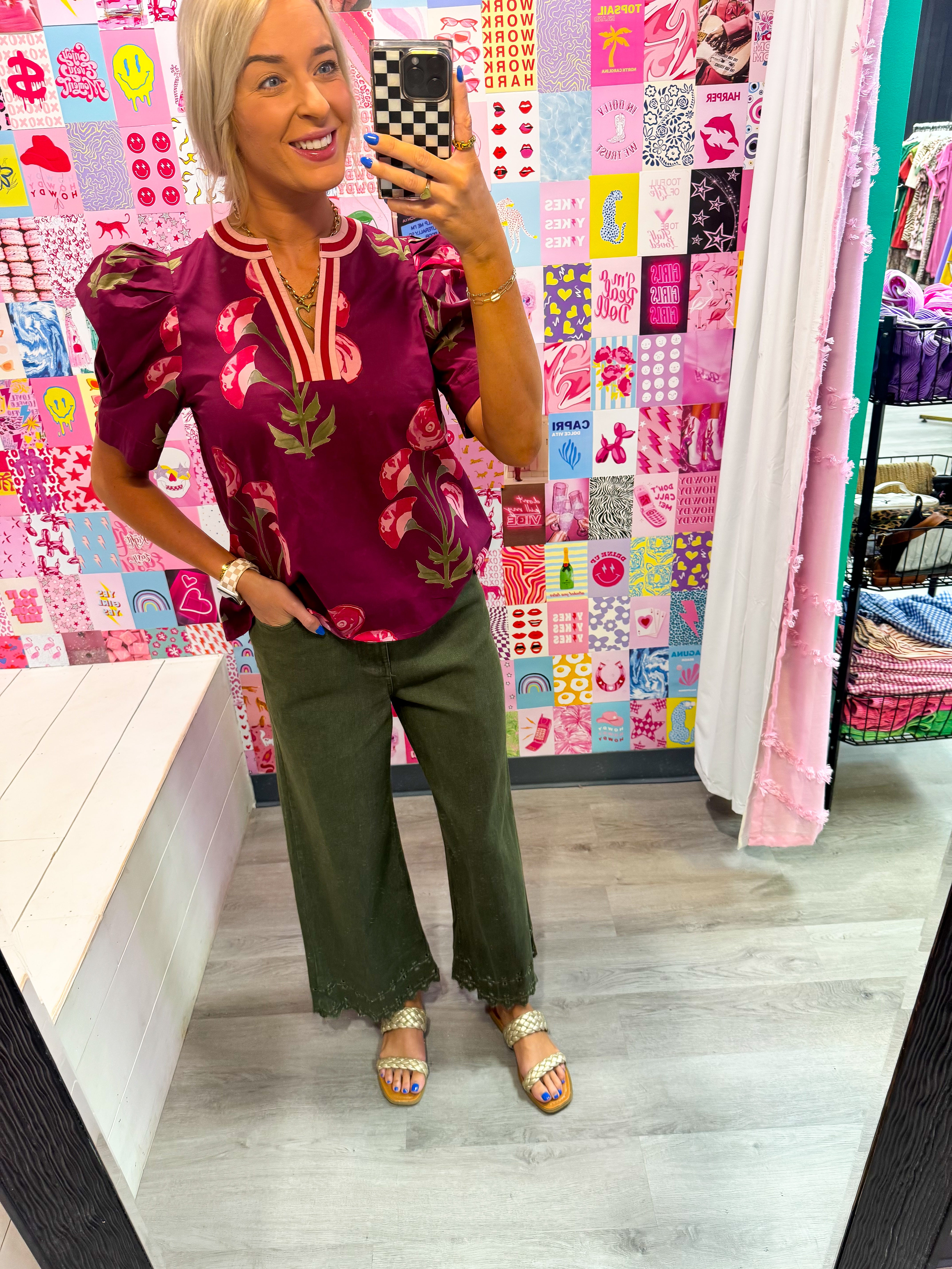 High waist ankle length pants featuring floral embroidered border at hem. Classic button fly-front zipper closure. Classic jean pockets. Unlined. Woven. Non-sheer. Lightweight.