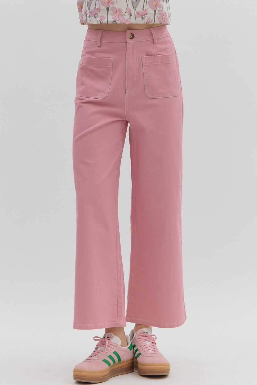 Solid high-waist button fly-front zipper closure pants featuring exposed stitch detail. Patch pockets at front and back. Unlined. Woven. Non-sheer. Lightweight.