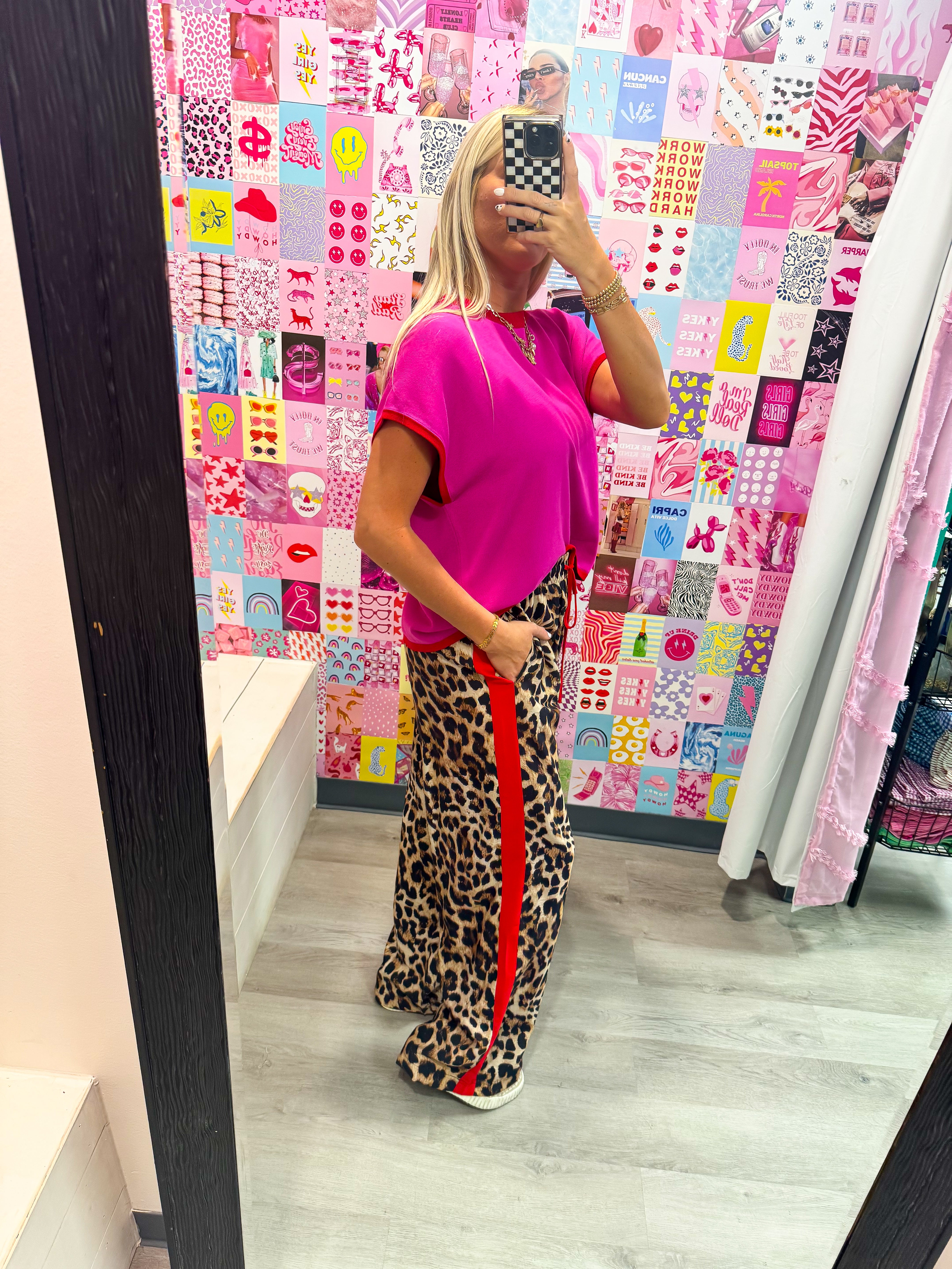 Leopard printed pants featuring an elastic waistband with a red drawstring, two side hip pockets, red stripes going down the sides for detail and is a straight leg design.