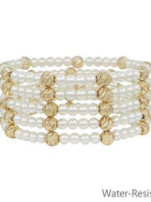 Water Resistant Set of 4 Gold 10MM and 4MM Pearl Beaded Stretch Bracelets