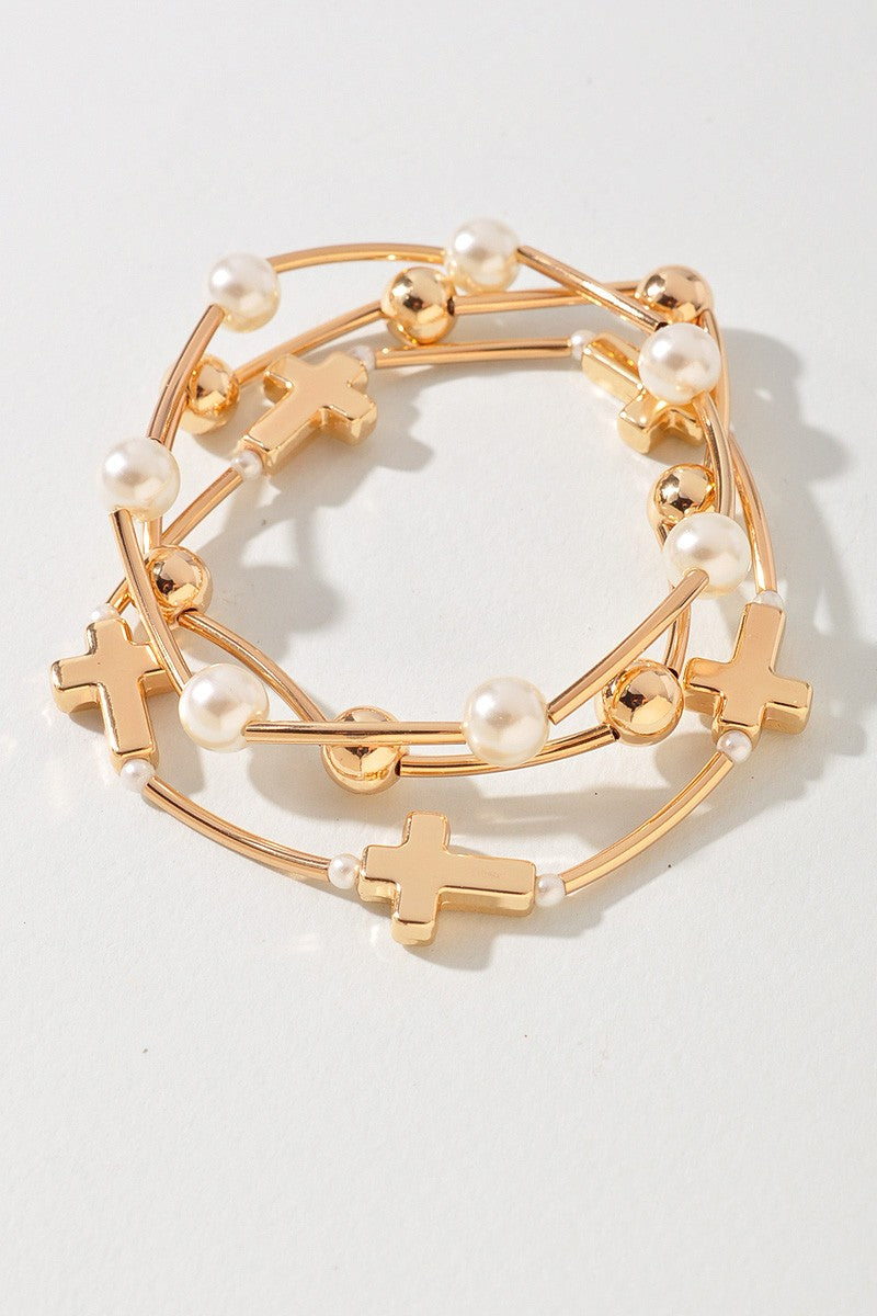 Metal Pearl Cross Stretch Bracelet Set