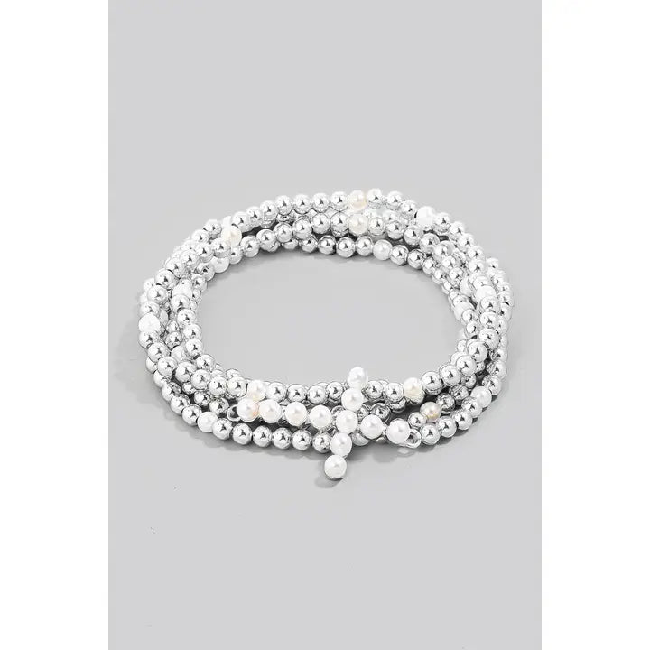 Silver Pearl and Beaded Cross Set of 5 Stretch Bracelets