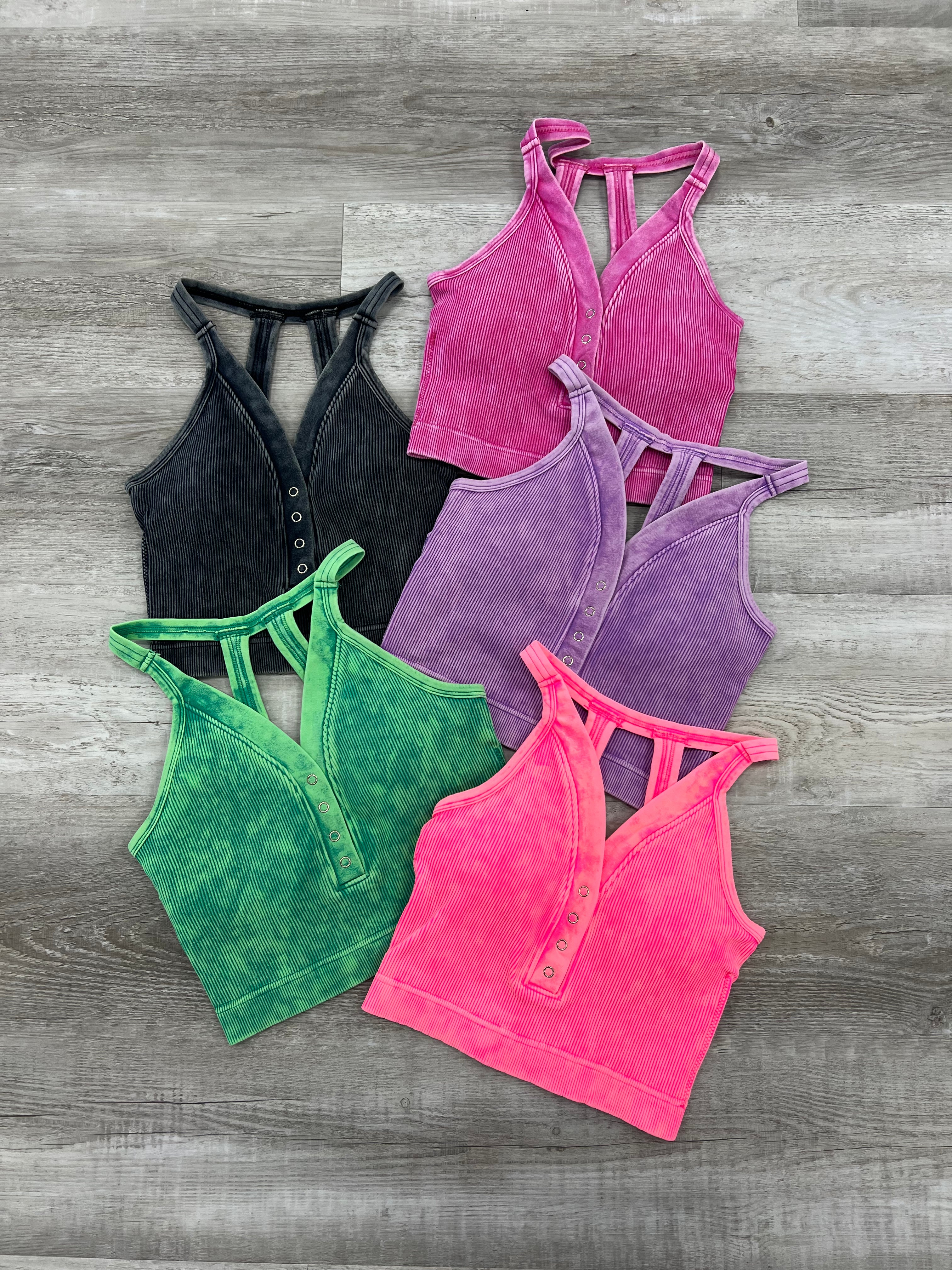 WASHED RIBBED CROPPED ACCENT BUTTON V-NECK TANK TOP