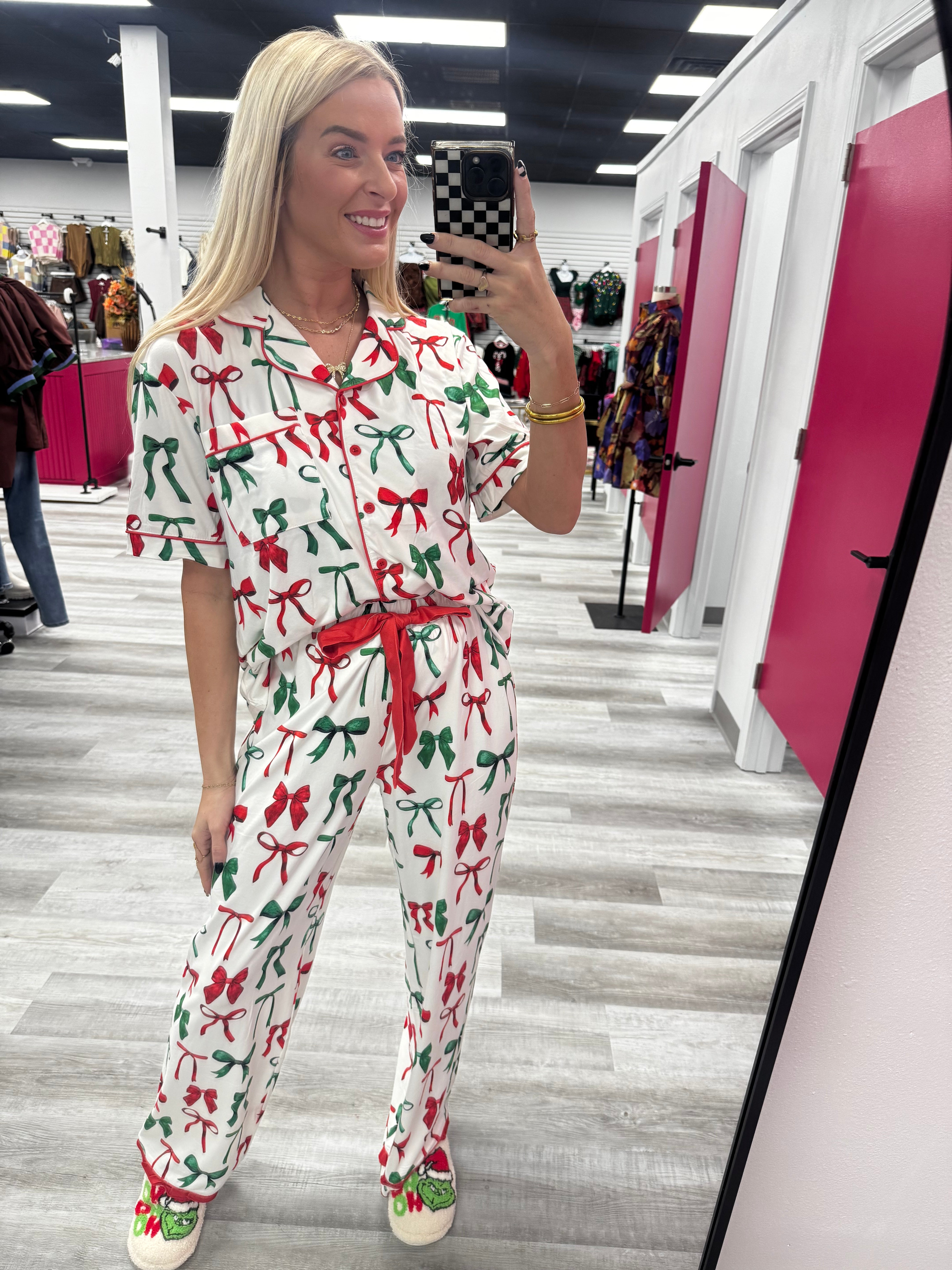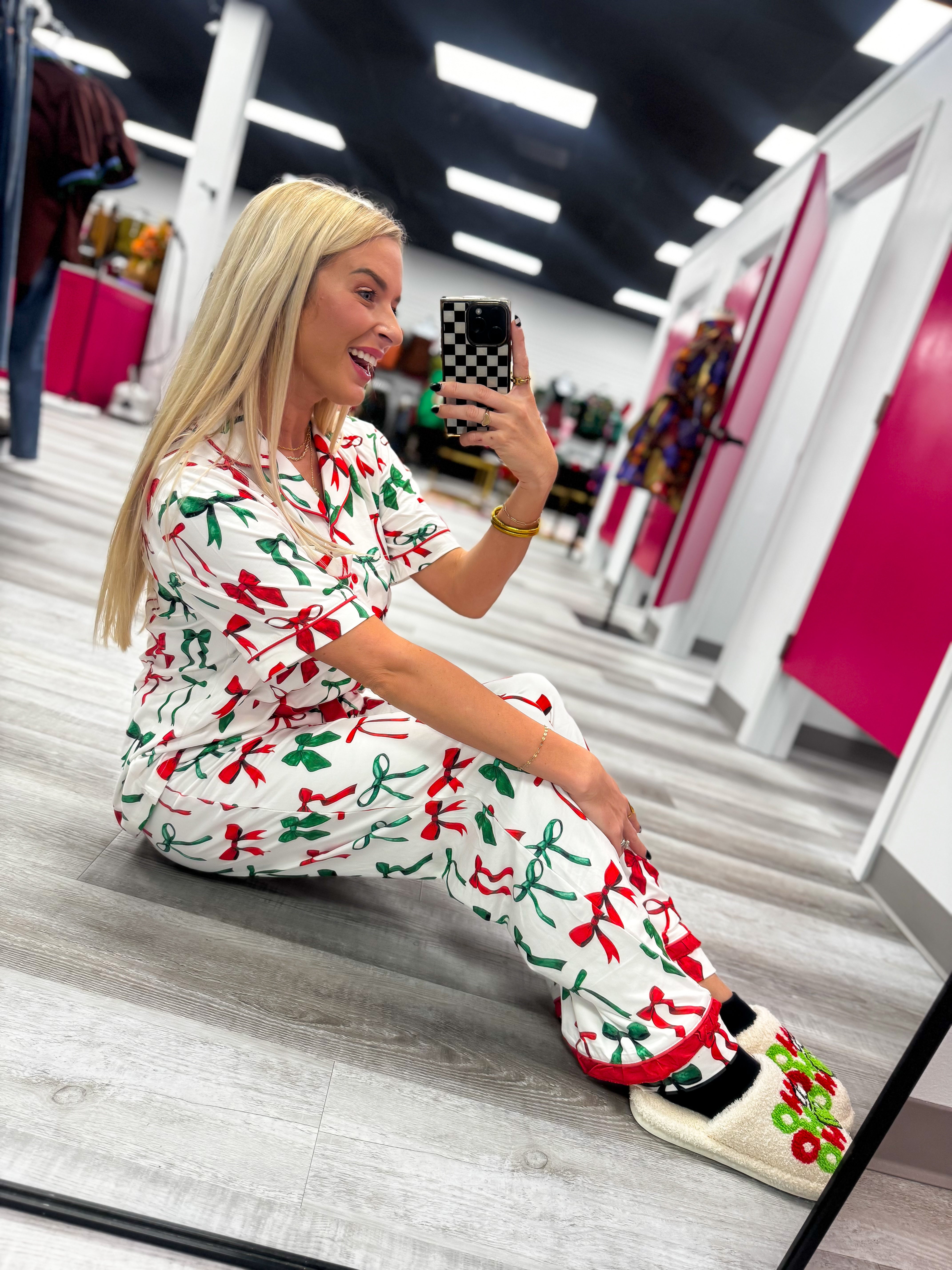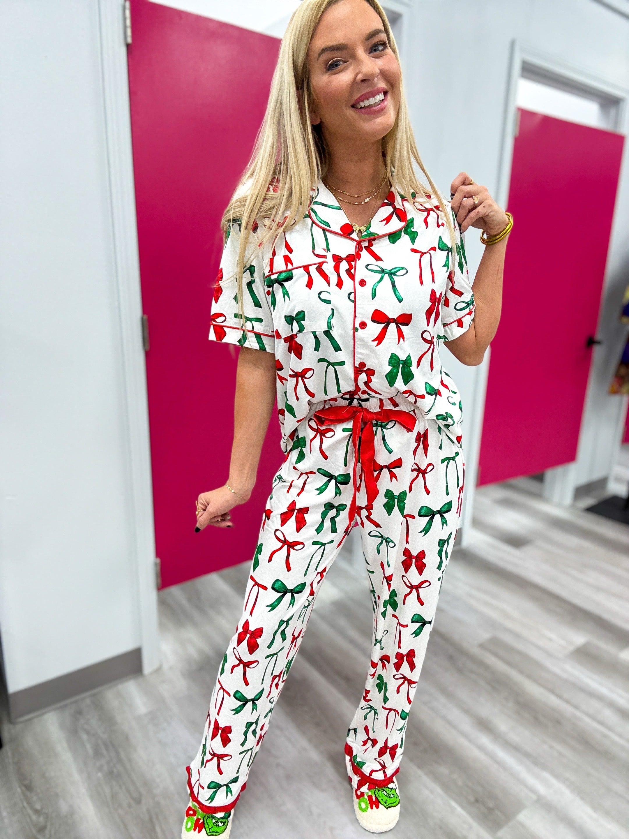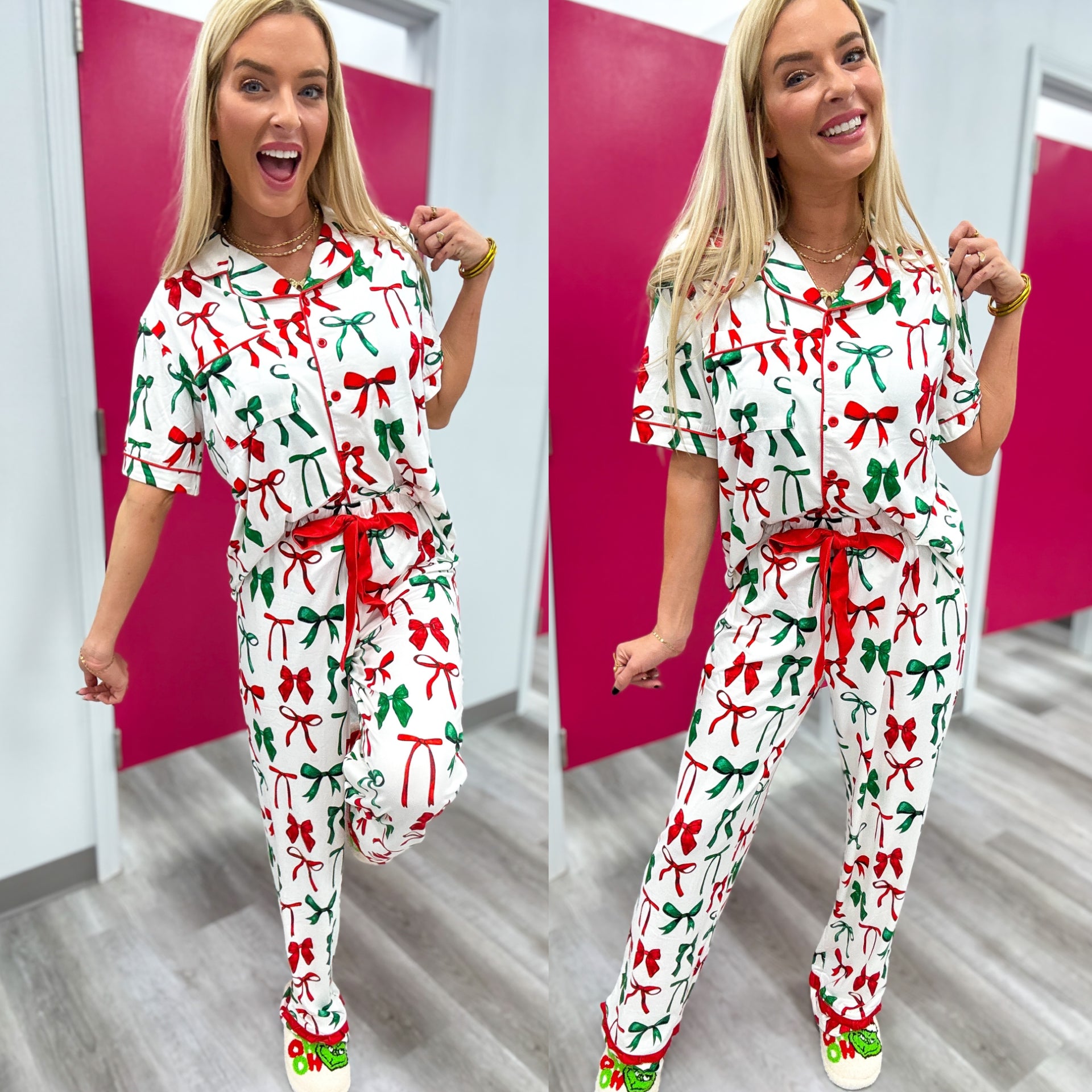 The Midnight Bow Christmas Edition Ruffle Pajama Set features a short-sleeve top and long pants adorned with cheerful red and green bows. Perfect for cozy nights, it captures the fun and festive spirit of the holiday season.