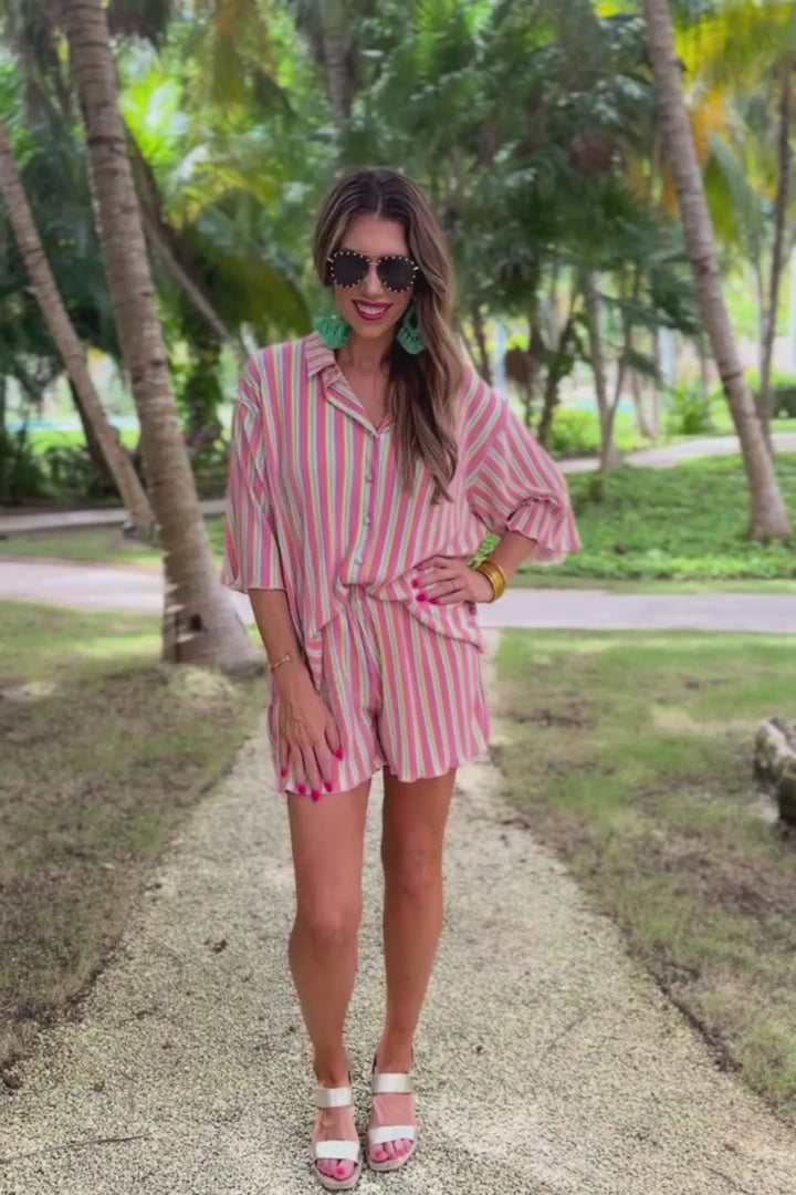 Get ready for a dreamy day in our Dreamy Daze Pleated Set! This fun and colorful set features half sleeves, lettuce hemlines, and a button up design with an elastic waistband for a comfortable fit. Perfect for a playful and stylish look.