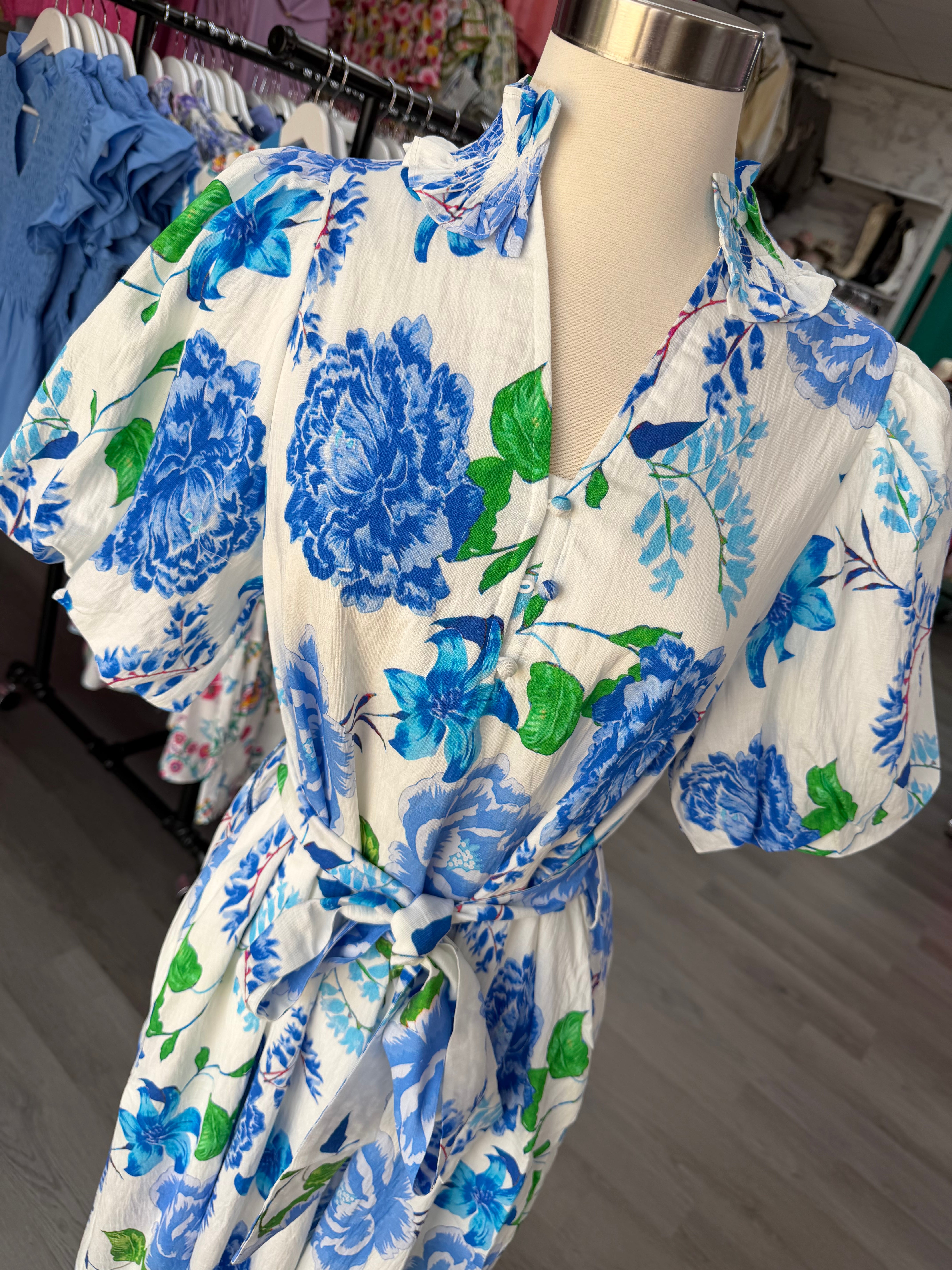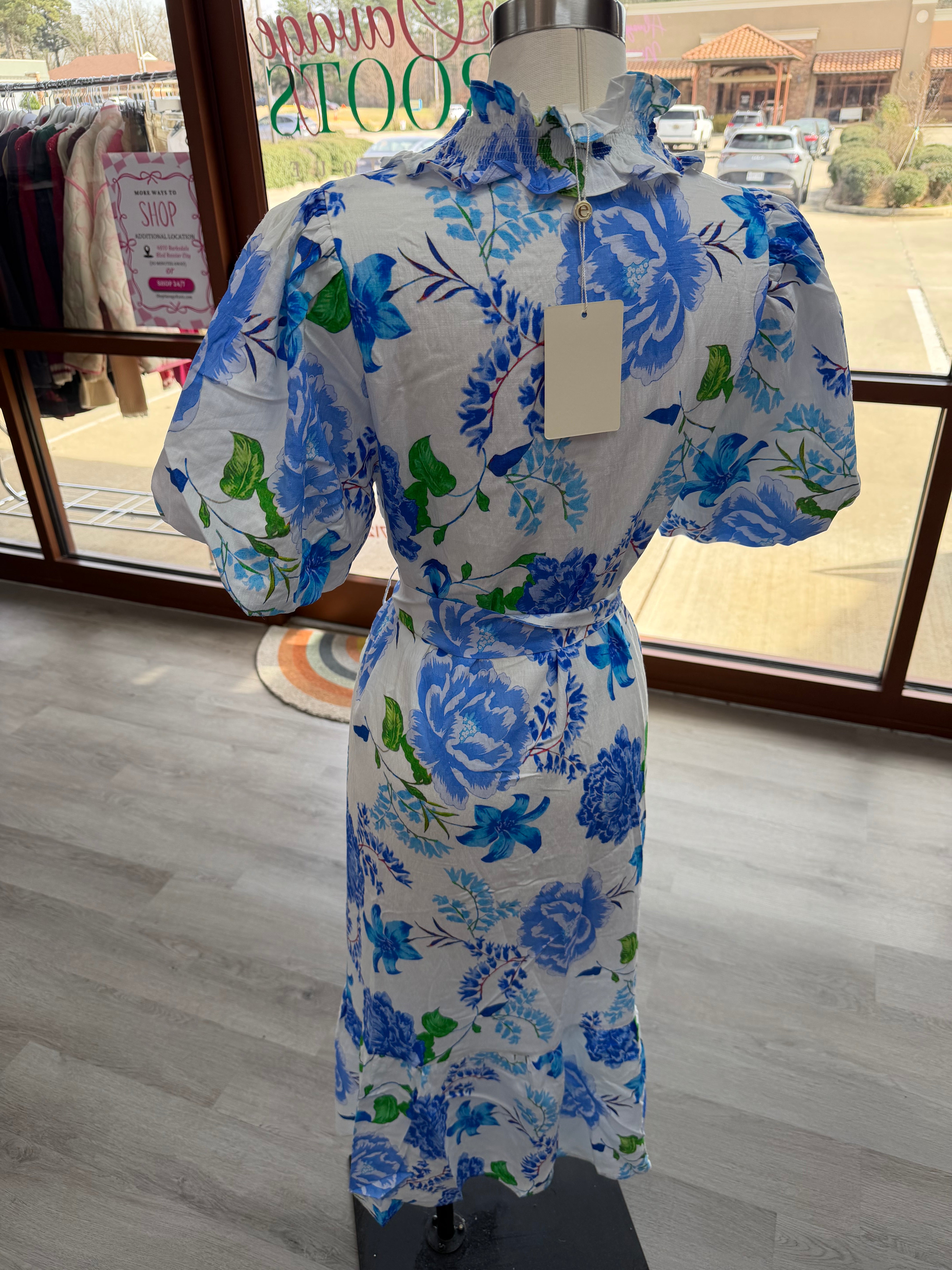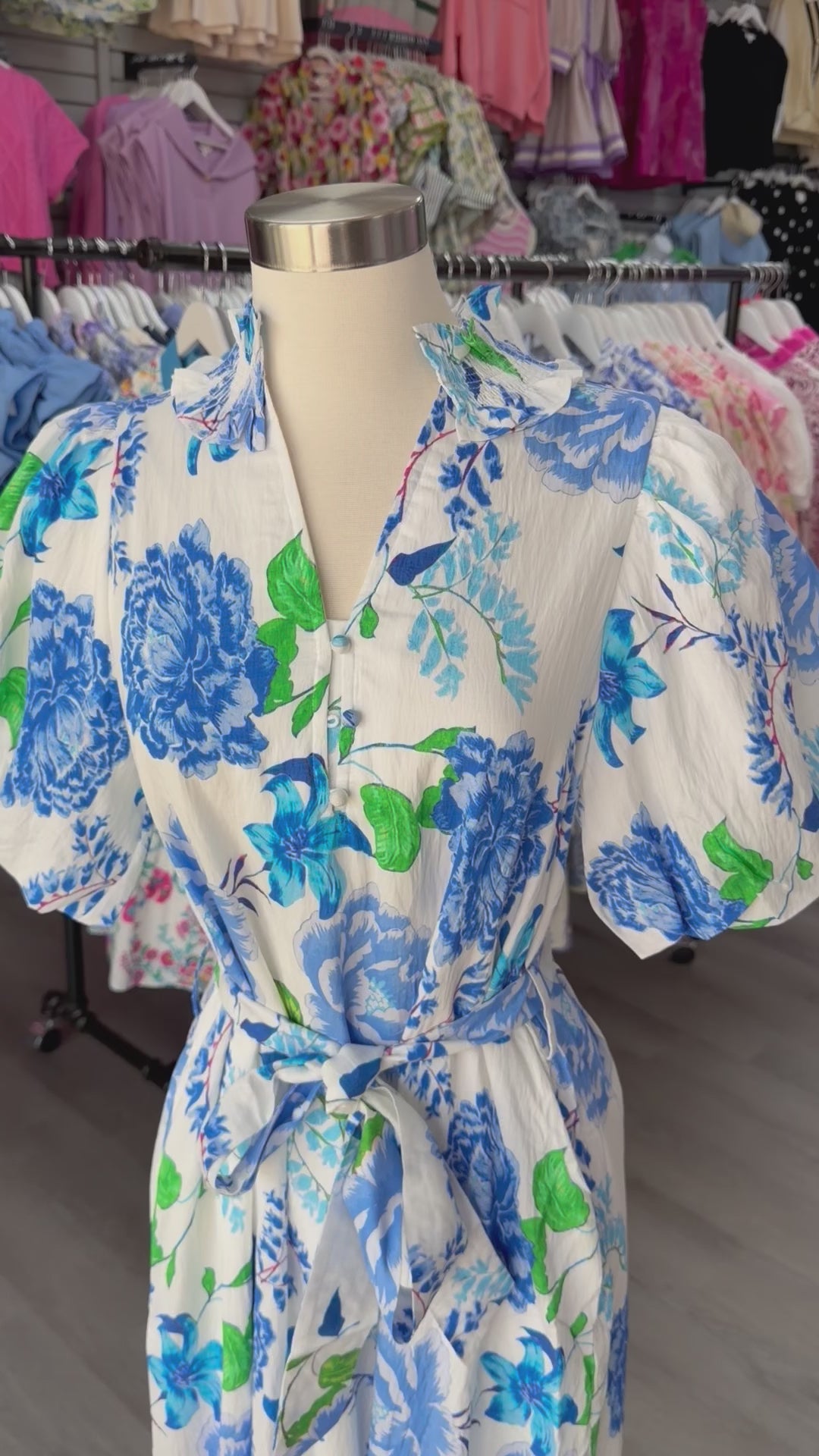 Featuring a soft ivory base with bold blue florals and pops of fresh green, this midi dress is the kind you’ll reach for again and again. The flattering v-neckline and structured collar detail give it that polished feel, while the flowy skirt keeps it comfortable and easy to move in.