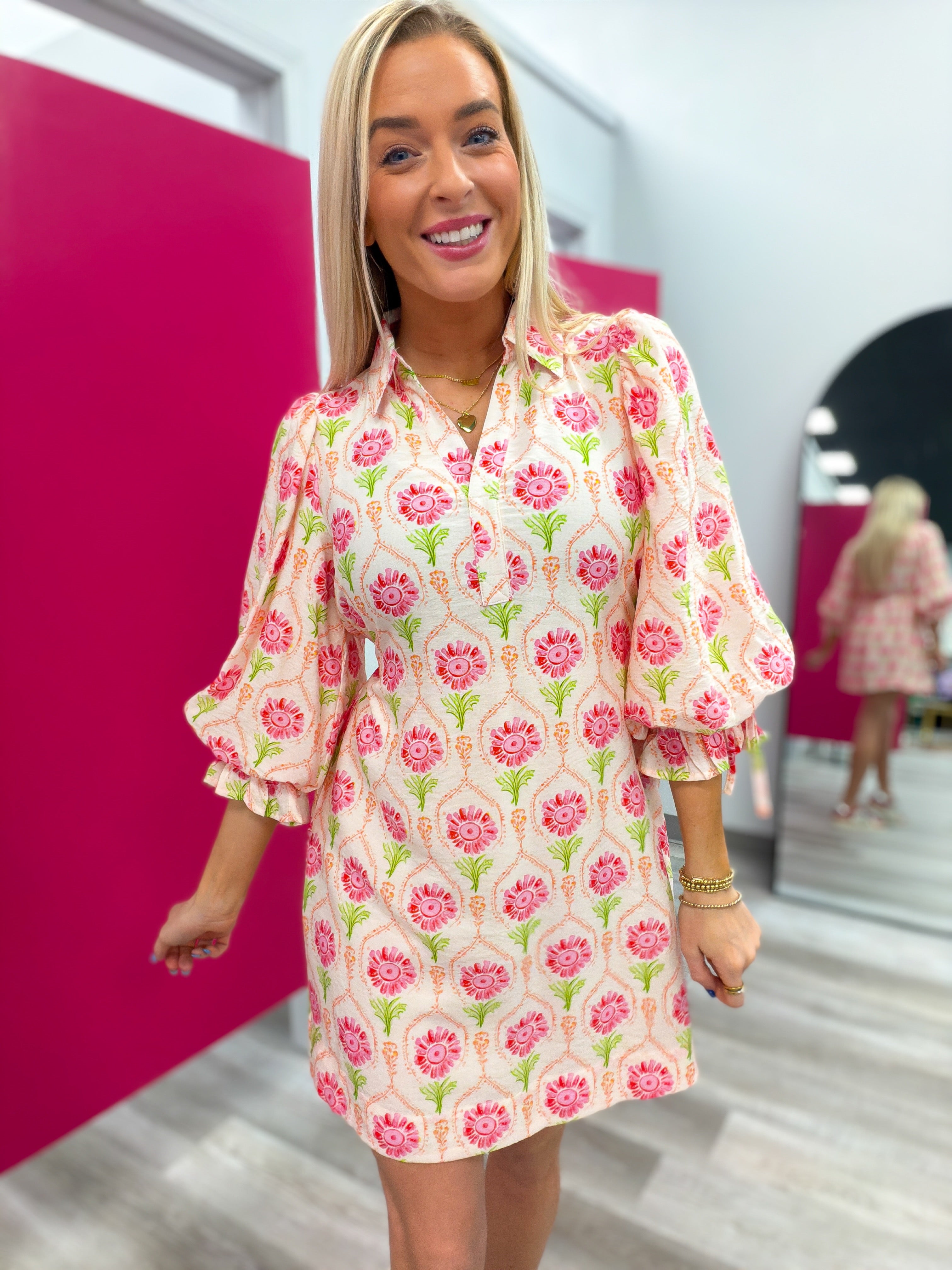 This dress is such a standout in the prettiest pink print. The relaxed, easy silhouette keeps it comfortable and effortless, while the statement sleeves with adjustable tie details add that extra boutique touch. Wear it loose and flowy or cinch the back tie for a little more shape — either way, she’s a head-turner. Perfect for showers, brunch, date nights, or any event where you want to feel extra cute.