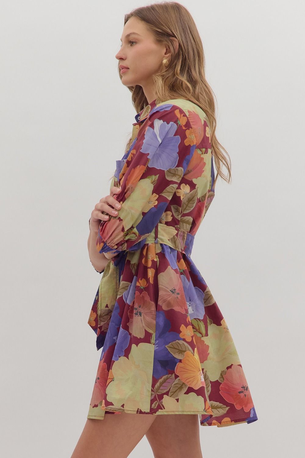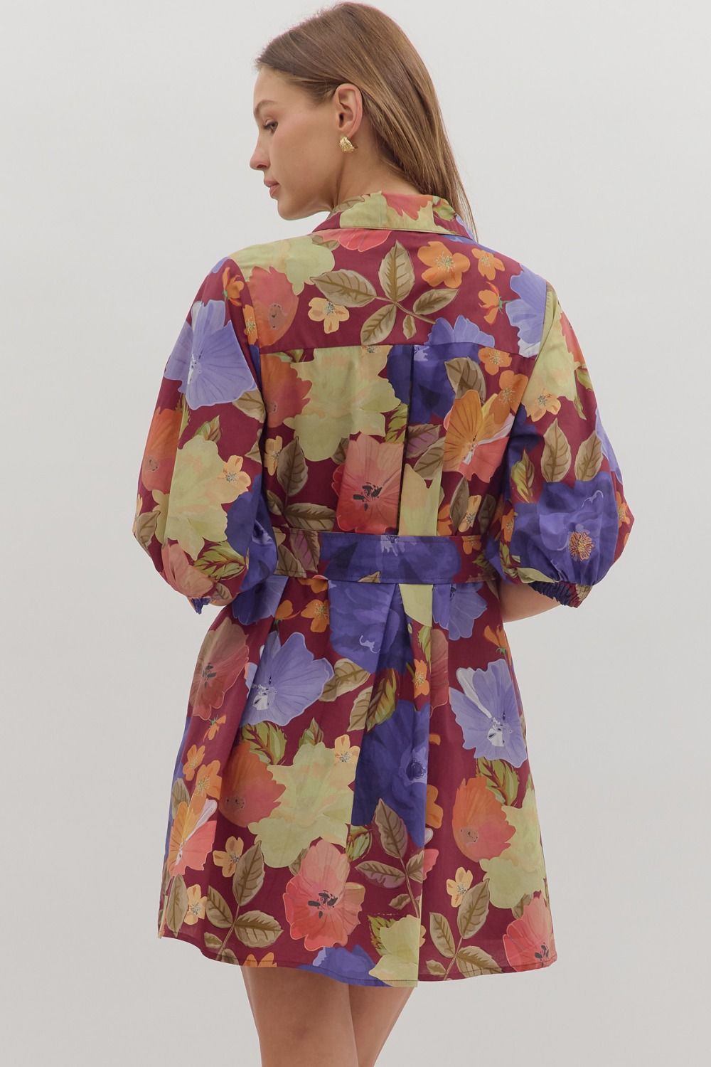 Floral print puff sleeve mini dress featuring front chest pocket and self-tie waist. Button closure at front. Side pockets. Lined. Woven. Non-sheer. Lightweight.