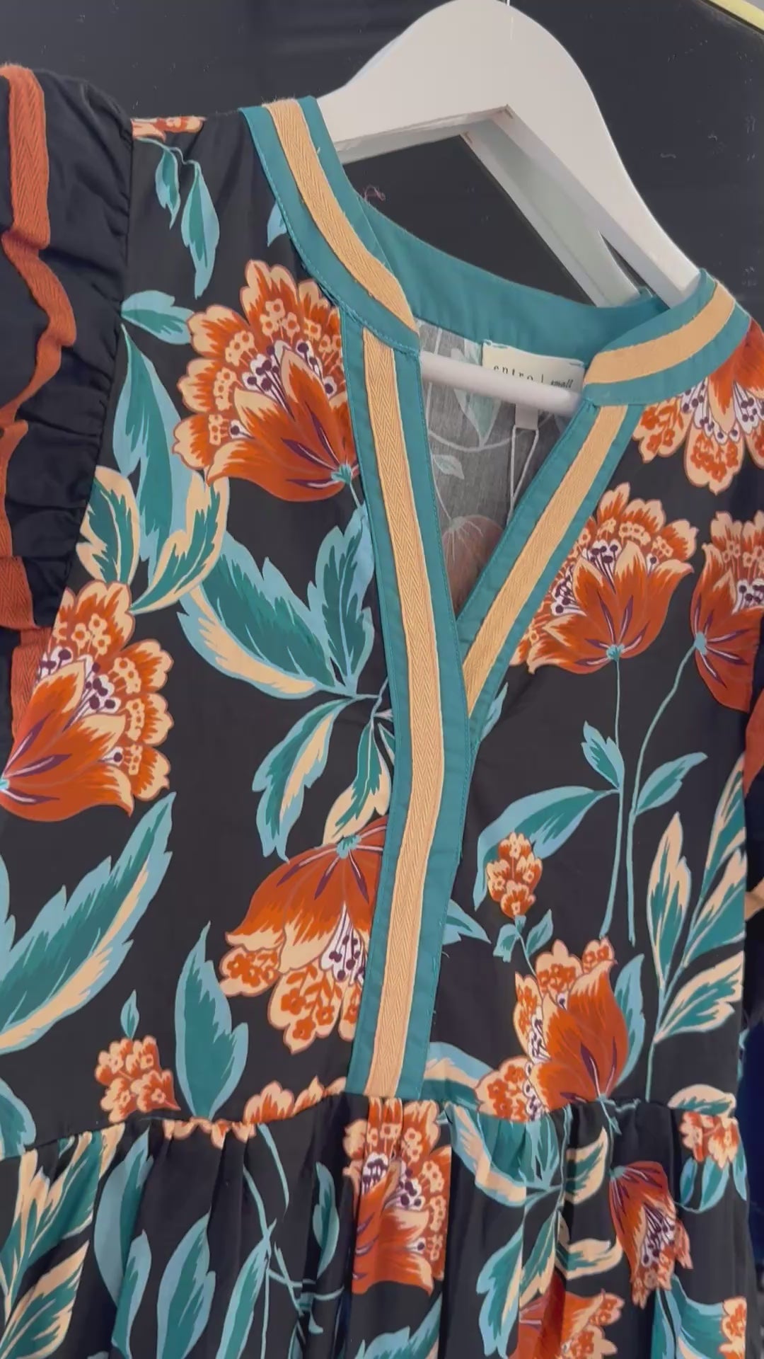Floral print midi dress featuring contrast accent binding detailing flutter sleeves and hem. Pockets at sides. Lined. Woven. Non-sheer. Lightweight.