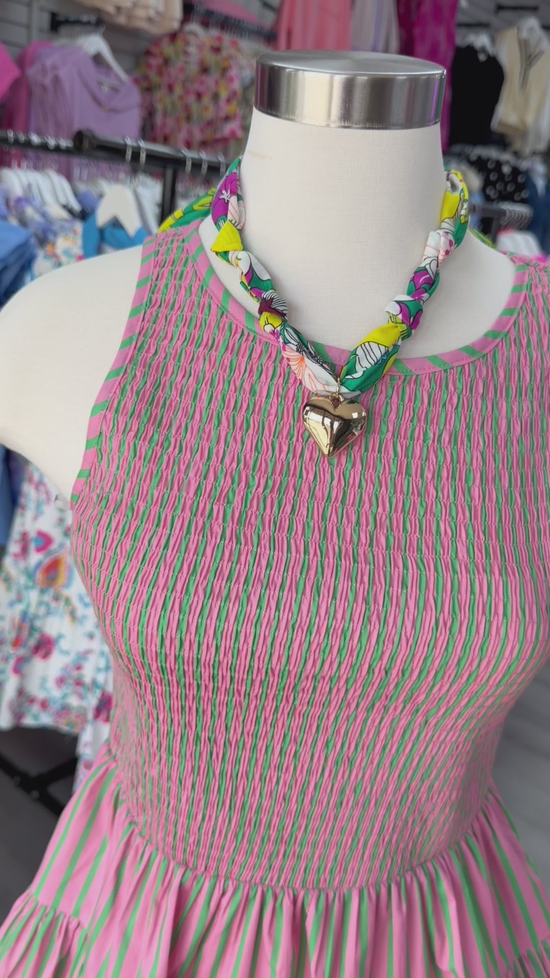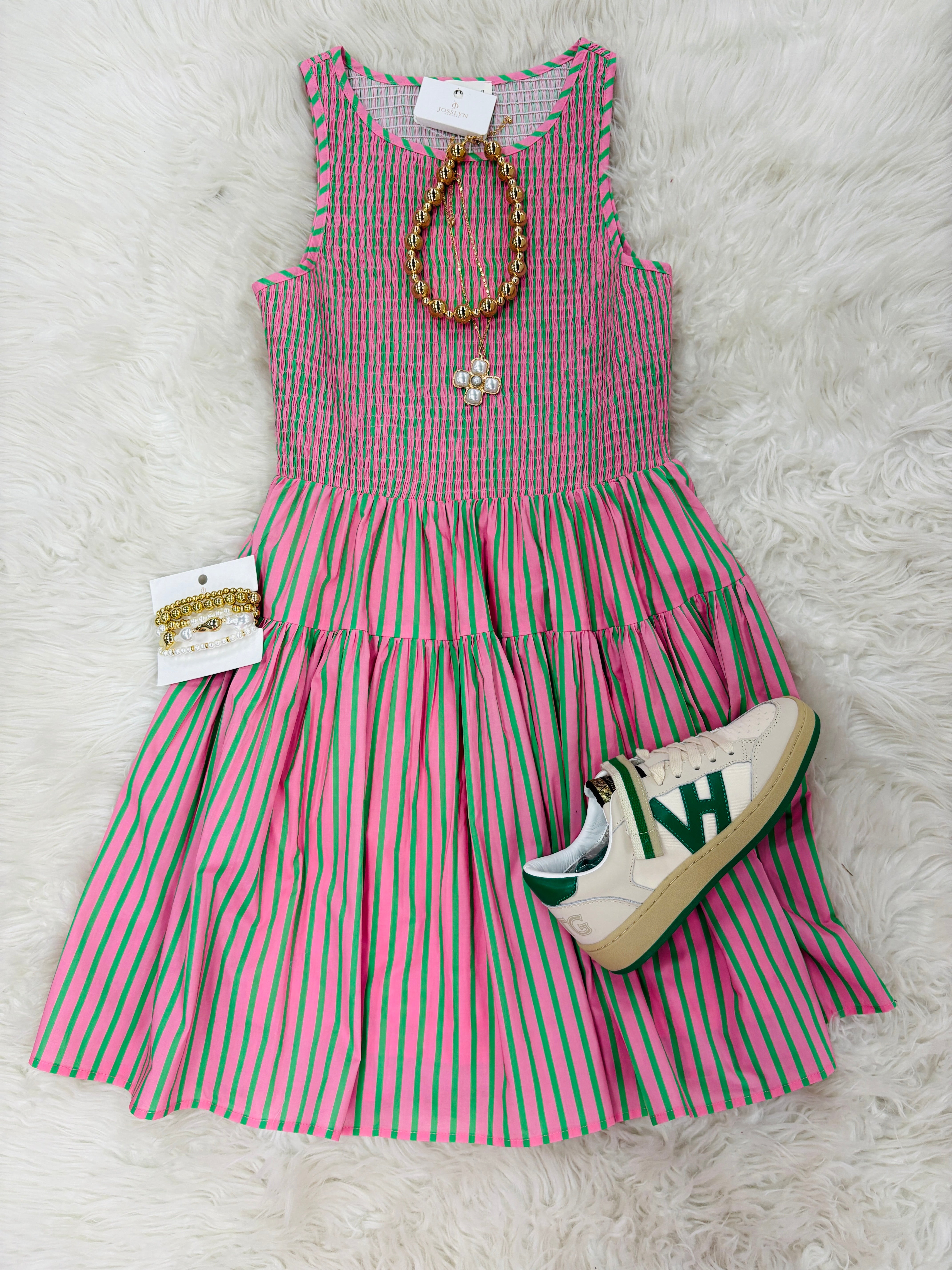 The smocked bodice gives you that flattering, stretchy fit we LOVE (hello comfort + shape 🙌), and the pink + green stripe combo is bold in the best way. She’s sweet, she’s playful, and she does not blend in.