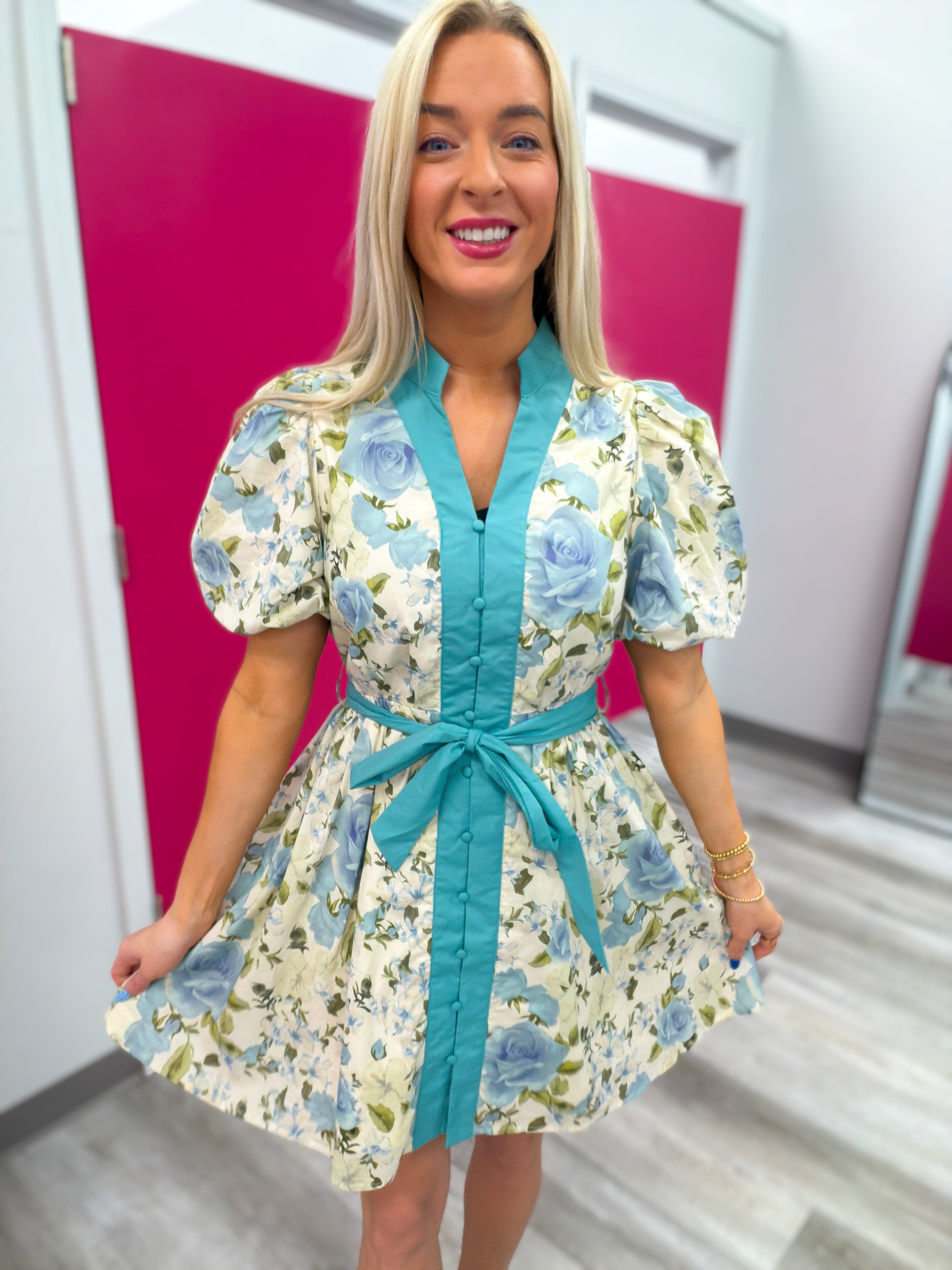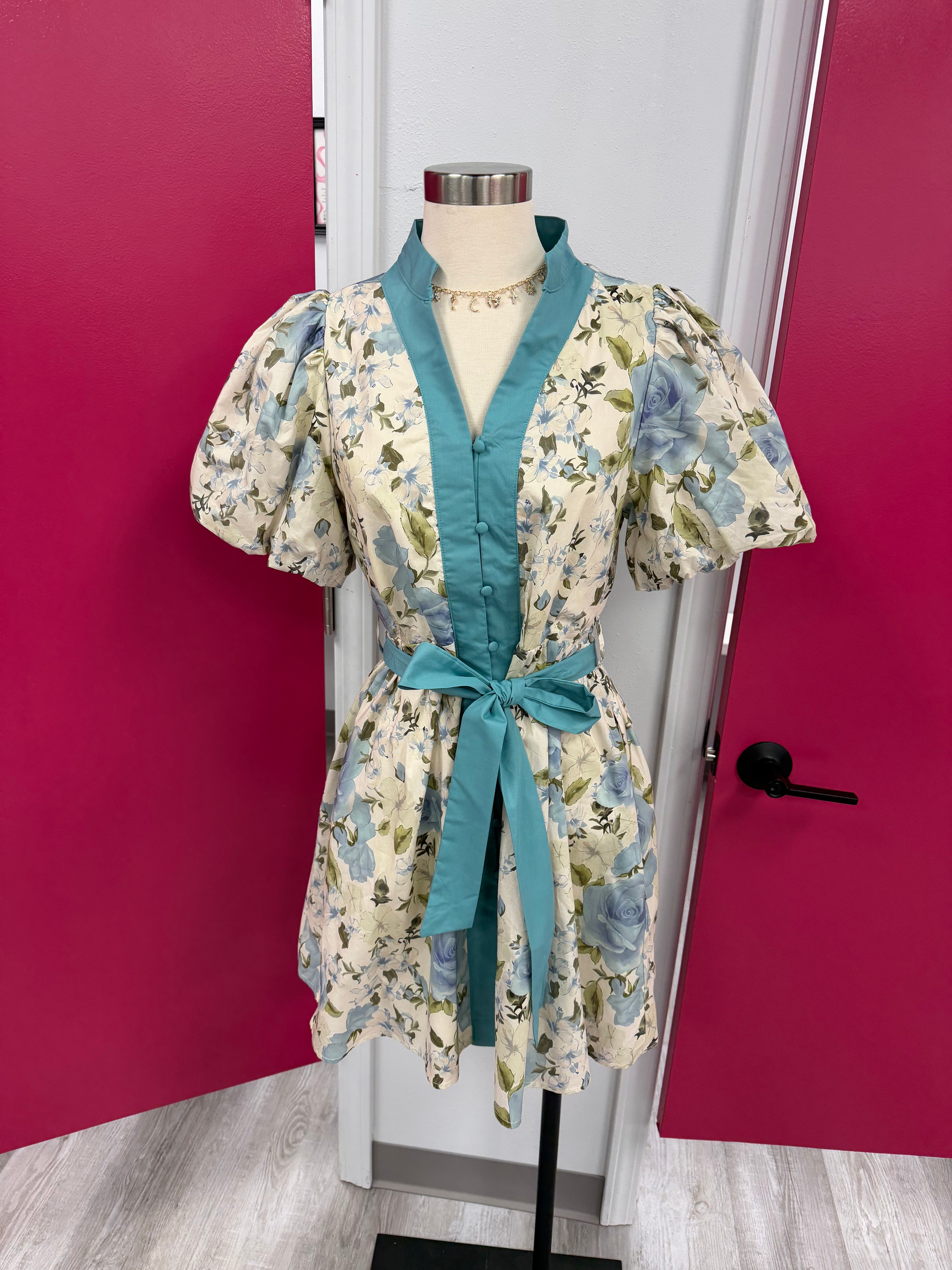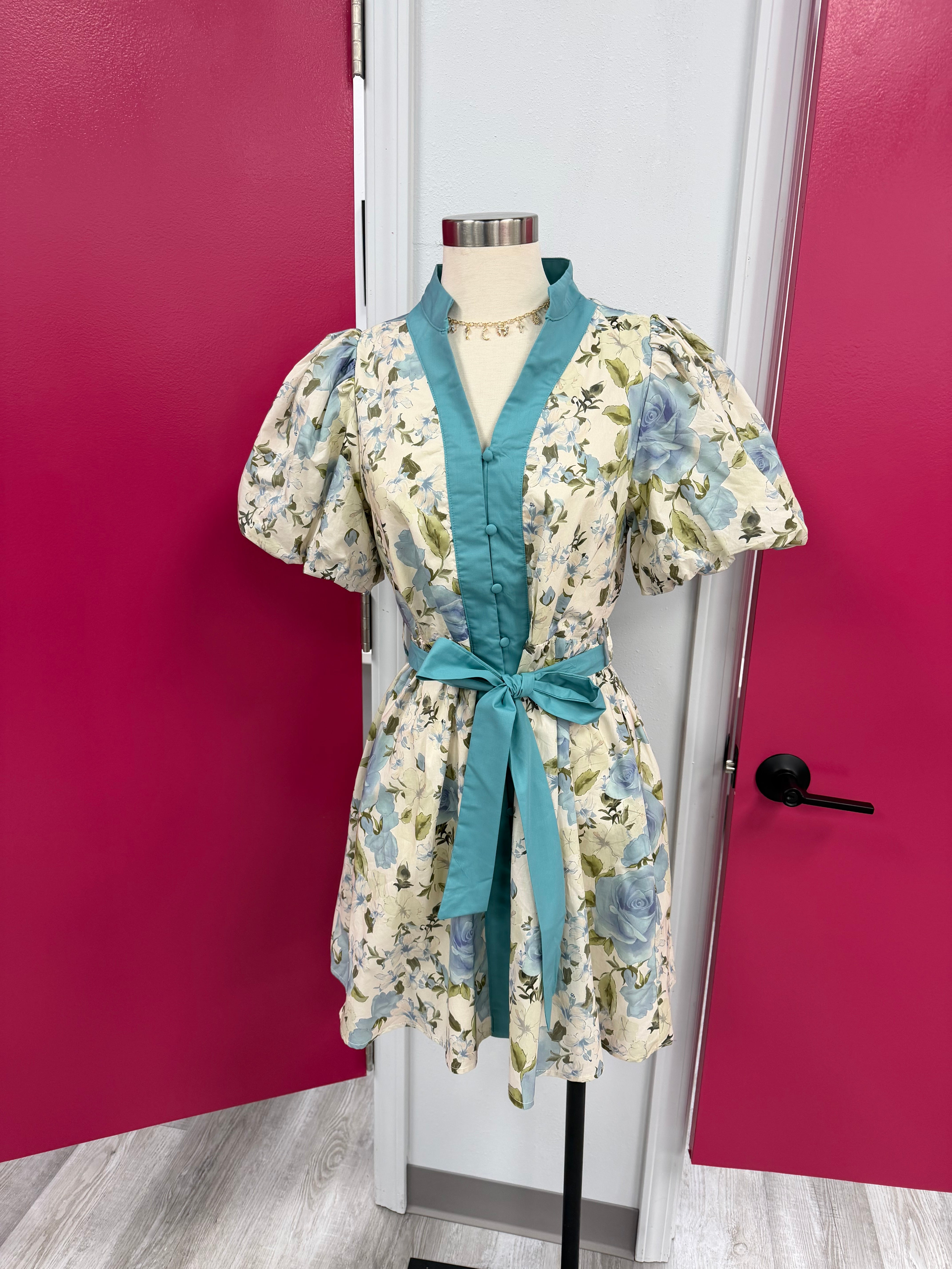 Featuring a soft floral print in calming seafoam and neutral tones, this flowy mini dress is designed with puff sleeves, a flattering tie-front waist, and a lightweight feel that moves beautifully with you. Easy, breezy, and oh-so flattering—this one is made for spring days and summer nights.