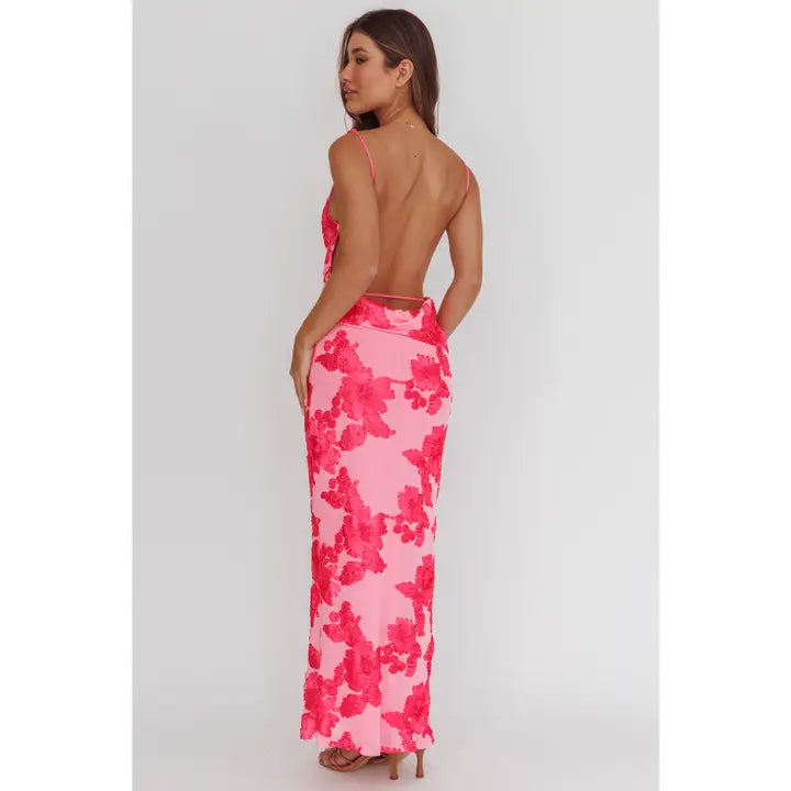 Turn heads in this stunning pink floral maxi that was made for your next special event. Featuring a soft blush base with bold floral embroidery throughout, this dress brings the perfect mix of feminine and statement-making. The fitted silhouette hugs in all the right places while the open back detail adds a touch of drama that we are obsessed with. Lightweight and elegant, it’s the perfect pick for weddings, formals, spring events, or any night you want to feel extra pretty.