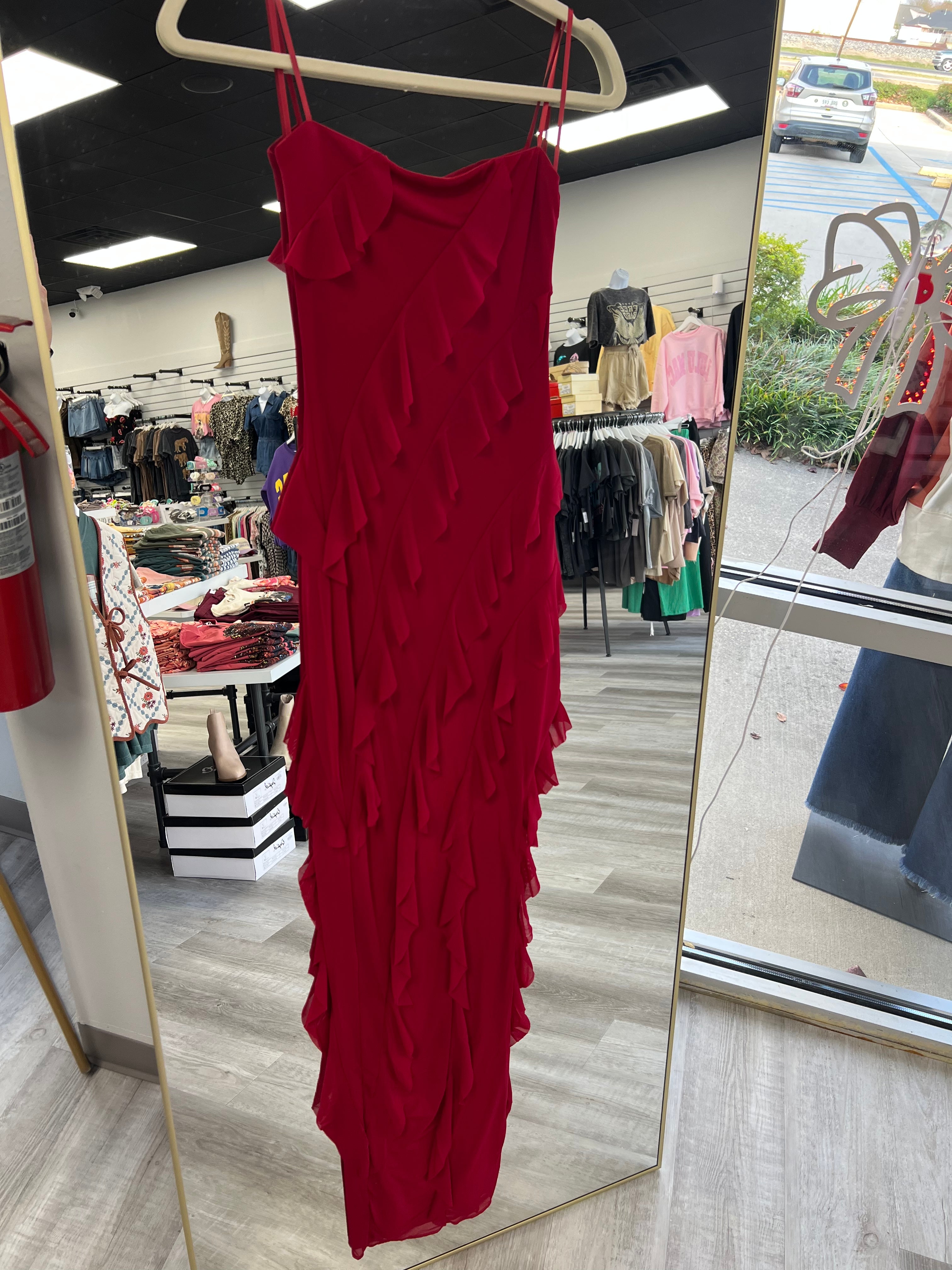 This Turning Heads Tube Ruffle Maxi provides a chic and stylish look. With its tube top design and bodycon fit, it is perfect for any body shape. The ruffle detail adds a touch of femininity, while the side slit and zipper offer ease of movement and a modern touch.