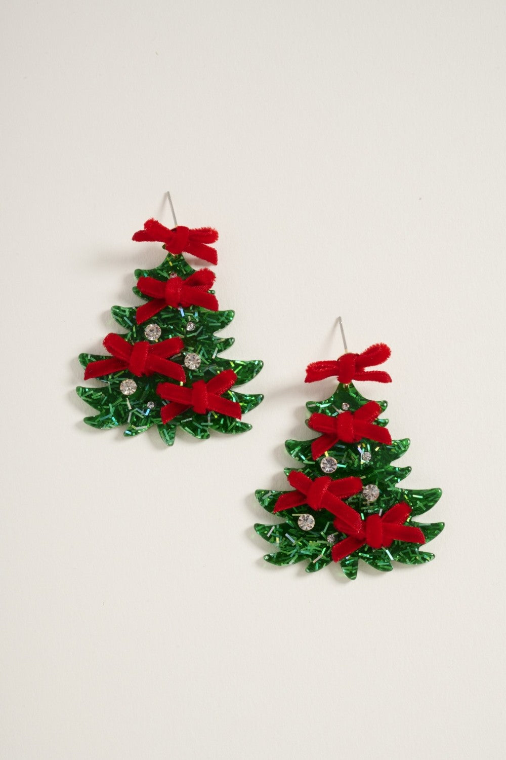 Christmas Tree W Bows And Rhinestone Post Earrings