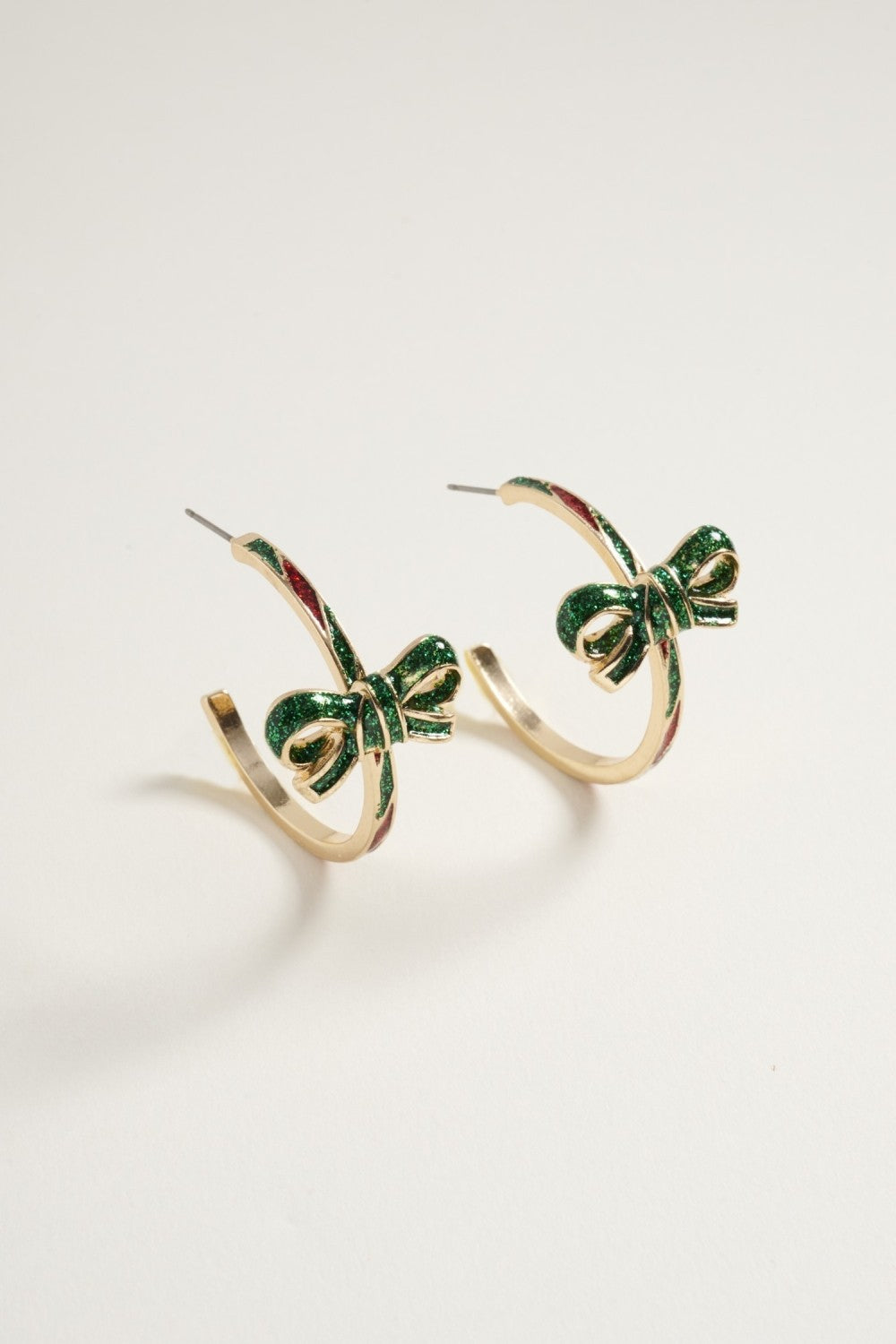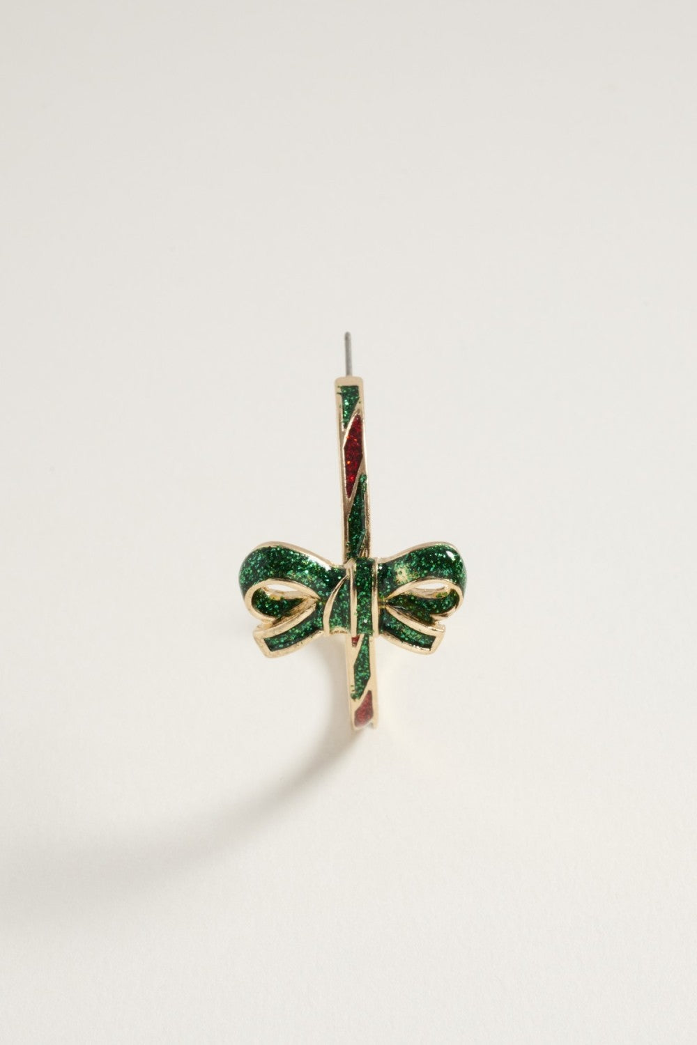 Green Glitter Candy Cane Pattern Ribbon Bow Hoop Earring