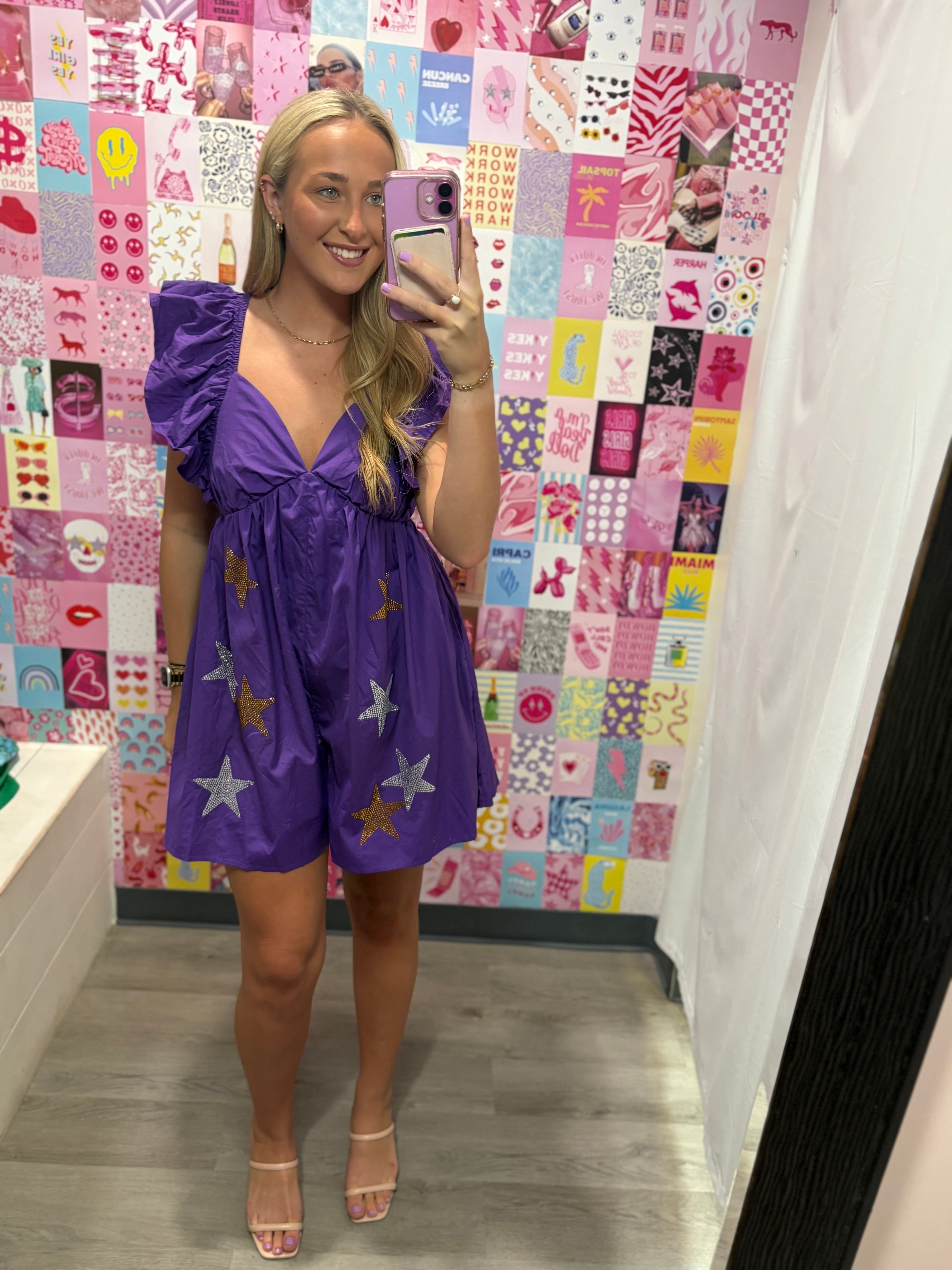 - Back tie - Rhinestone star embellishments - Ruffle shoulders - V-neck