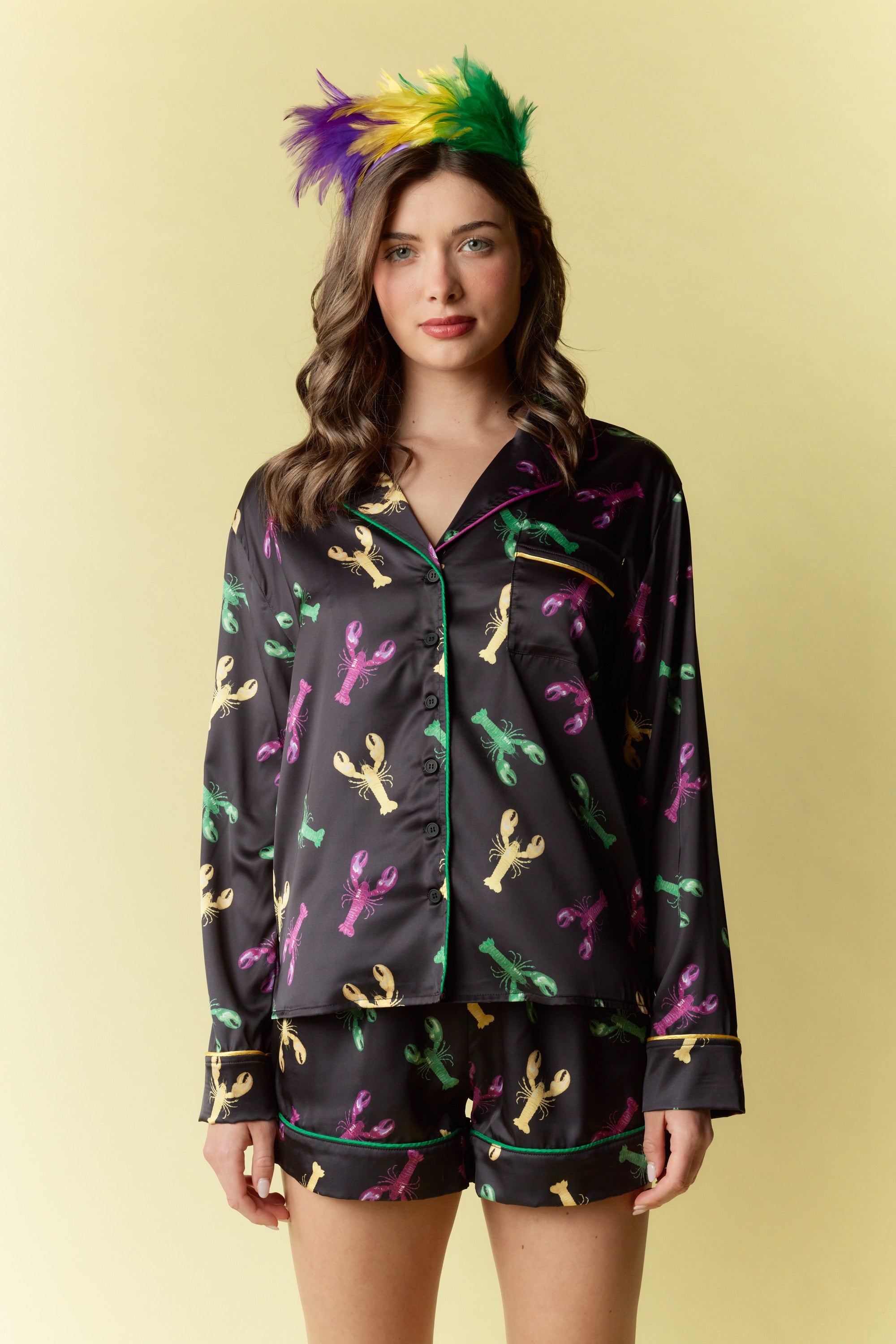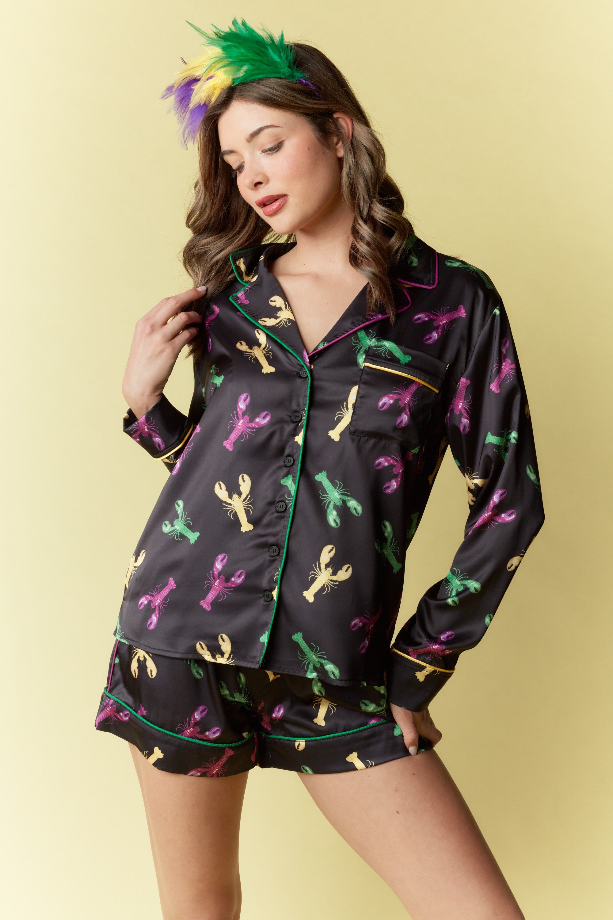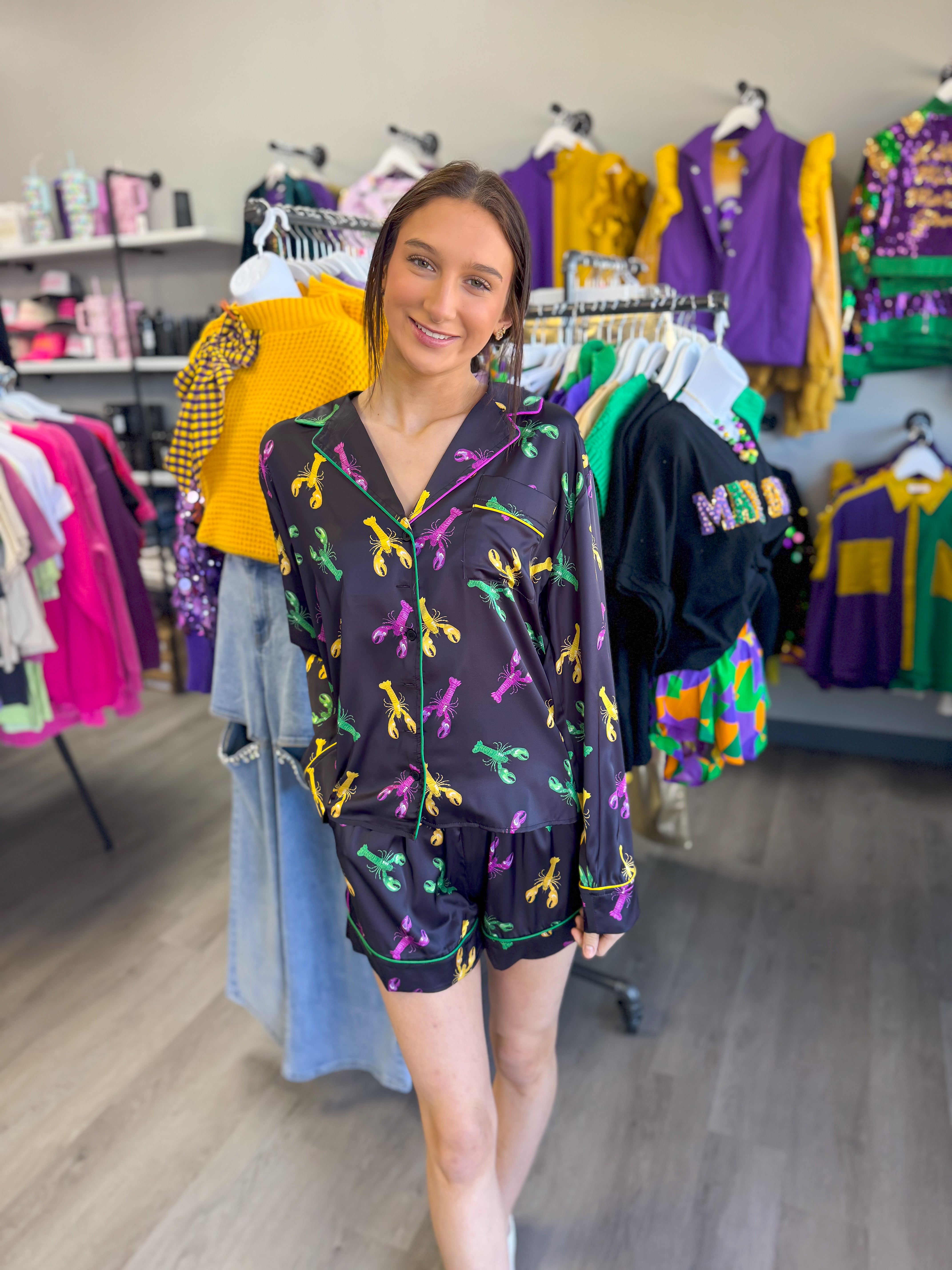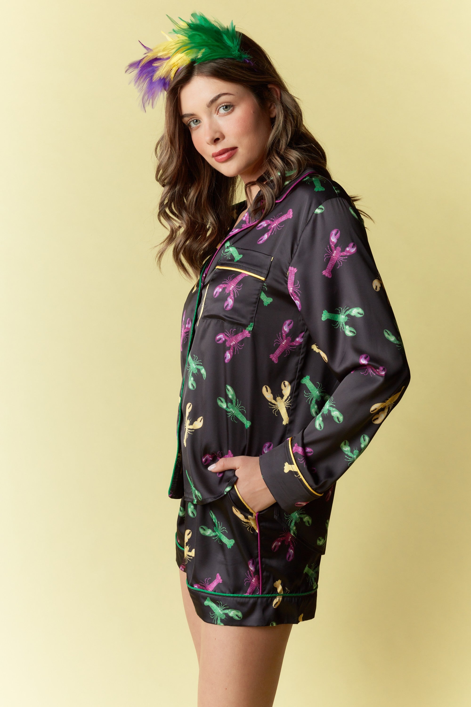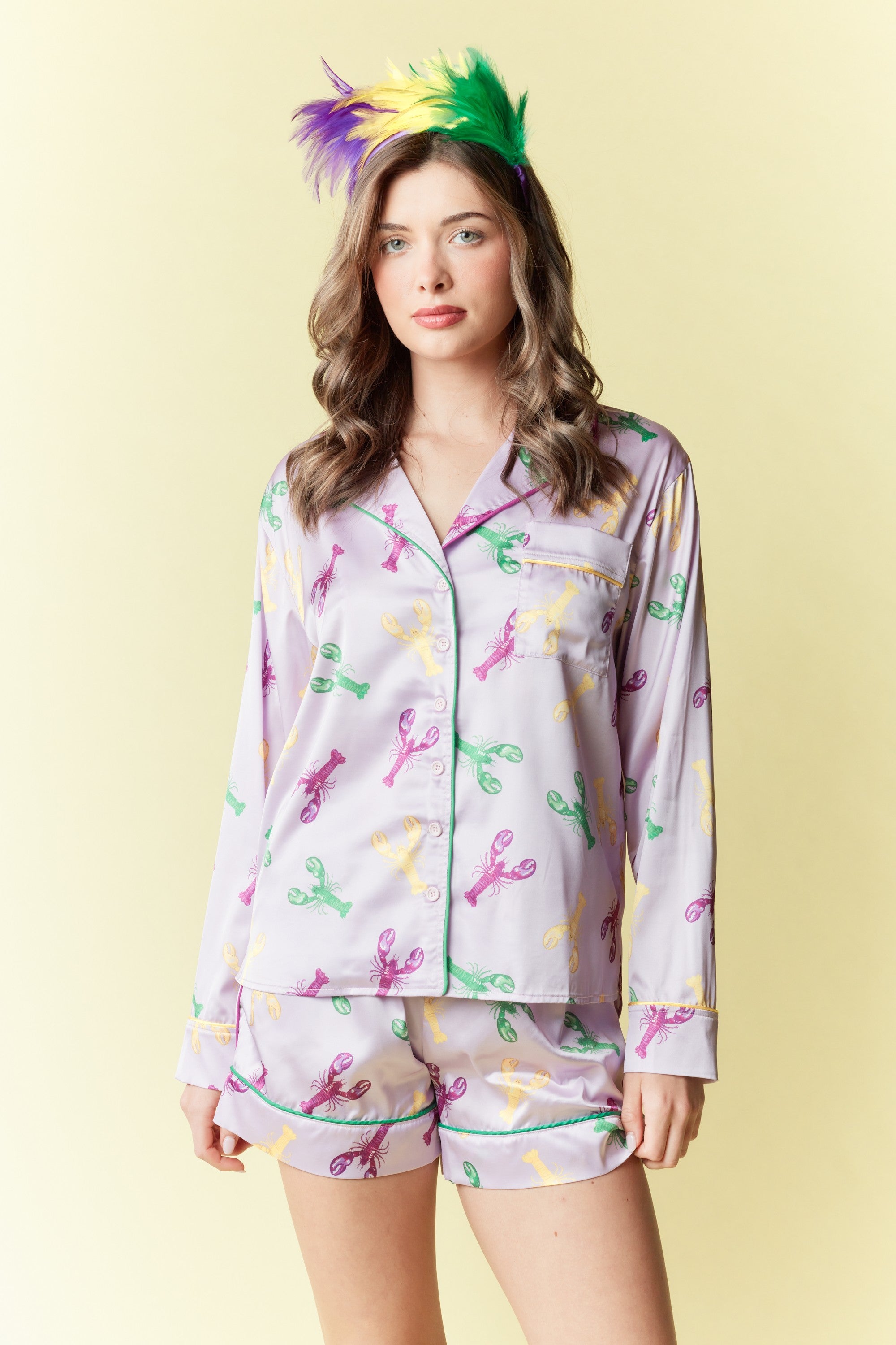 - Relaxed Fit - Button-up collared shirt with contrast piping and a single chest pocket. - Matching shorts with elastic waistband and green piping detail for added charm. - Playful print in vibrant Mardi Gras-inspired colors - (purple, green, and gold). - Comfortable and lightweight satin fabric for a luxurious feel