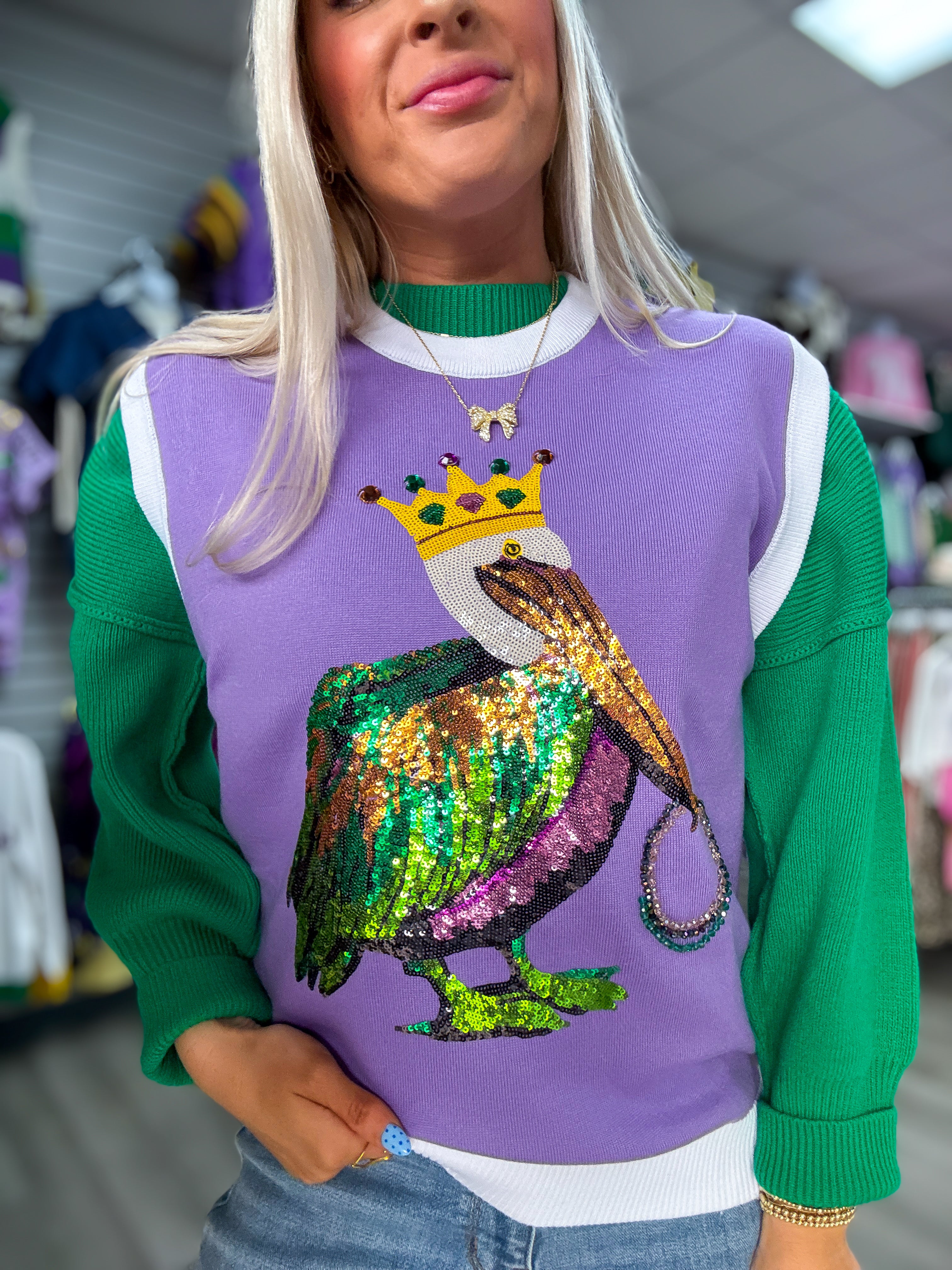 Mardi Gras Pelican | Sequin Sleeveless Sweater