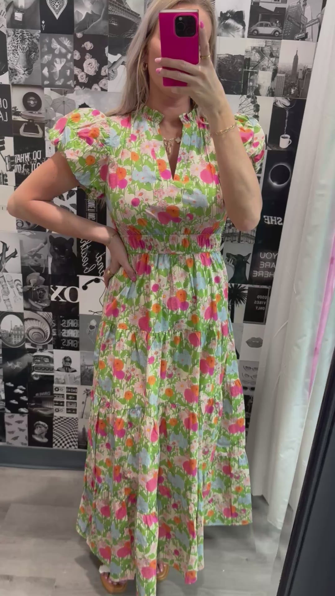 Floral print short bubble puff sleeve pullover mini tiered dress. Double elasticated waist. Pockets at side. Lined. Woven. Non-sheer. Lightweight.