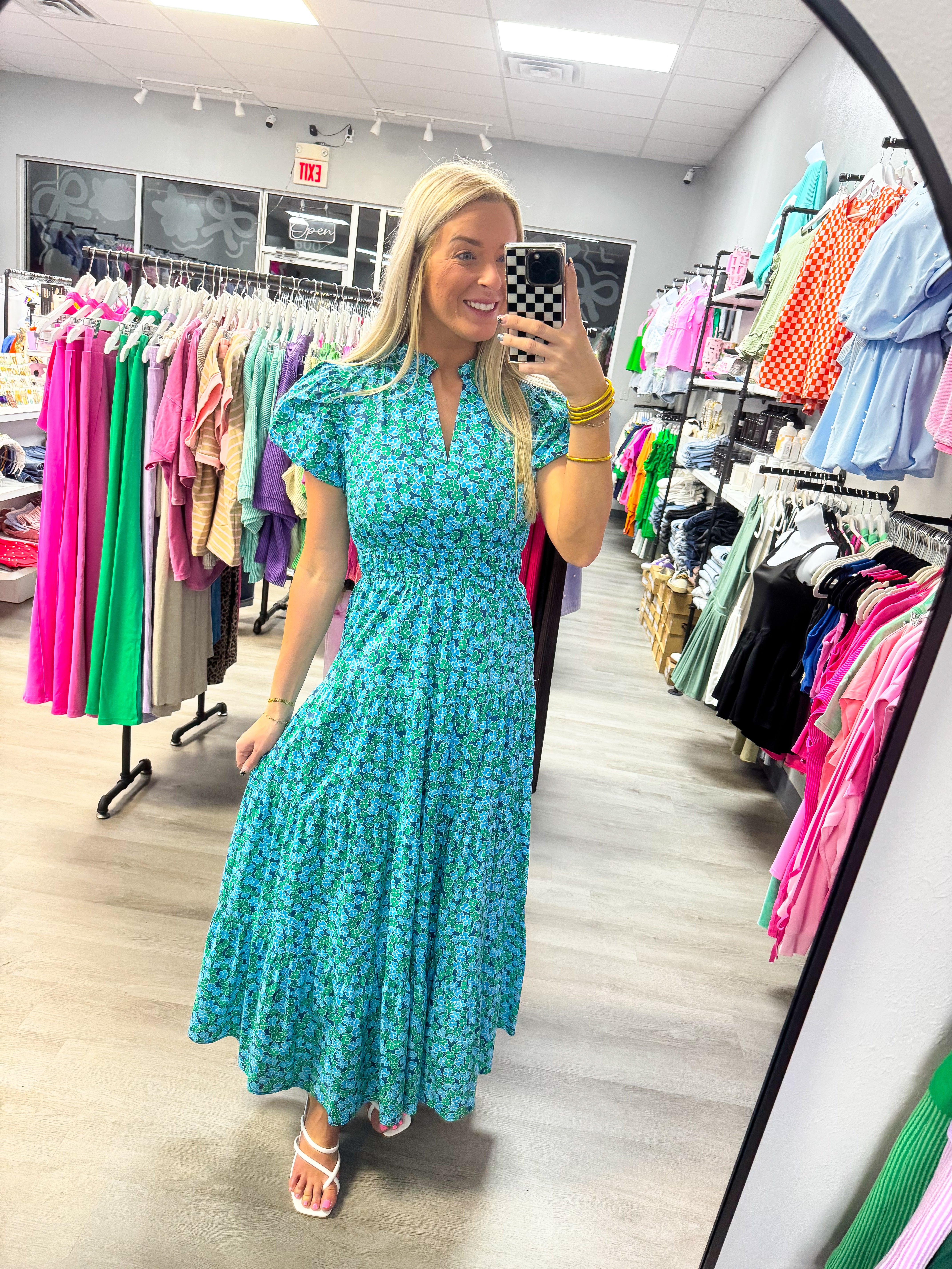 Dress up in this stunning Meadow Mist Blue Green Floral Maxi Dress! The vibrant floral print pairs perfectly with the flowy, ruffled design and bubble short sleeves. A split V-neck and elastic waistband add stylish details. Lined and lightweight, this woven dress is perfect for any occasion.