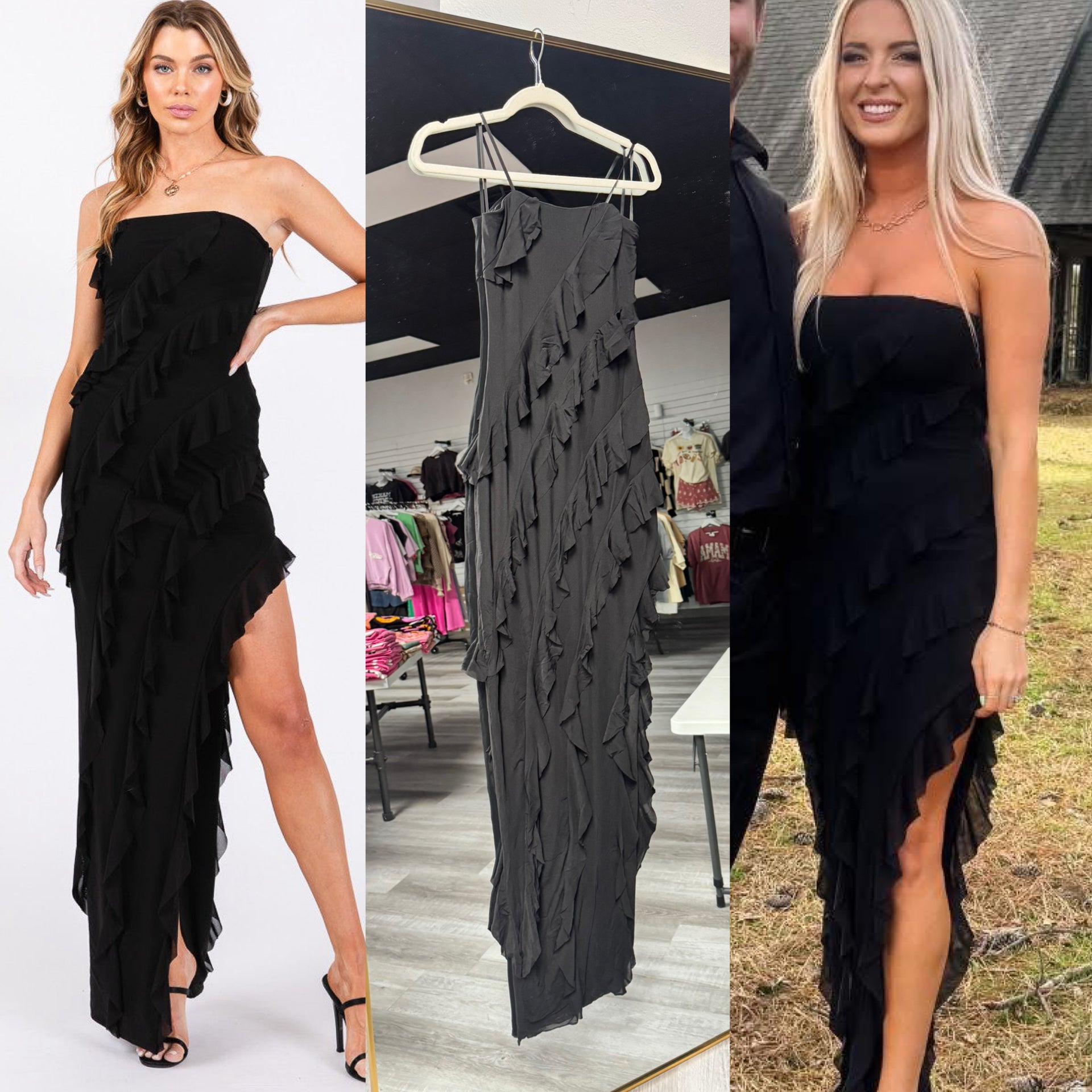 This Turning Heads Tube Ruffle Maxi provides a chic and stylish look. With its tube top design and bodycon fit, it is perfect for any body shape. The ruffle detail adds a touch of femininity, while the side slit and zipper offer ease of movement and a modern touch.