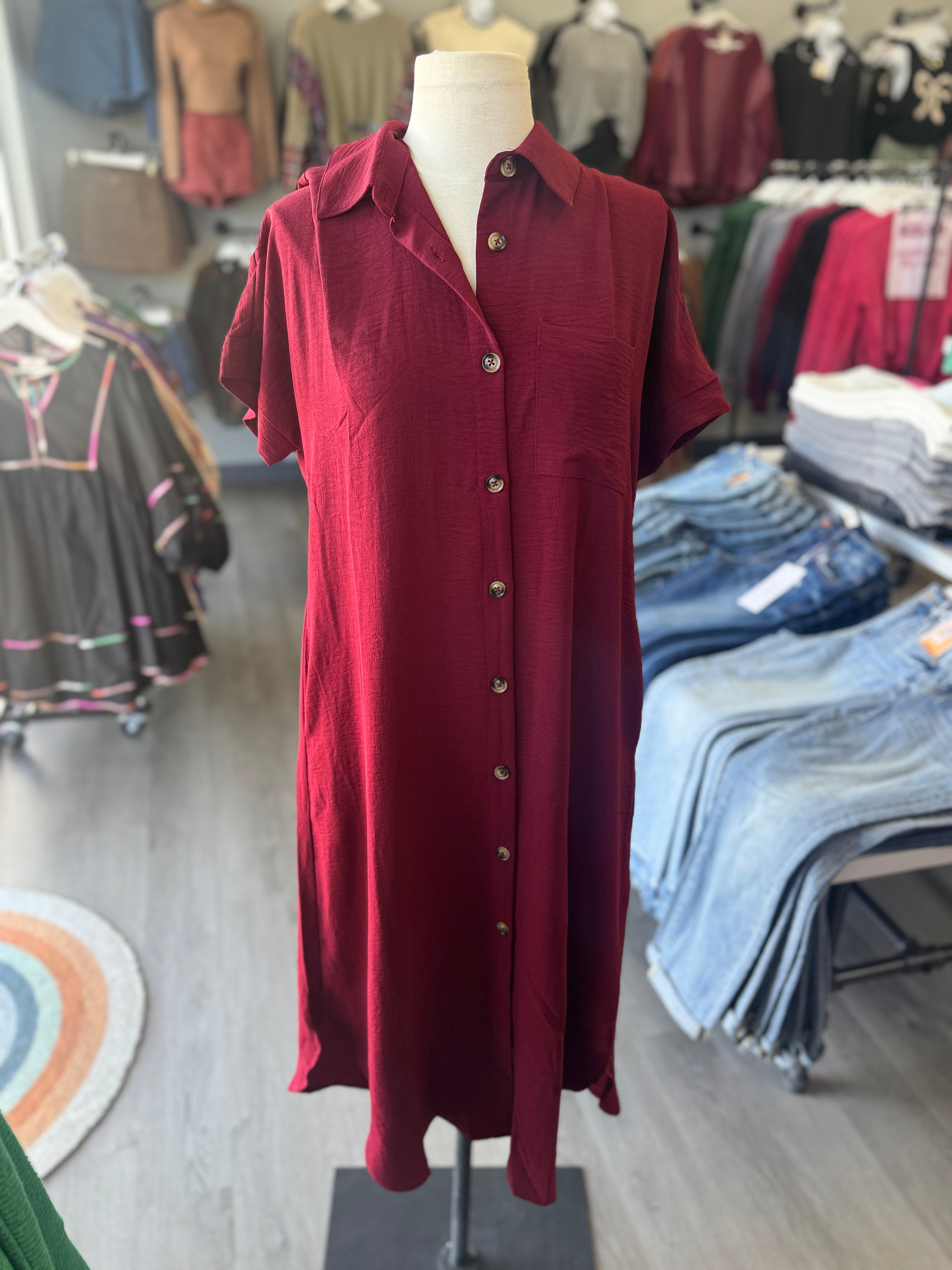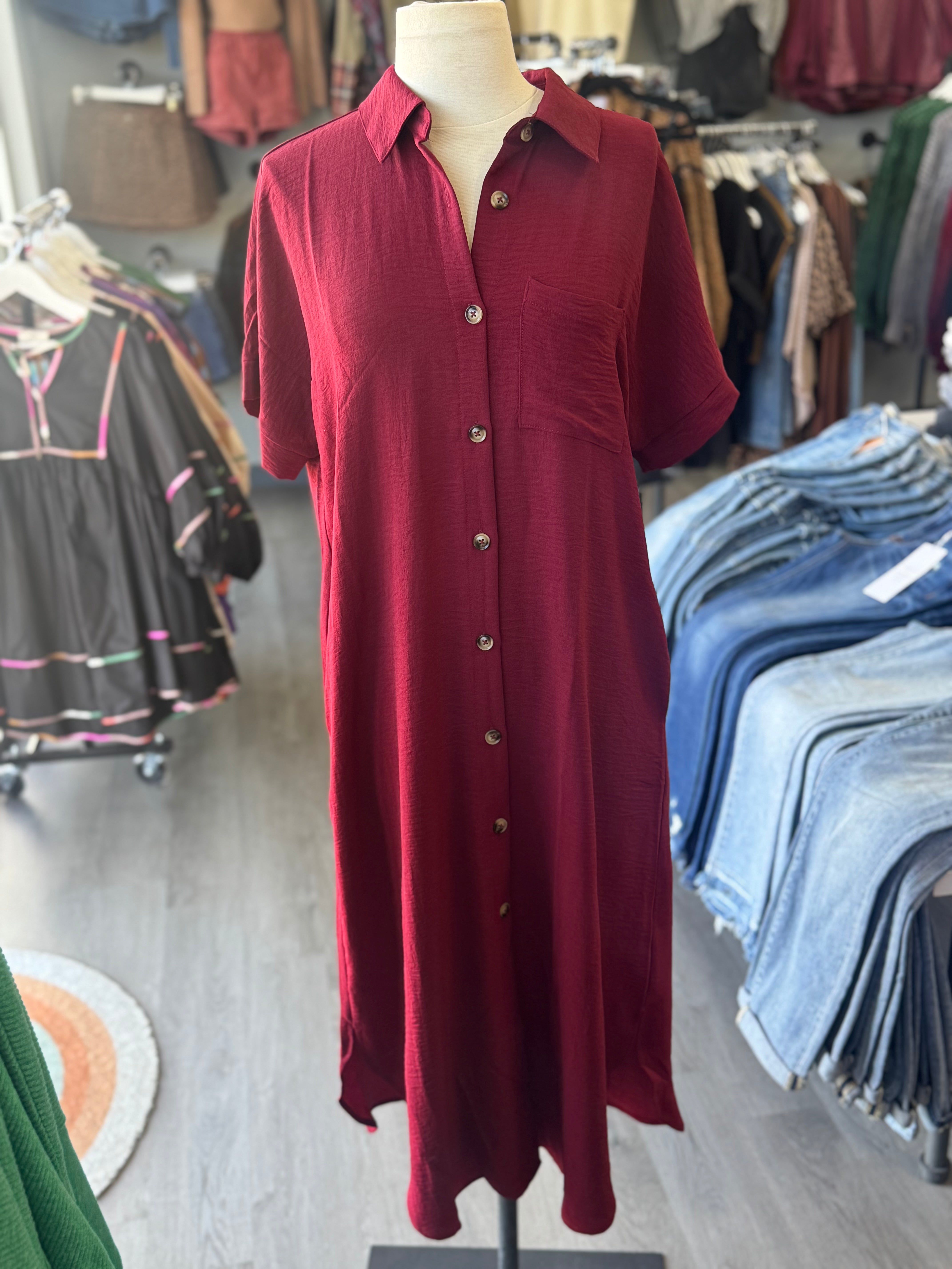 Solid midi dress with collared neck, chest pocket, side pockets, short kimono sleeves, band cuffs, and curved hemline.