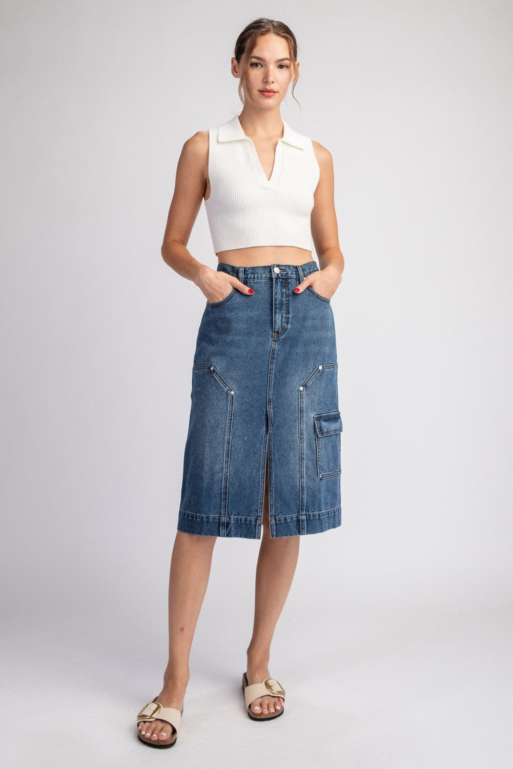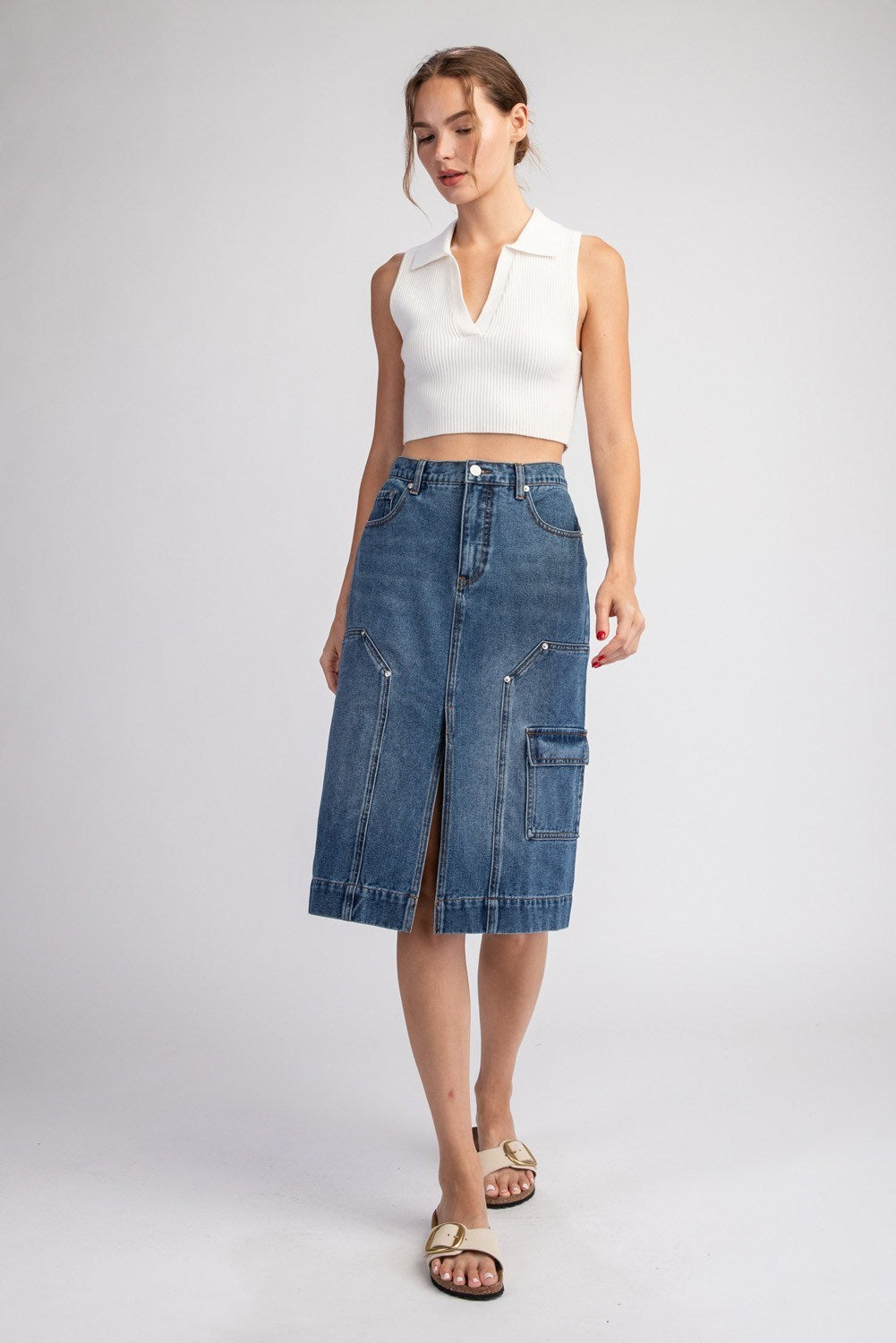 Get ready to turn heads with this Denim Split Midi Skirt! Made from mineral wash denim, this skirt is not only stylish but also durable. The zipper closure provides a secure fit, while the side and back pockets add functionality. Perfect for any occasion, this skirt will be your go-to favorite.