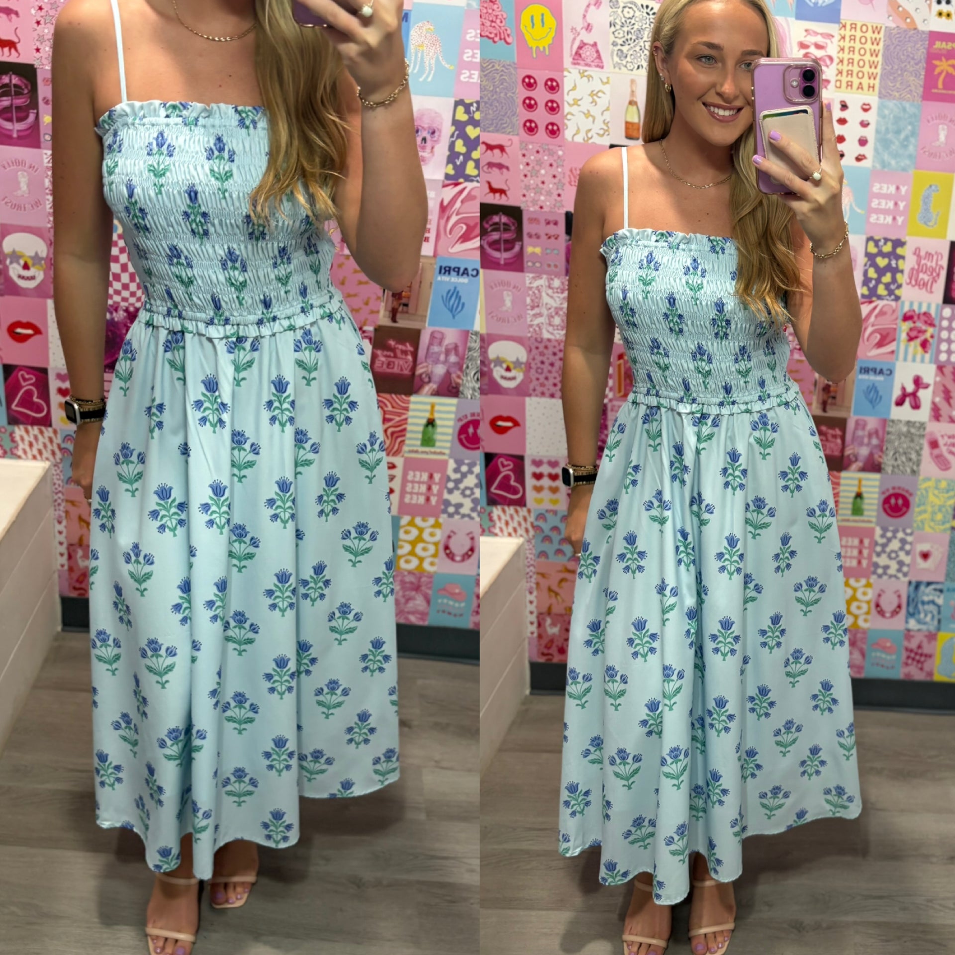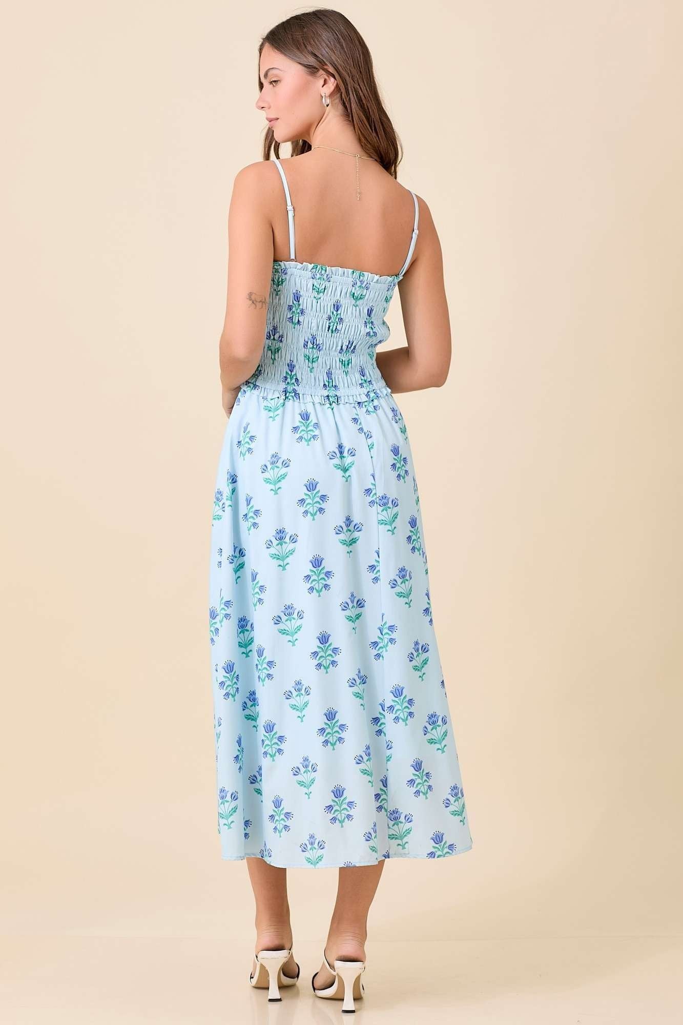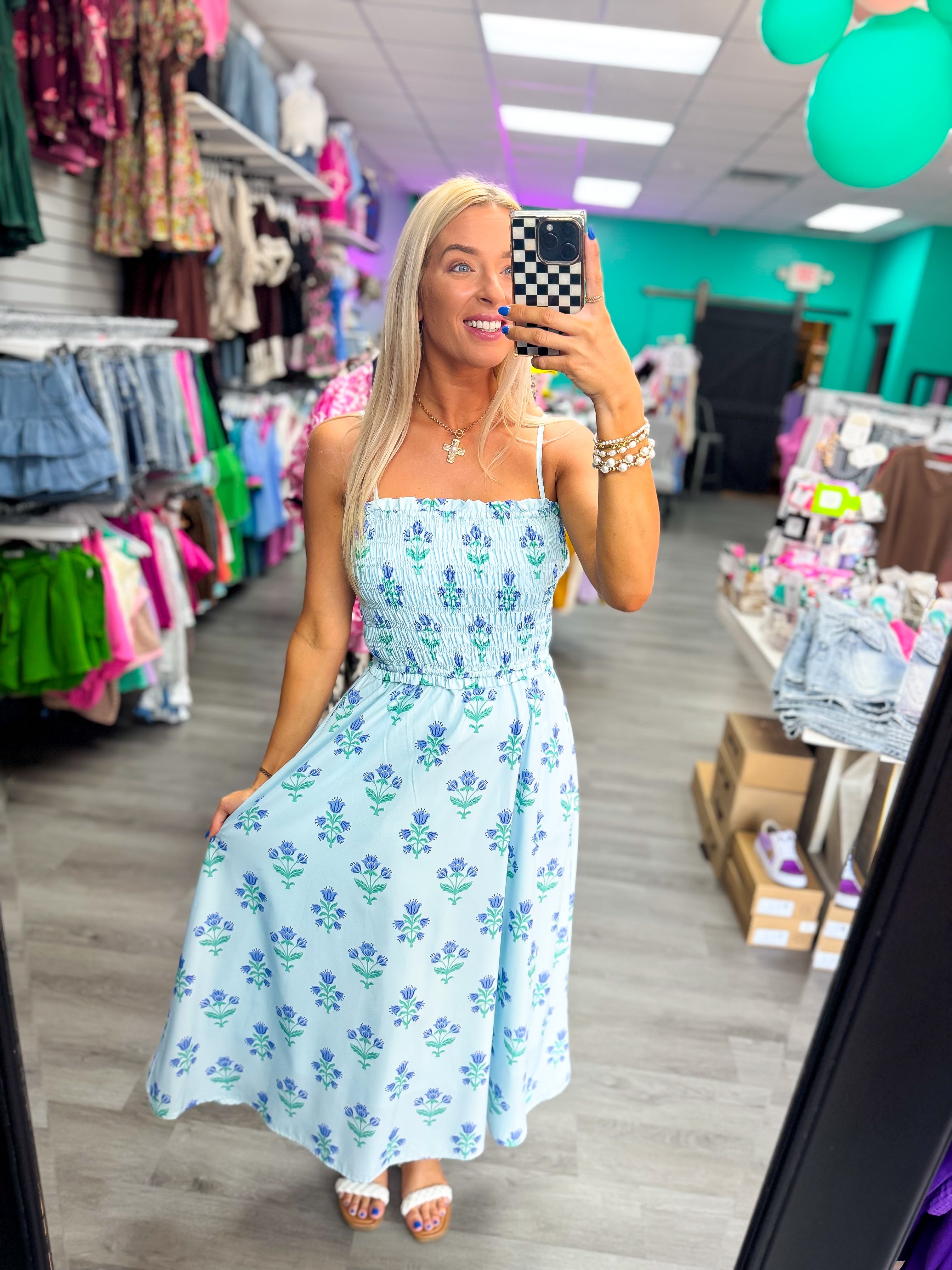 Put yourself first in this blue floral midi dress. With adjustable straps, a stretchy smocked bodice, and convenient side seam pockets, comfort and style are effortless. From everyday wear to weekend plans, this dress is your go-to choice.