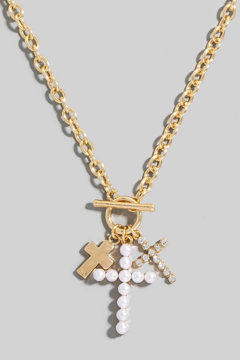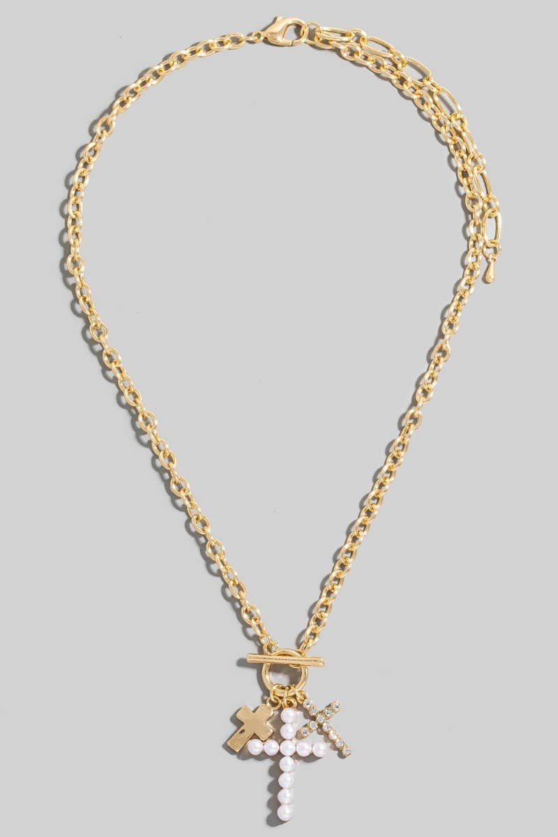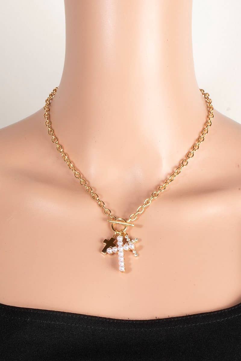 Pearl And Glass Pave Cross Charms Toggle Chain Necklace