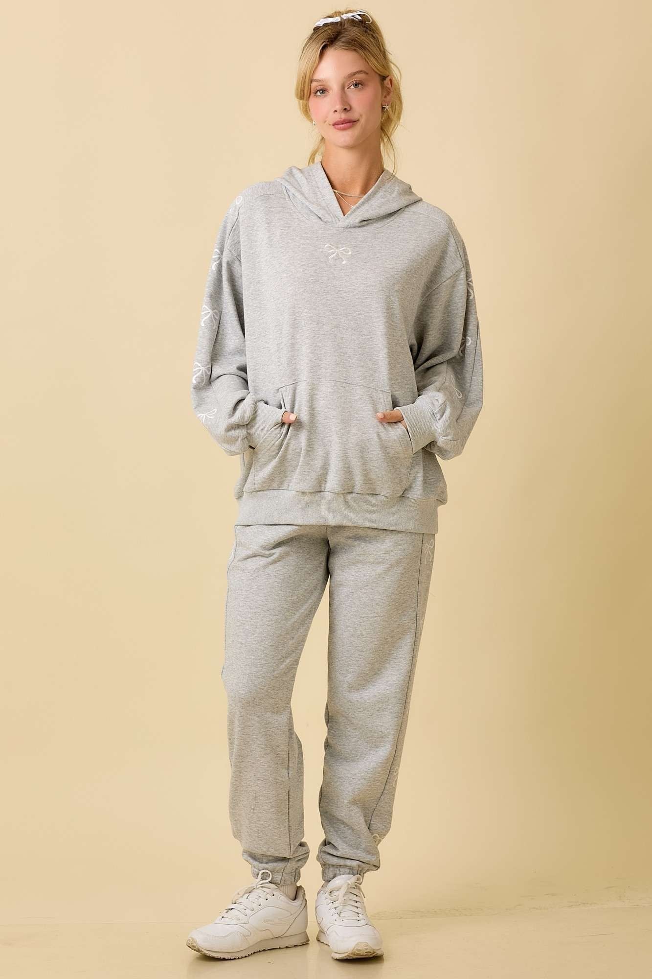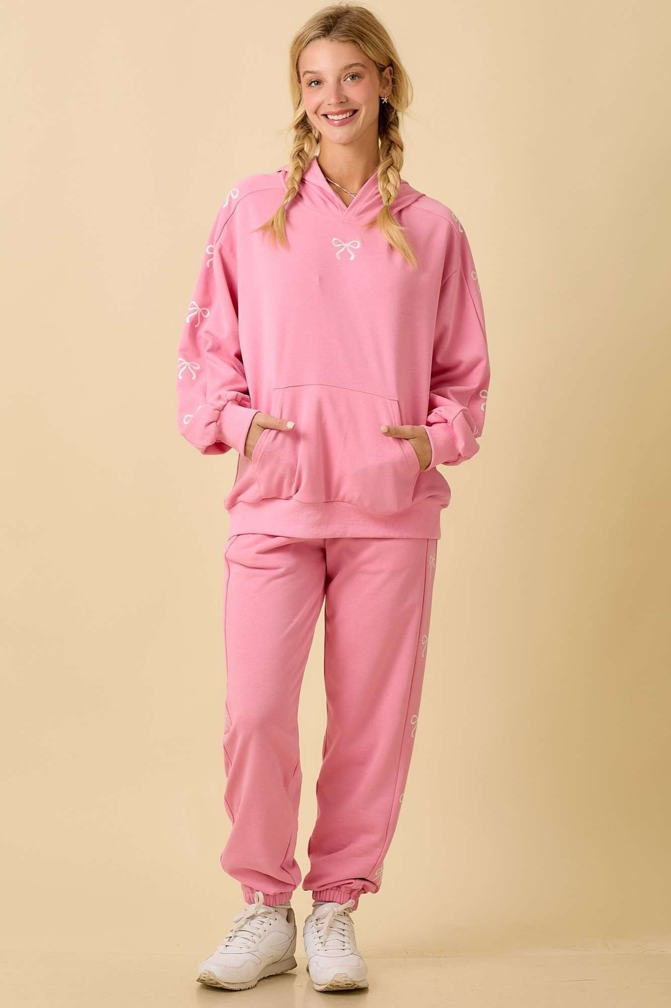 A soft and feminine hoodie set with embroidered ribbon details for a charming everyday look. Designed in a relaxed fit with matching joggers, this comfy lounge set combines casual ease with cute, girly style - perfect for weekend relaxation or travel days. lounge set, ribbon embroidery, matching set, cozy outfit, feminine loungewear, pastel set, comfy jogger set
