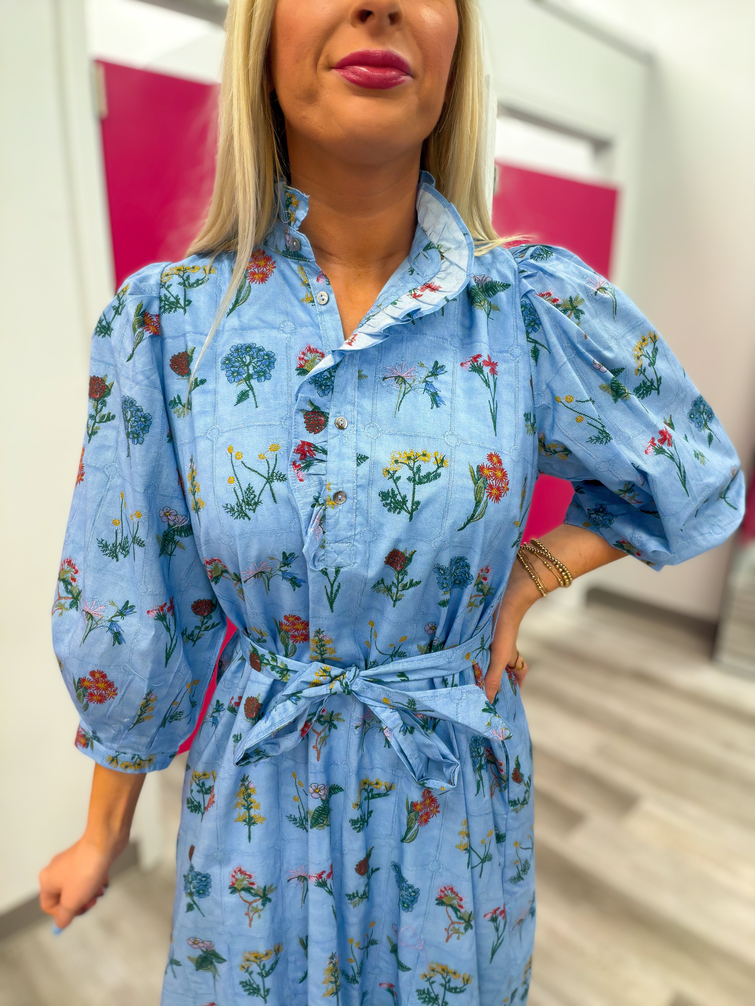 This dreamy blue floral midi dress is the definition of effortless elegance. Featuring a soft botanical print, ruffle-trim button front, and a flattering self-tie waist, it gives you that “put together” look with zero effort. The tiered skirt adds the prettiest movement, while the 3/4 sleeves make it perfect for transitioning seasons.