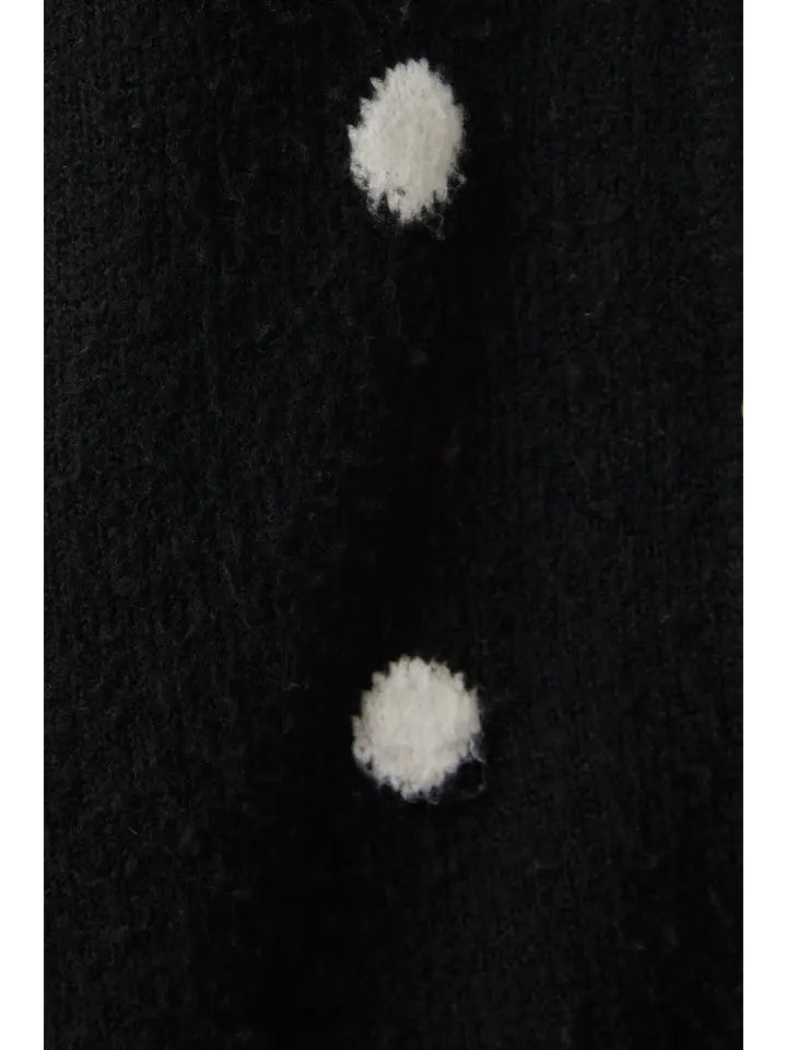 Black cardigan with white polka dot print