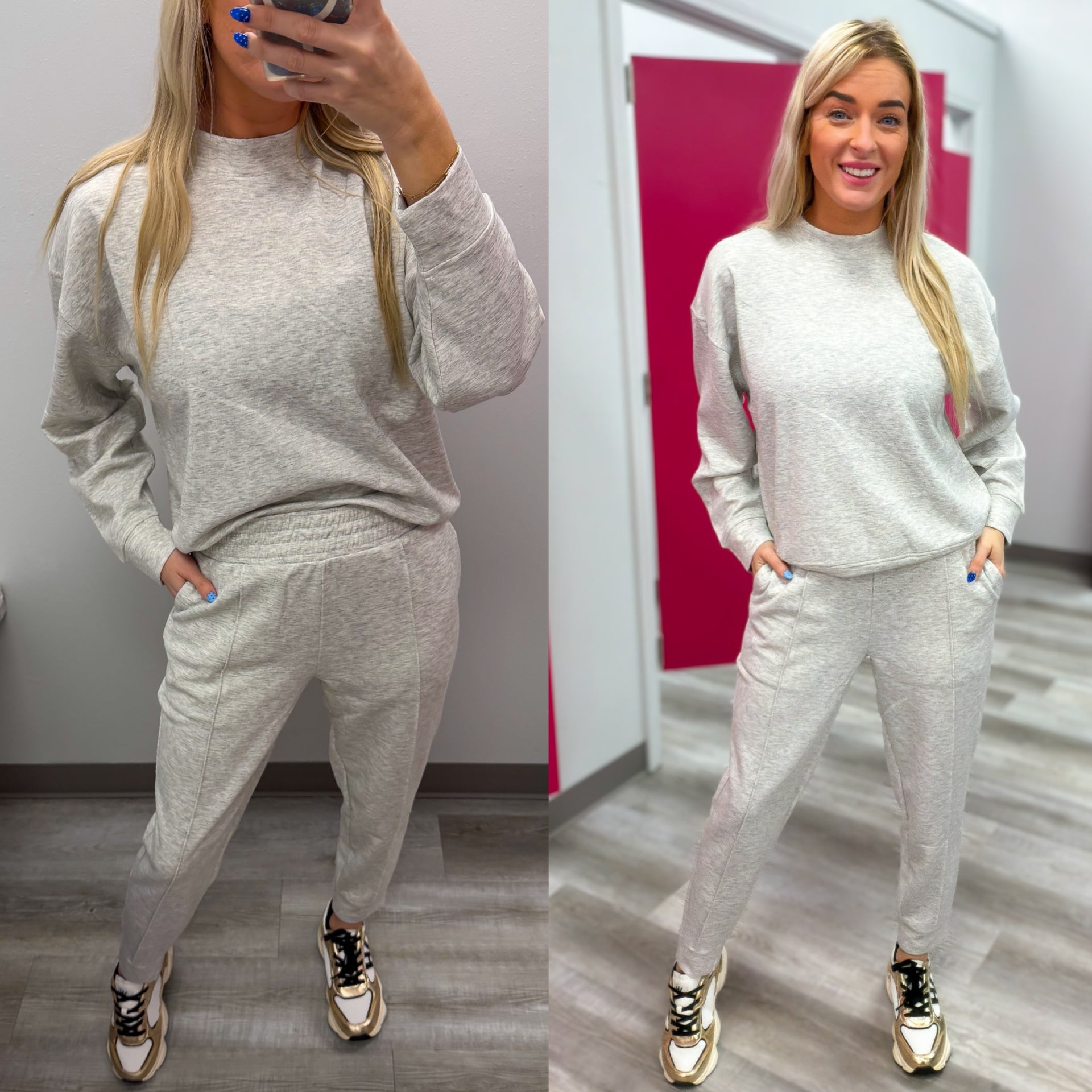 Meet your new go-to comfy set 🤍 This ultra-soft mockneck and jogger combo is made for lounging, errands, travel days, and everything in between. The mockneck top has a relaxed fit with an easy drape, while the joggers feature a comfy elastic waistband and pockets (because obviously). Cozy, flattering, and effortless — this is one you’ll reach for on repeat.