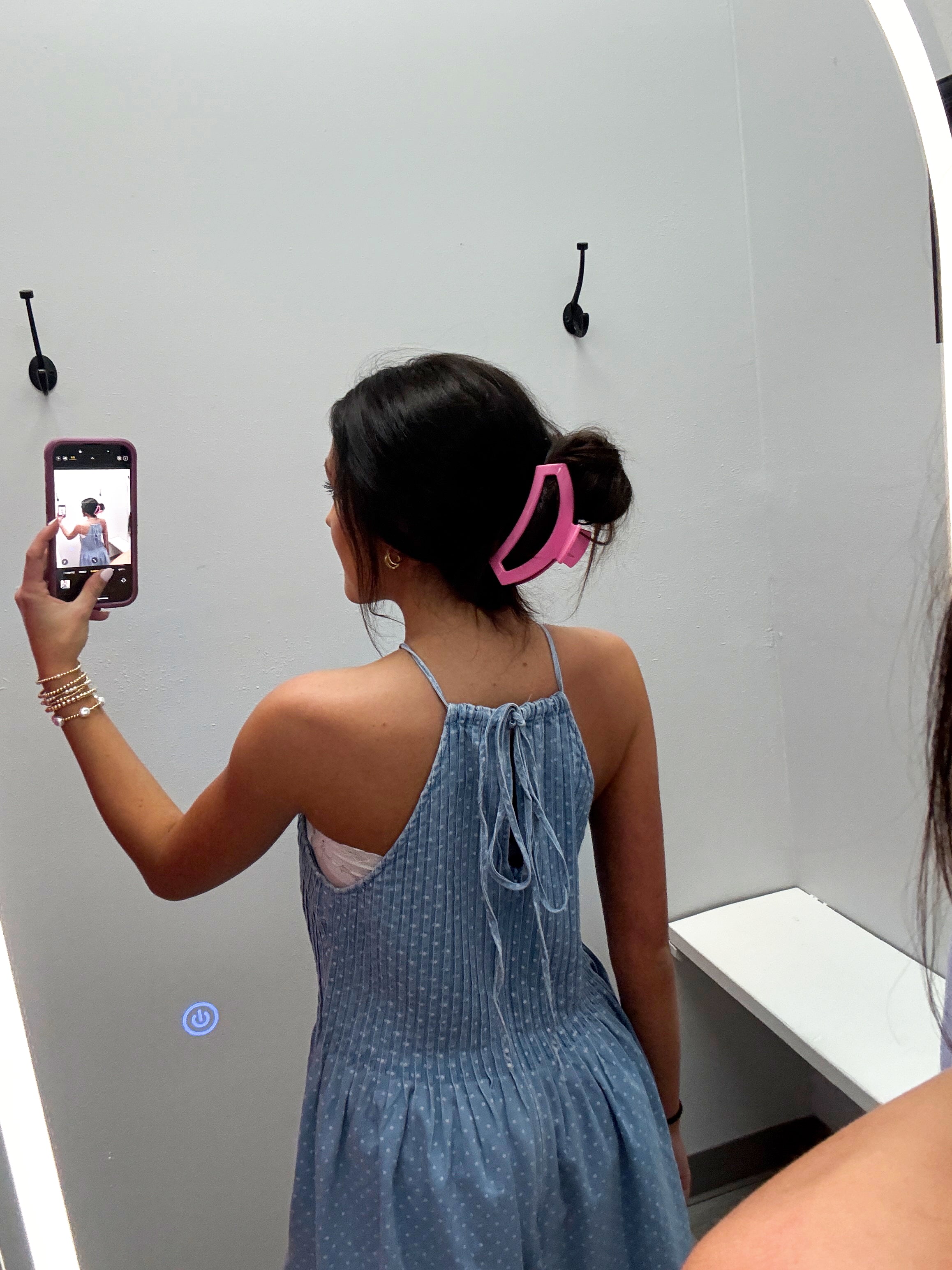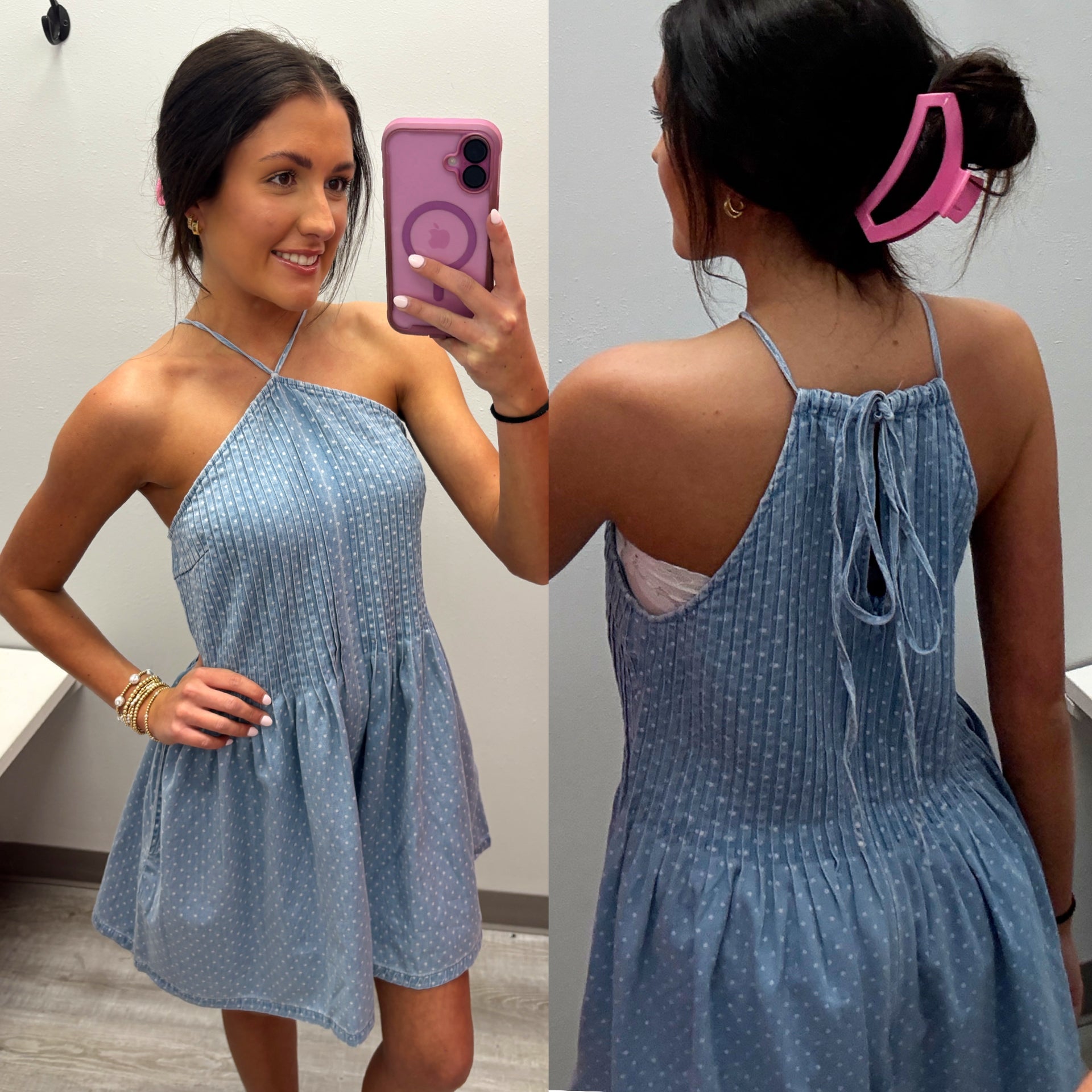 This denim romper is the perfect mix of sweet and statement-making. Featuring a flattering halter neckline with delicate pleated detailing and a flowy, flared bottom, she gives you that dress look with the comfort and coverage of a romper (yes please ๐).