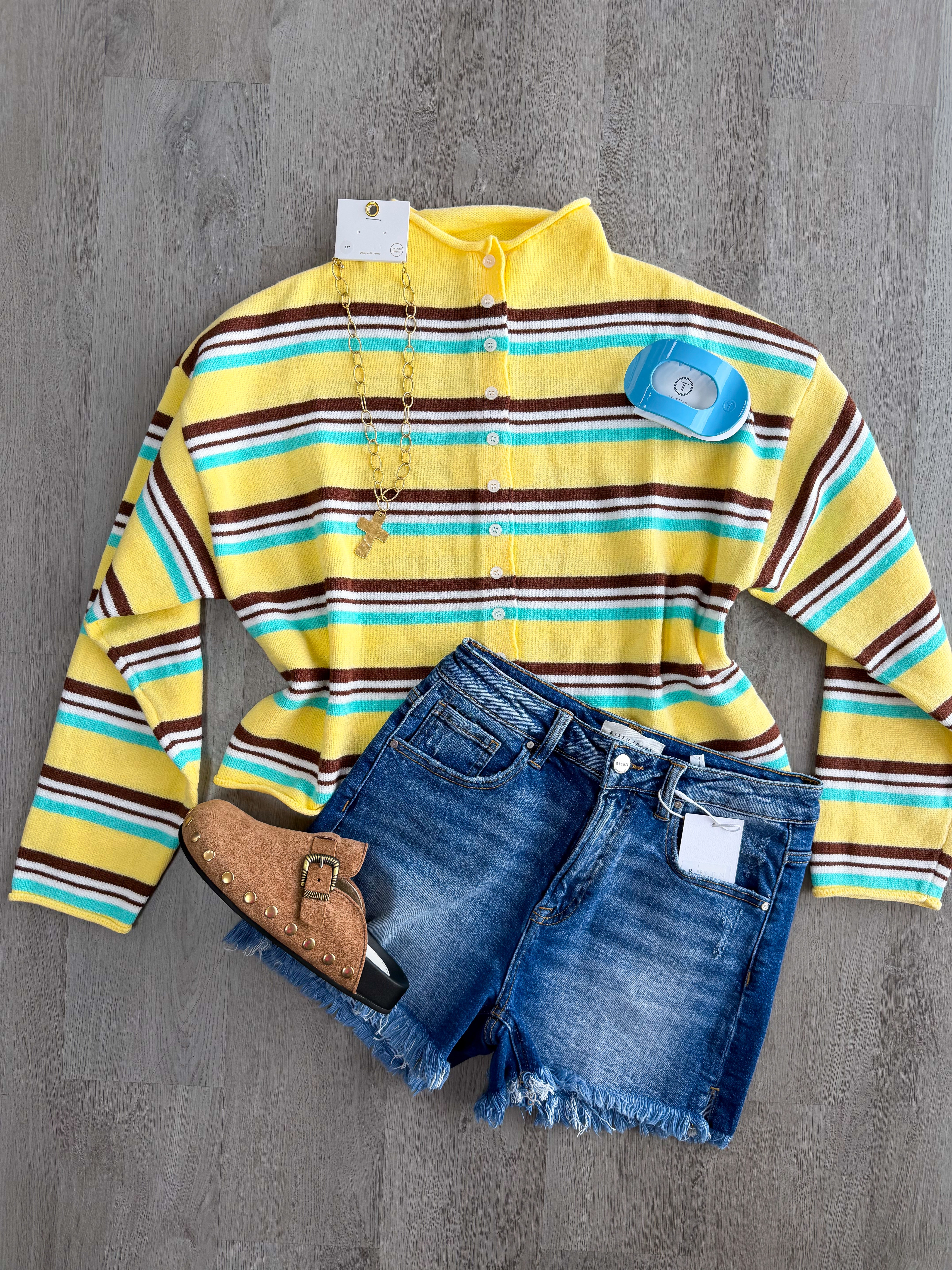 This striped cardigan is giving main character energy in the best way. The bright yellow base with turquoise + chocolate stripes makes her pop, while the relaxed fit keeps it effortless and easy to wear. Button her up as a top or layer her over a simple tank — either way, she’s doing all the talking.