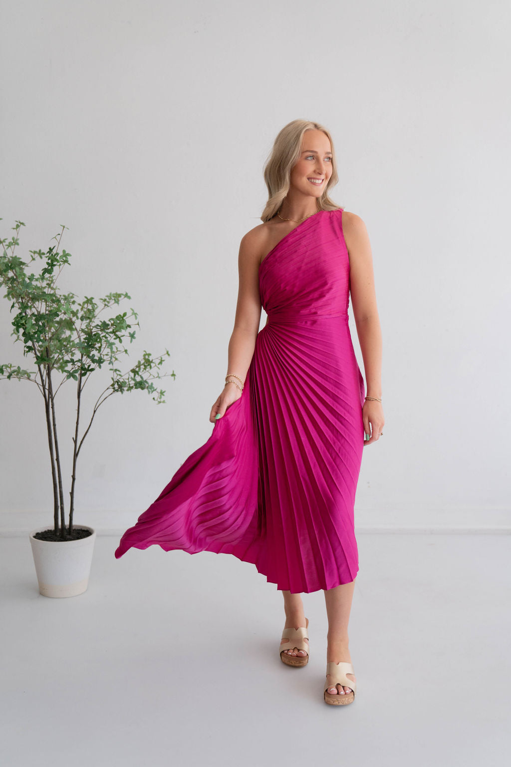 Unleash your playful side with our Pleated Dress in Magenta. Flowy, asymmetrical design adds a touch of whimsy to this gorgeous satin maxi dress. Perfect for any occasion, this dress will make you stand out in a crowd (in a good way)!