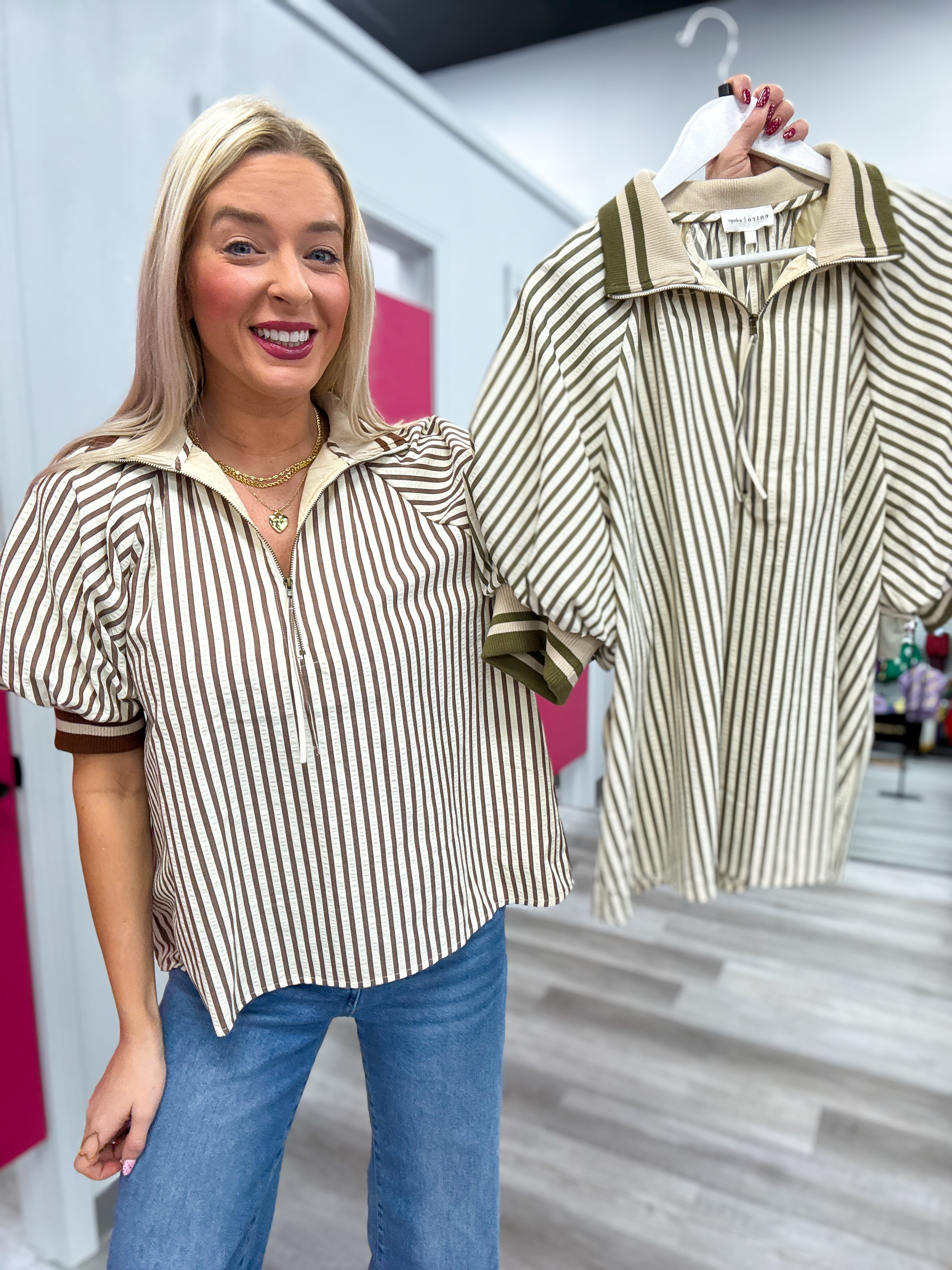 Stripe Zip Top Olive ~ OLIVE COLOR ON RIGHT