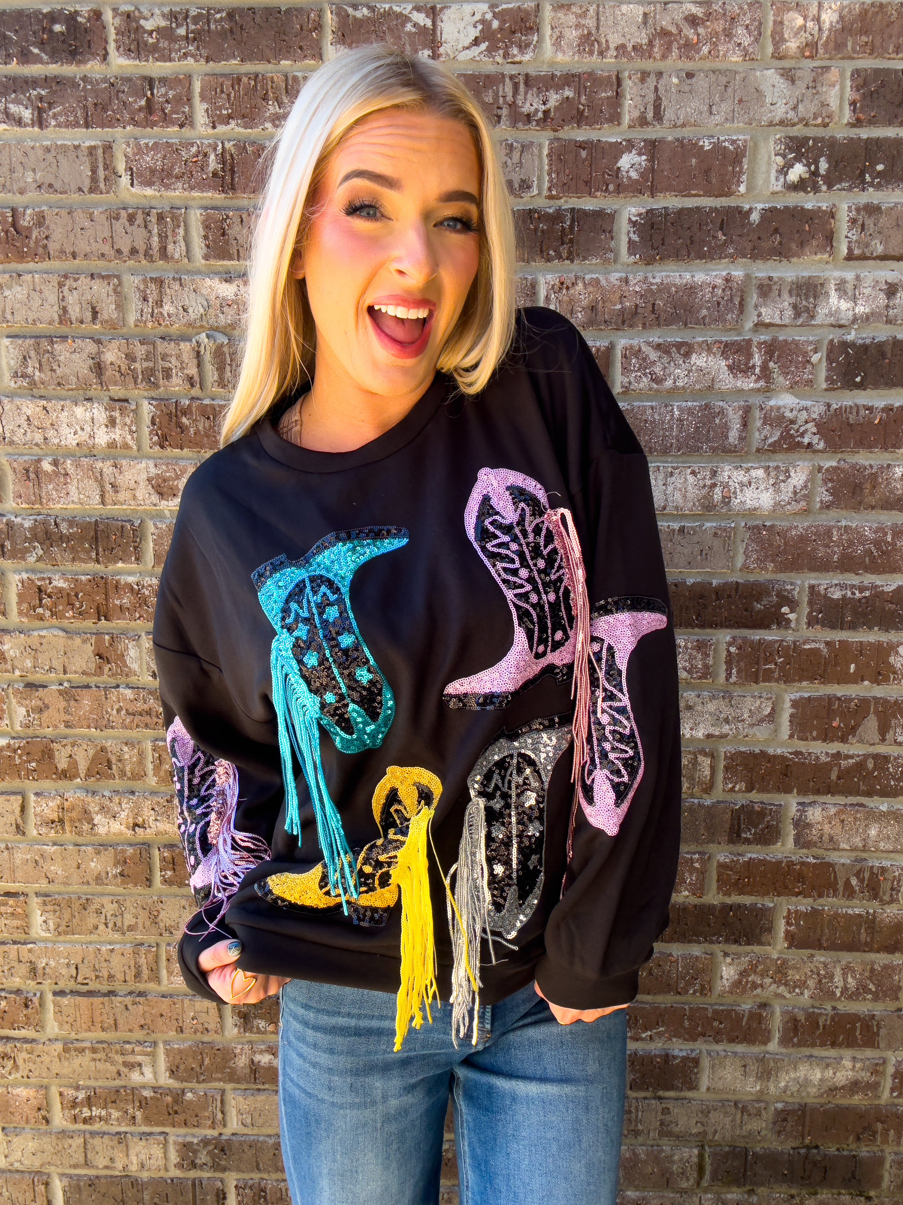 Cowgirl Era | Boot Sequin Fringe Fleece Top
