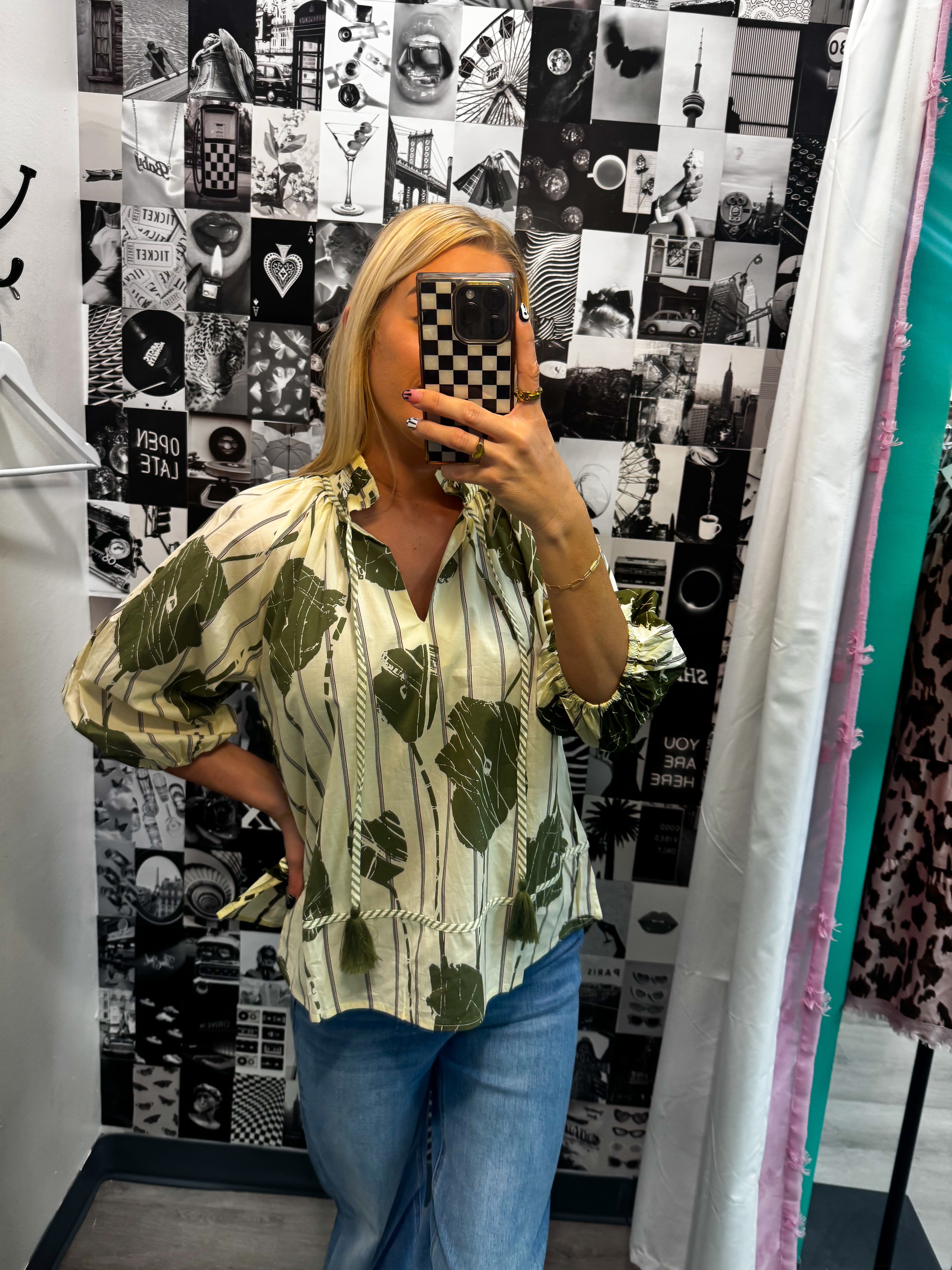 The perfect mix of comfy & chic — that olive print + tassel tie detail makes it a fall fave 🤍