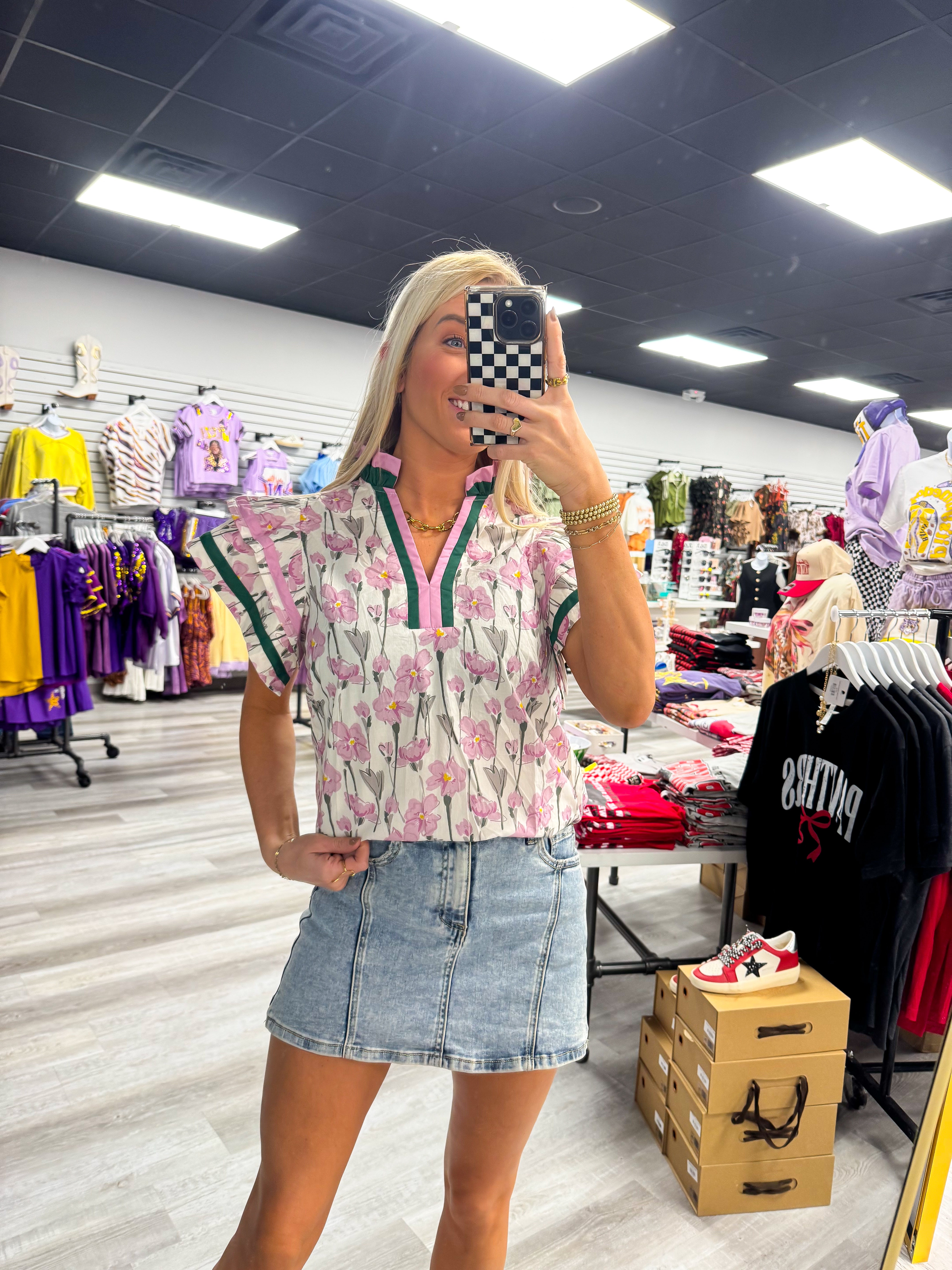 Floral print tiered flutter sleeve pullover top features multicolor accented ruffle neck and sleeve finish. Unlined. Woven. Non-sheer. Lightweight.