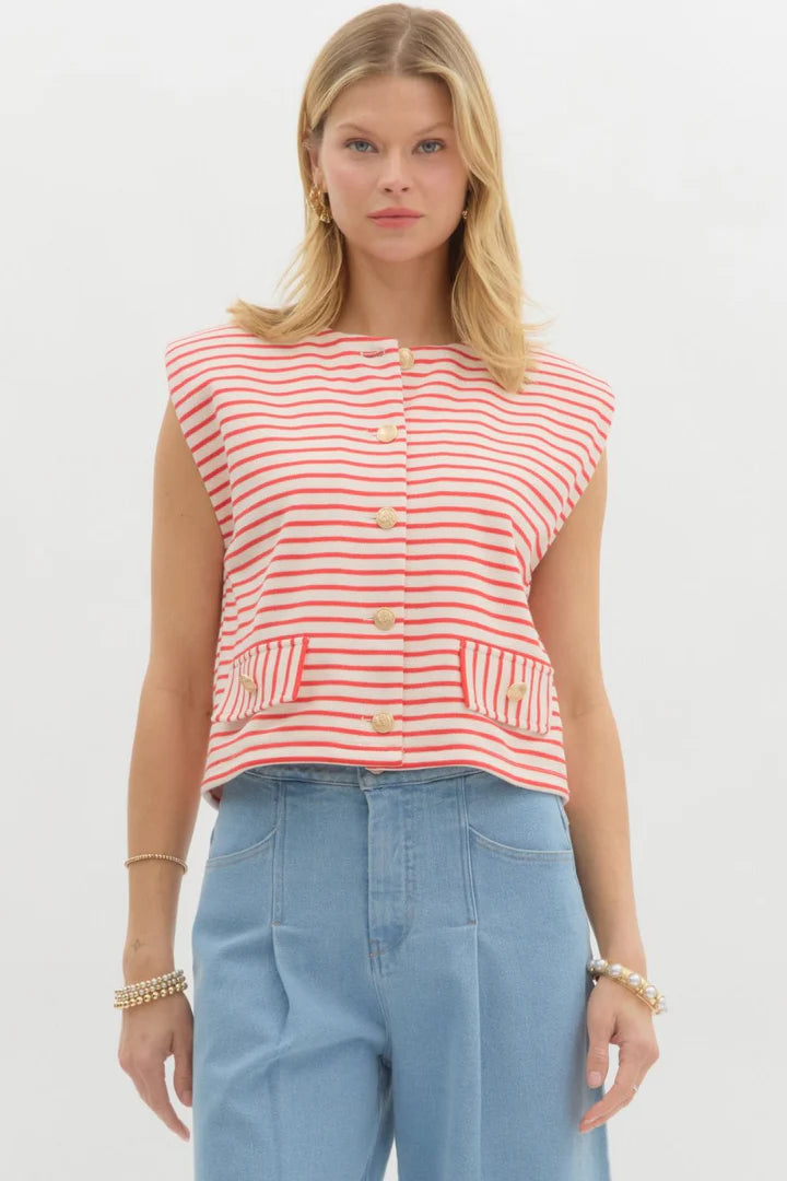 Stripe pattern structured shoulder sleeveless top featuring gold accent button closure. Faux pocket at front. Lined. Knit. Non-sheer. Lightweight.