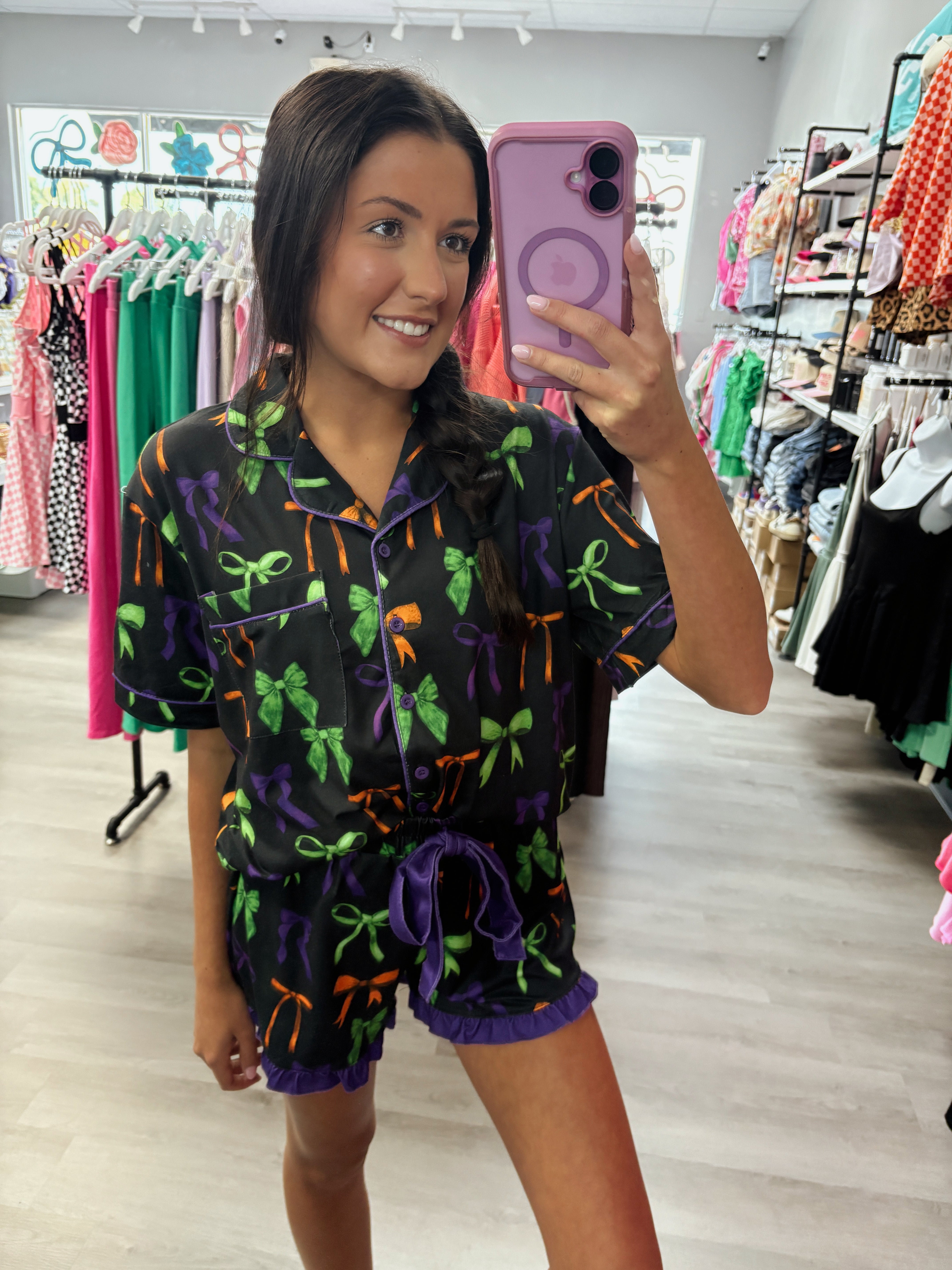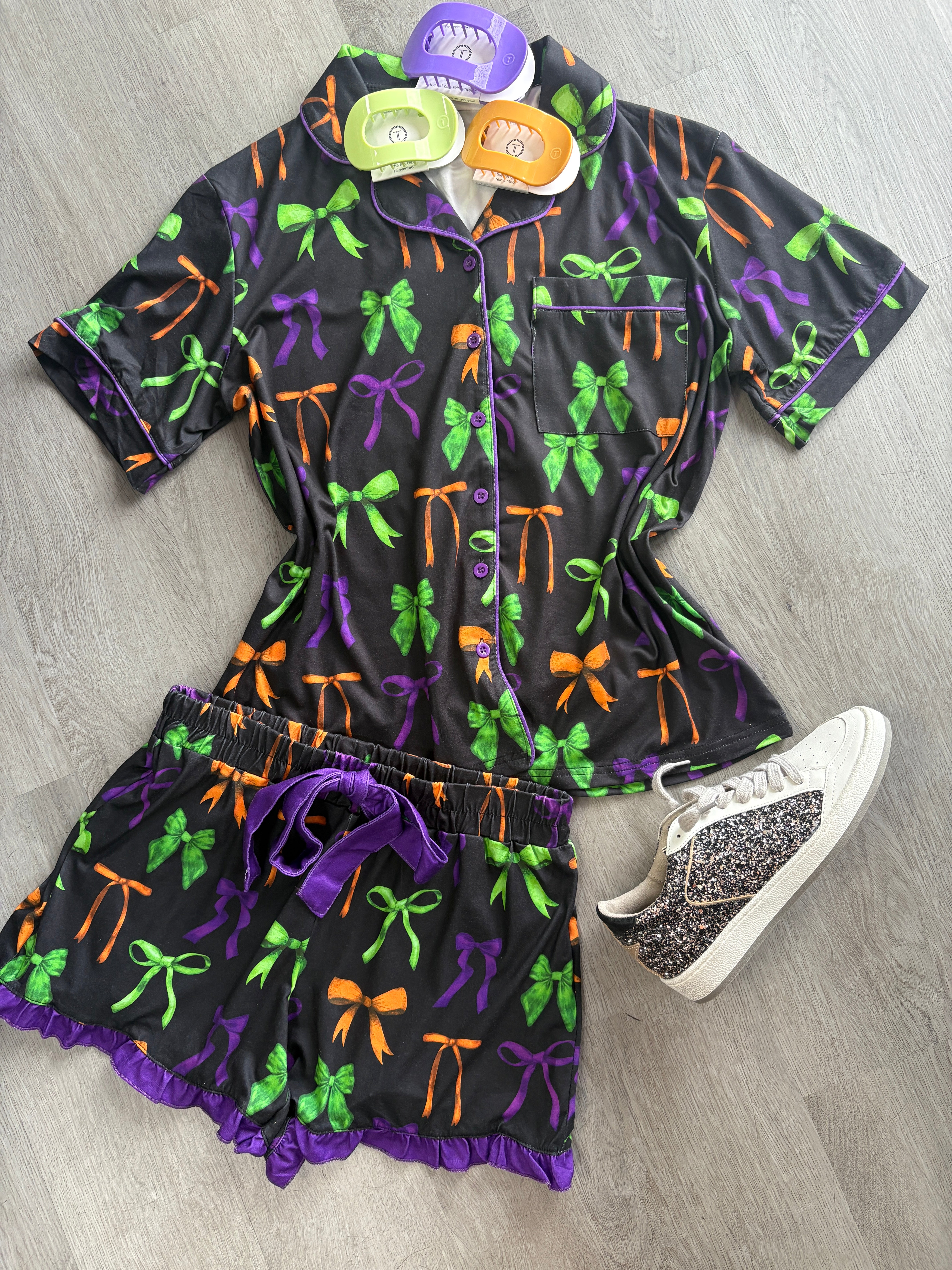 Lounge in style with our Bow Bewitched Ruffle Pajama Set. Featuring a fun and festive bow print, button up top, and playful ruffle shorts with a decorative tie. Get ready for a comfortable and fun night's sleep!