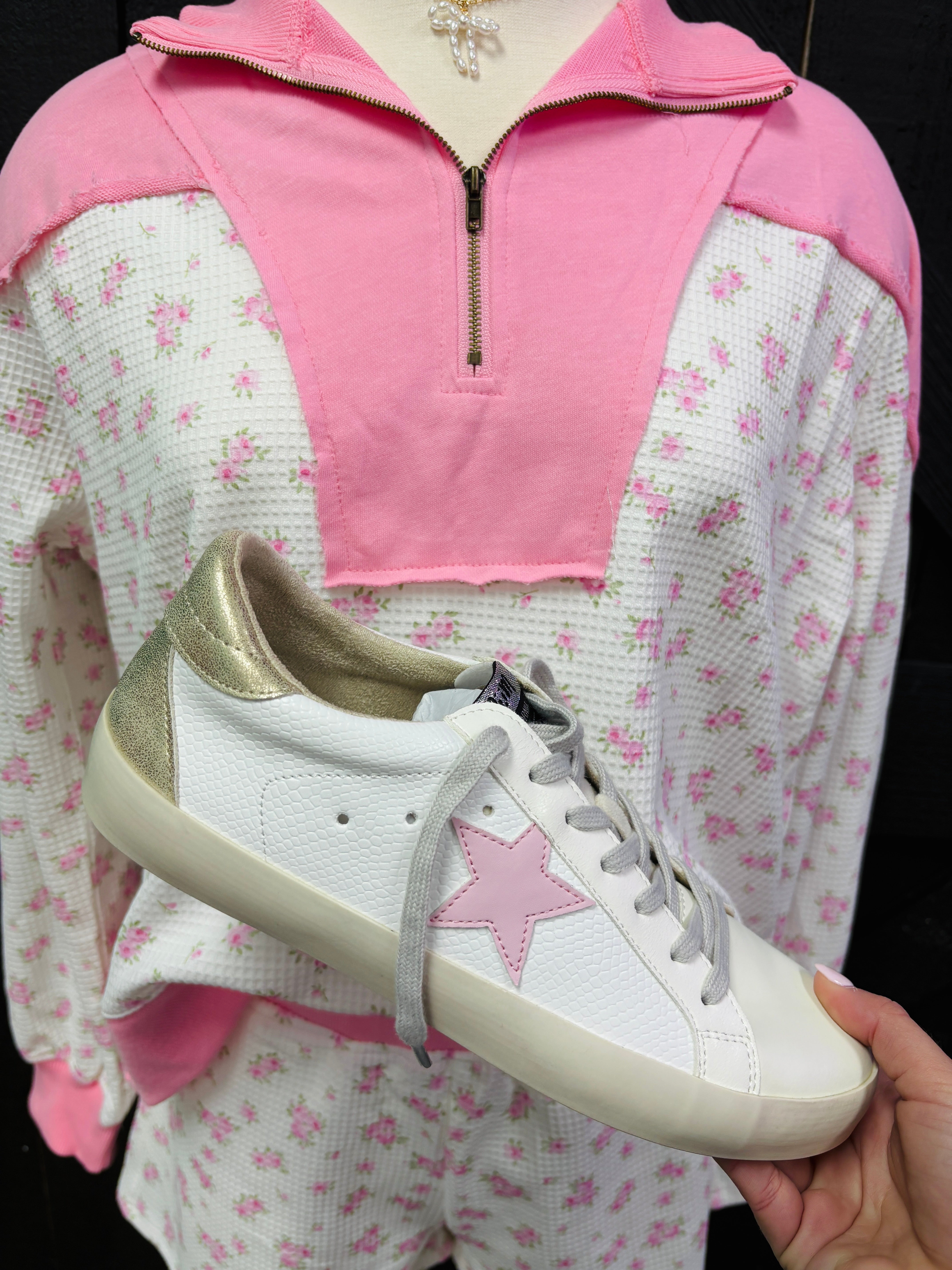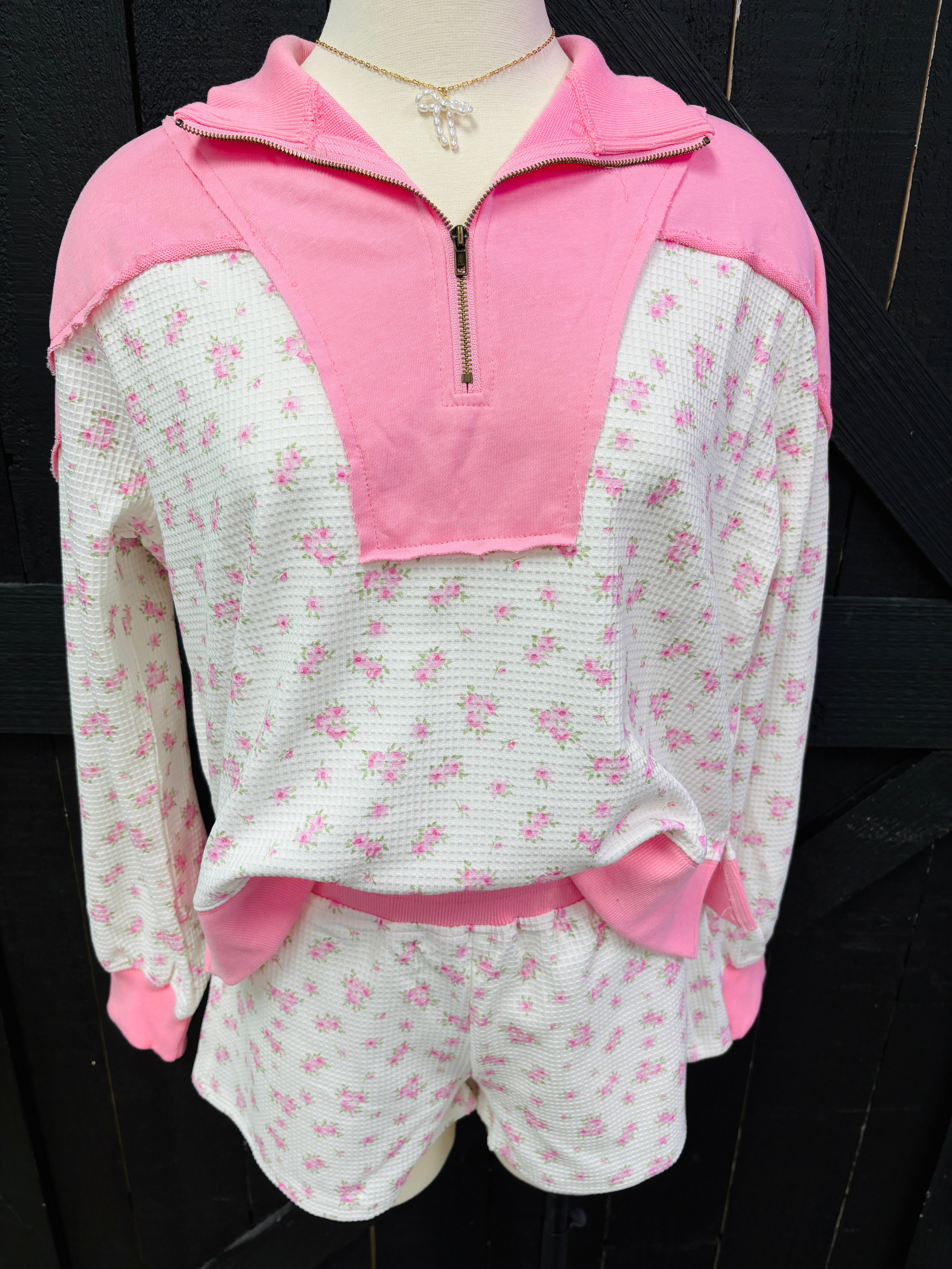 Soft, sweet, and made for all-day comfort 🤍🌸 The Blushing Petals Lounge Set features a lightweight waffle knit fabric with a delicate pink floral print, paired with the prettiest blush half-zip pullover. The contrast details add just the right pop while keeping it comfy and effortless. Perfect for slow mornings, errands, or lounging cute at home.