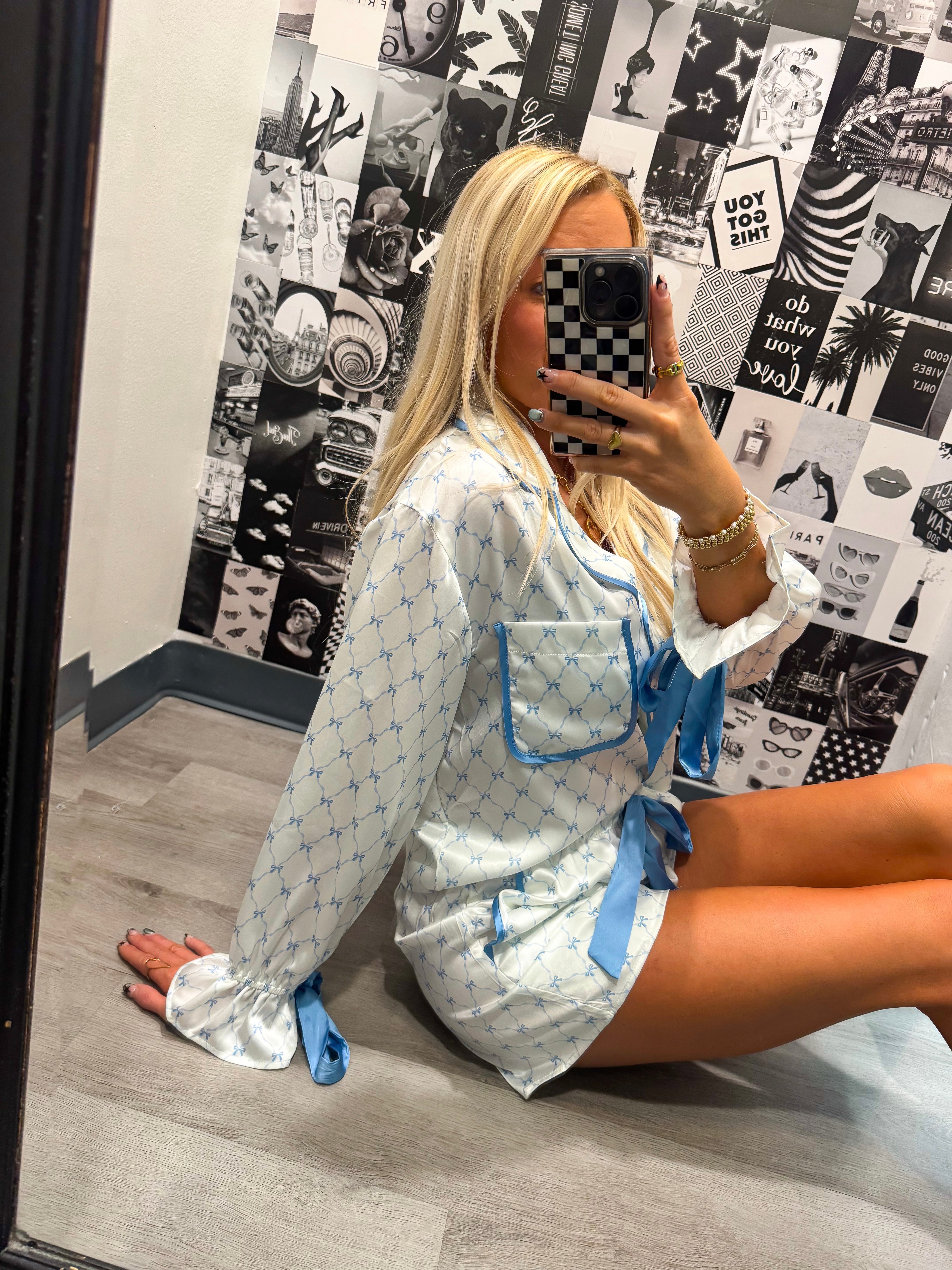 In My Dreams Satin Blue and White Bow Pajama Set