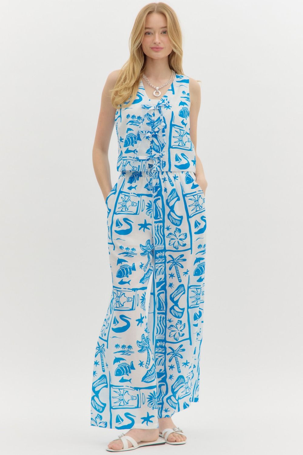 Pants: Resort pattern high waist wide-leg pull-on pants featuring drawstring elasticated waistband. Pockets at sides. Lined. Woven. Non-sheer. Lightweight.