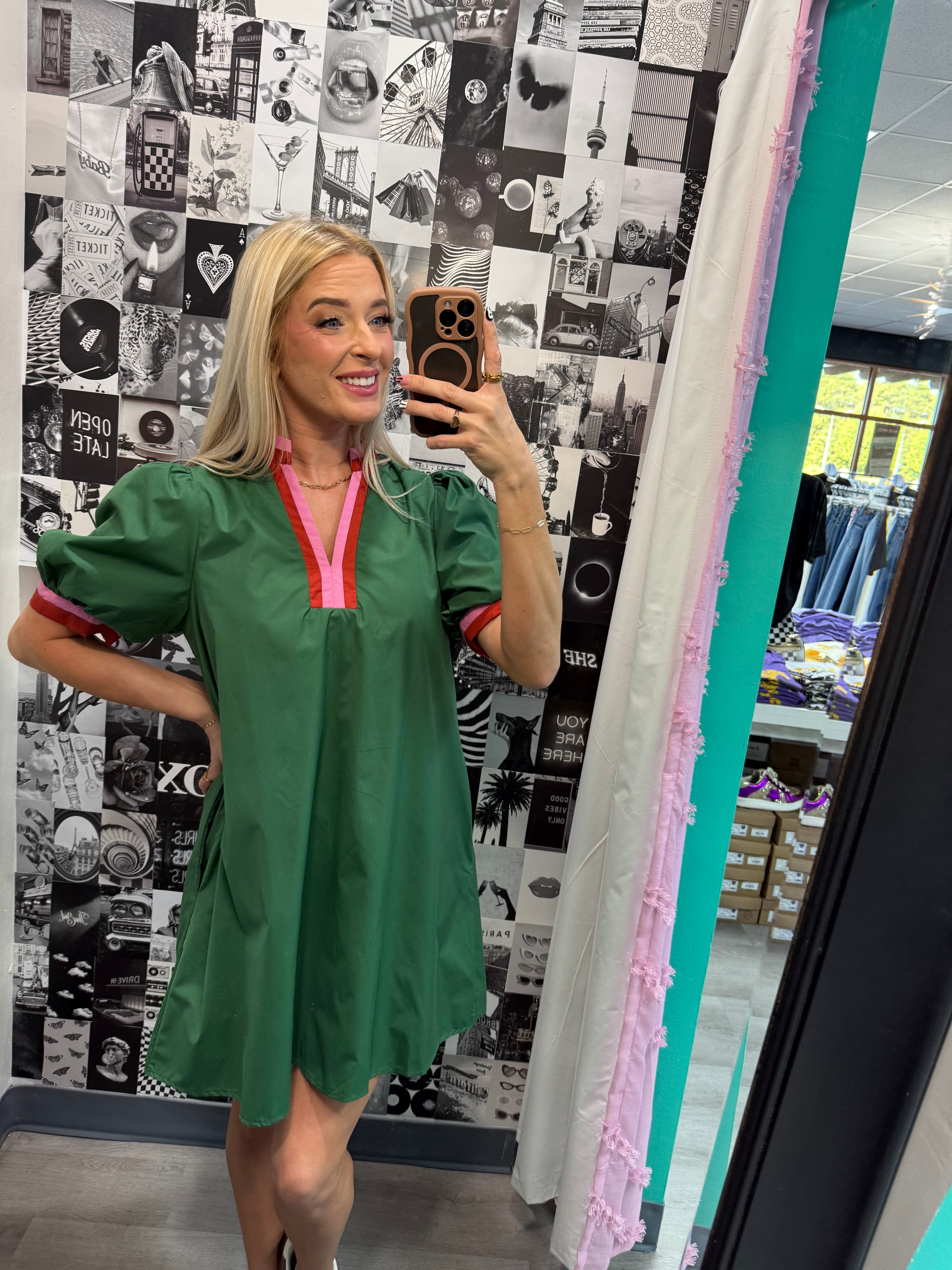 Solid short sleeve pullover mini dress featuring multicolor band accent. Pockets at sides. Lined. Woven. Non-sheer. Lightweight.