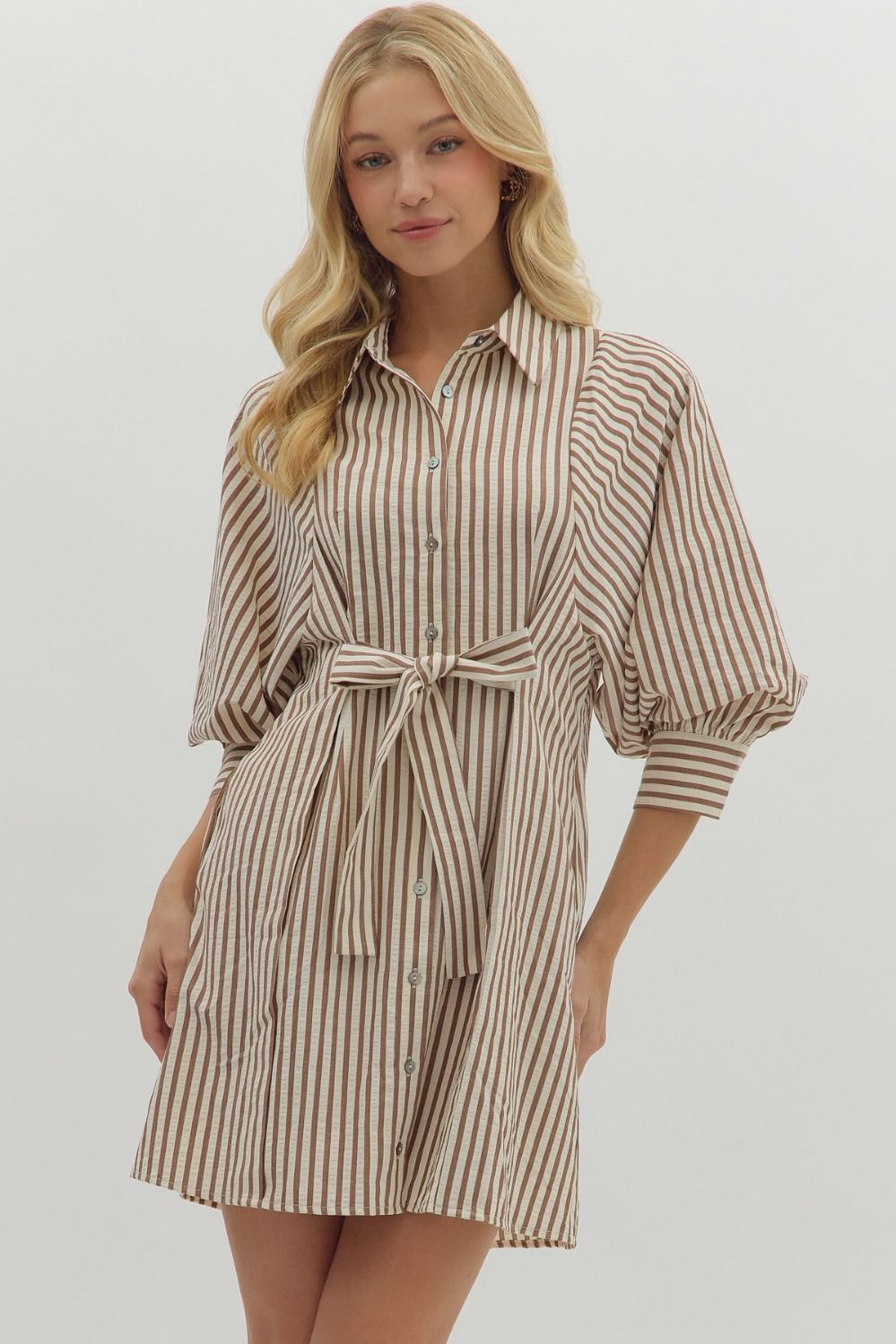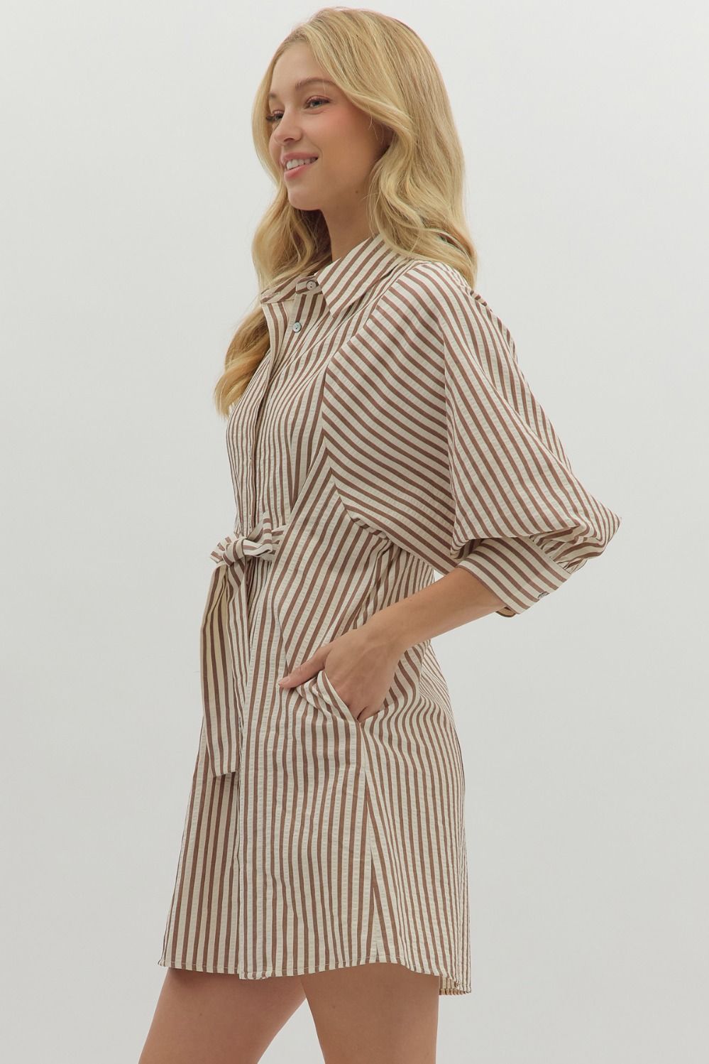 The Lifted Spirits Brown Stripe Dress is a lightweight, woven mini shirt dress designed with 3/4 sleeves and a button front closure for easy wear. It features a self-tie belt to cinch the waist, enhancing your silhouette, while button detailing on the cuffs adds subtle refinement. Practical side pockets and a fully lined, non-sheer fabric provide comfort and coverage, making it an effortless choice for both casual and polished looks.