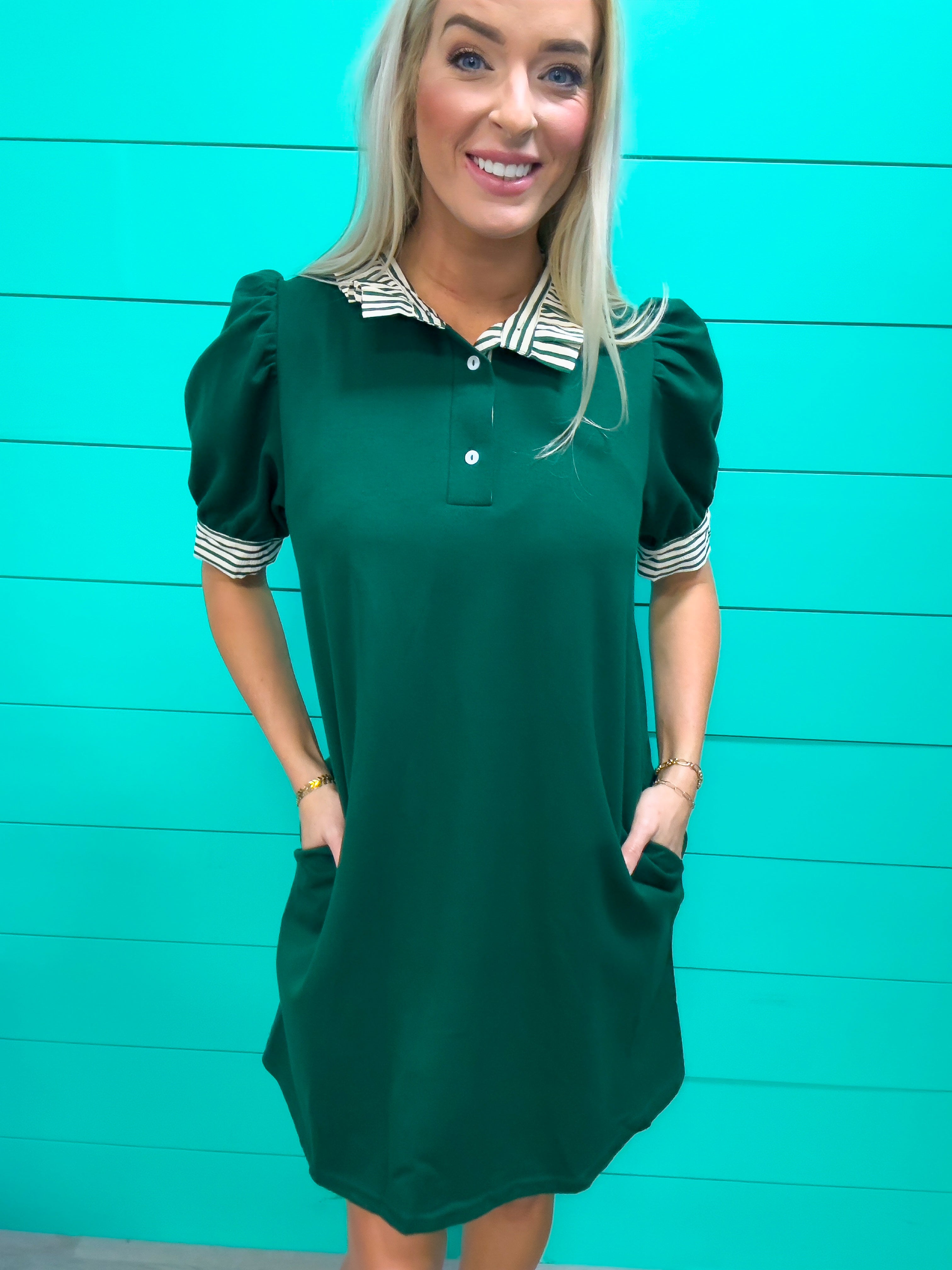 This solid green short-sleeve pullover polo dress combines classic design with modern details. Featuring contrasting ruffle accents on the neck and sleeve bands, it adds subtle elegance. Crafted from a lightweight knit fabric, the dress is non-sheer and unlined, making it ideal for layering in the fall. Practical side pockets enhance functionality without compromising style. Perfect for those seeking a polished yet comfortable look with a refined edge.