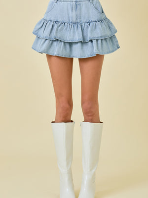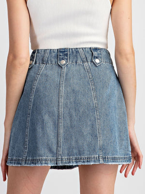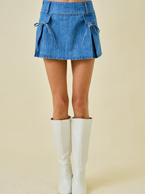 Denim Pleated Mini Skort W/ Pocket Flaps And Ties